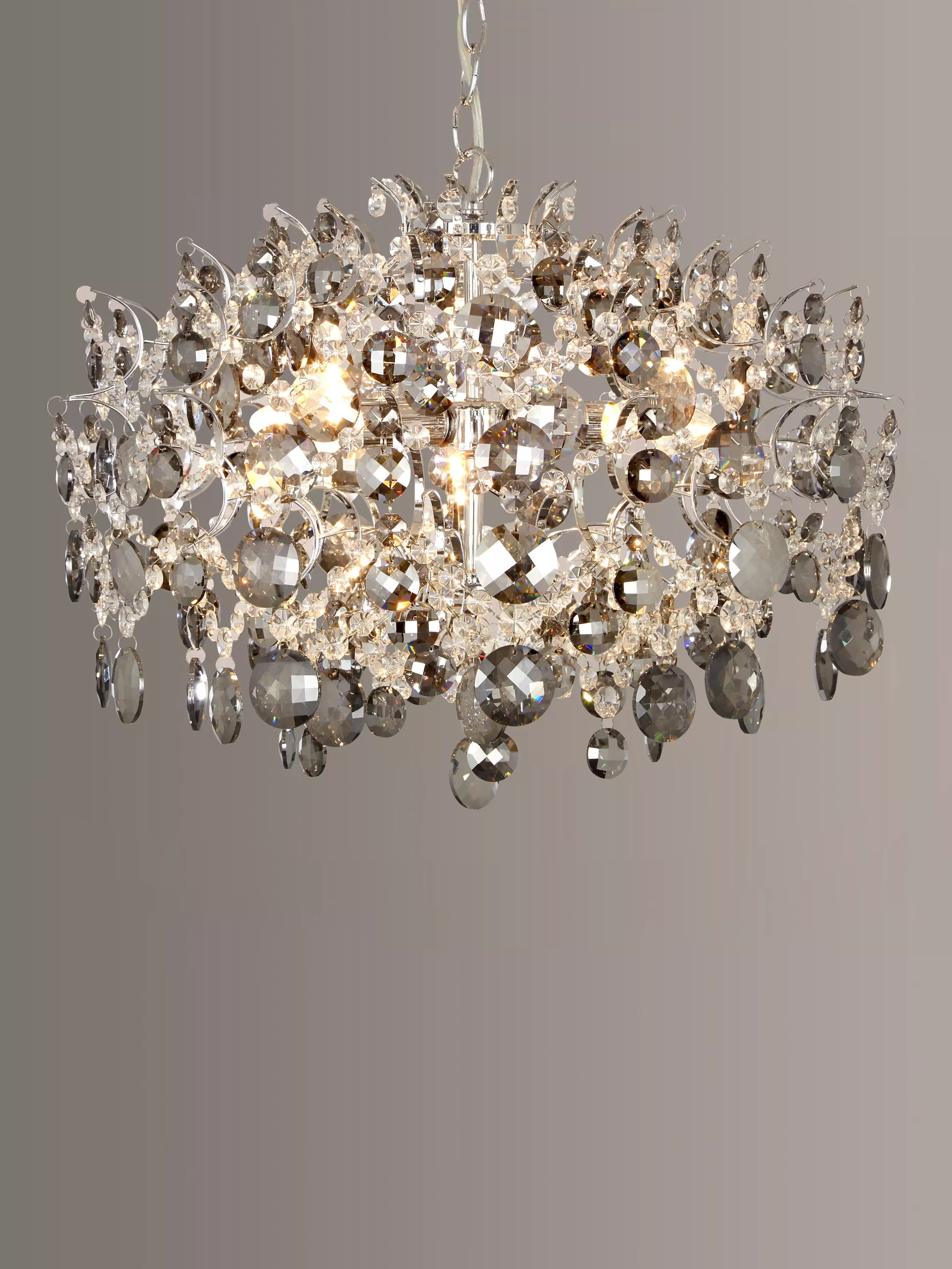 This dazzling crystal pendant features a mixture of smoke and clear glass crystal droppers; perfect for adding a glamorous touch to your home decor.