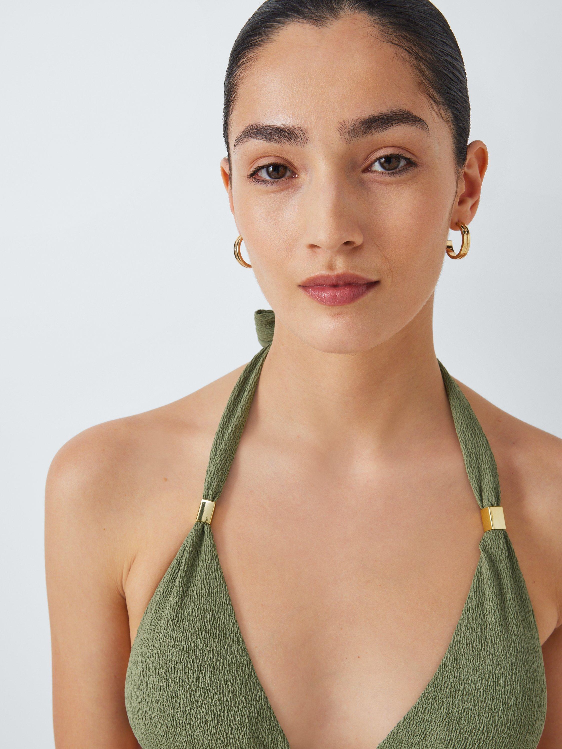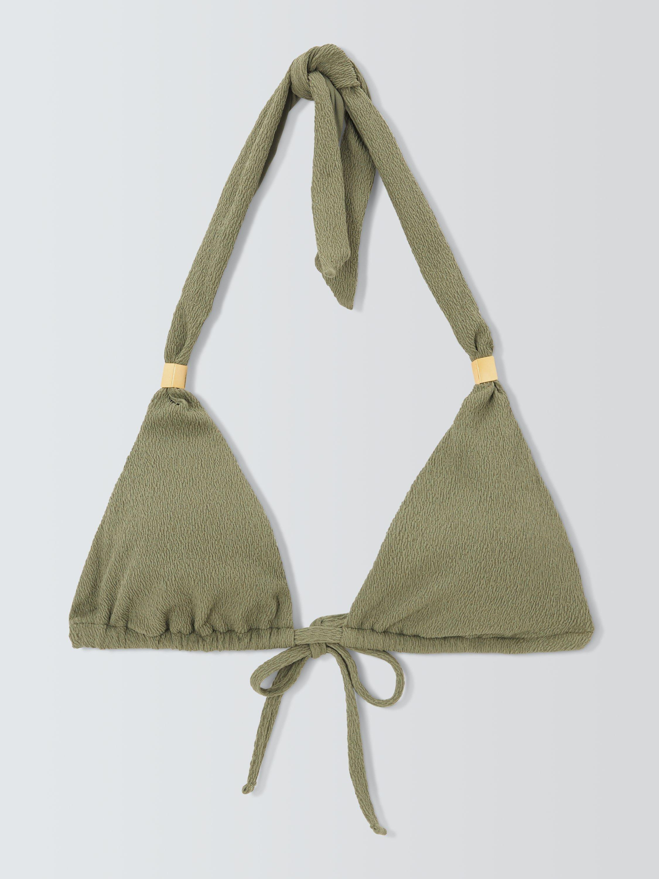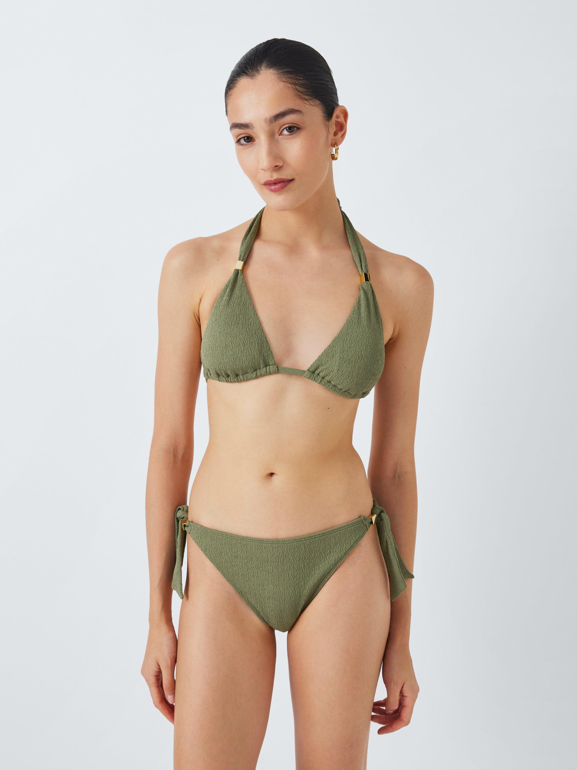 Our Paris swimwear collection showcases textured design. This triangle bikini top has a self-tie halterneck with gold metallic details. Pair with the tie-side bikini bottoms to complete the set.