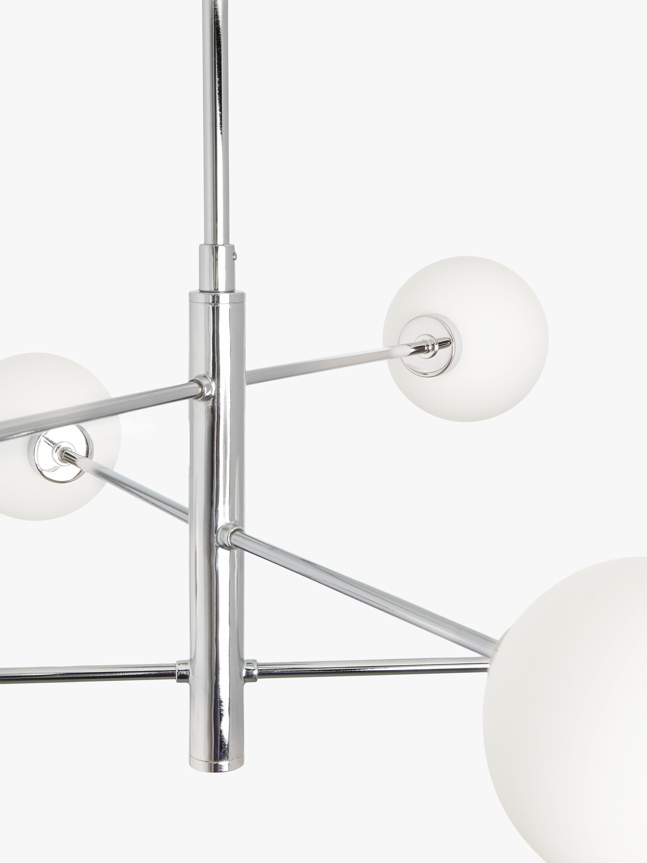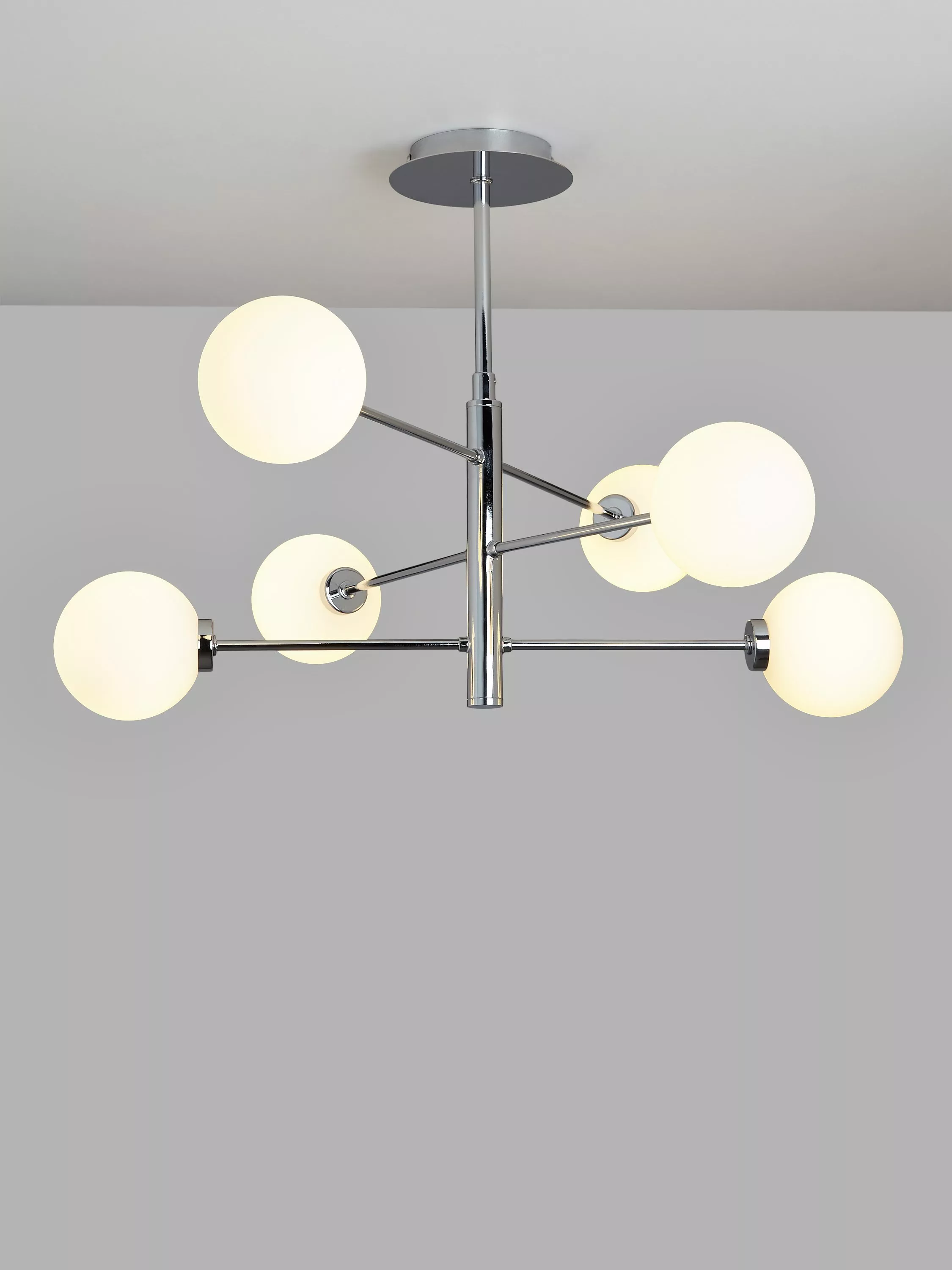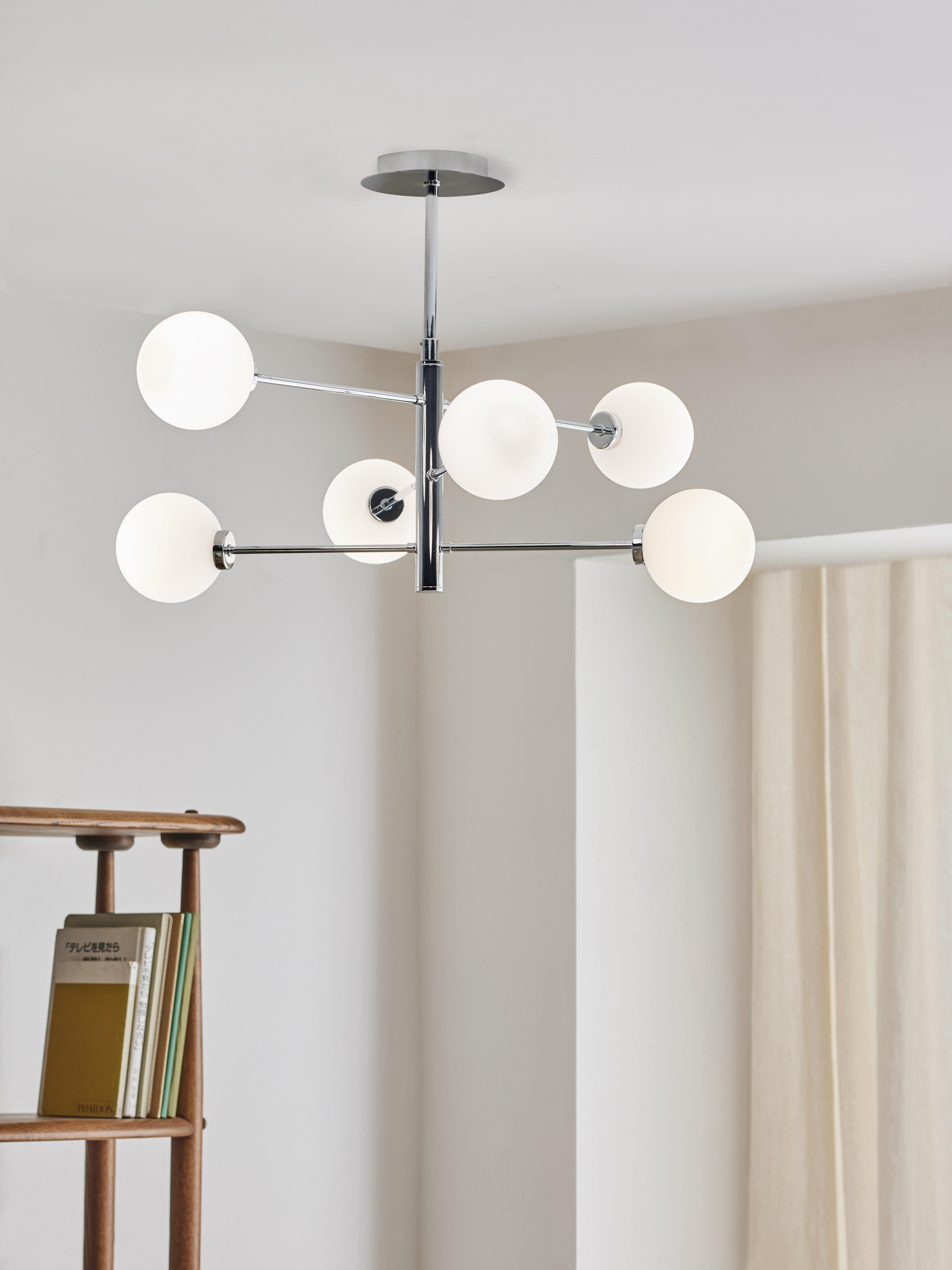 Balanced and bold, our Parity ceiling light houses six glass globe shades. It enhances a diffused and atmospheric wash of light around your space and makes for a statement lighting style in any room.