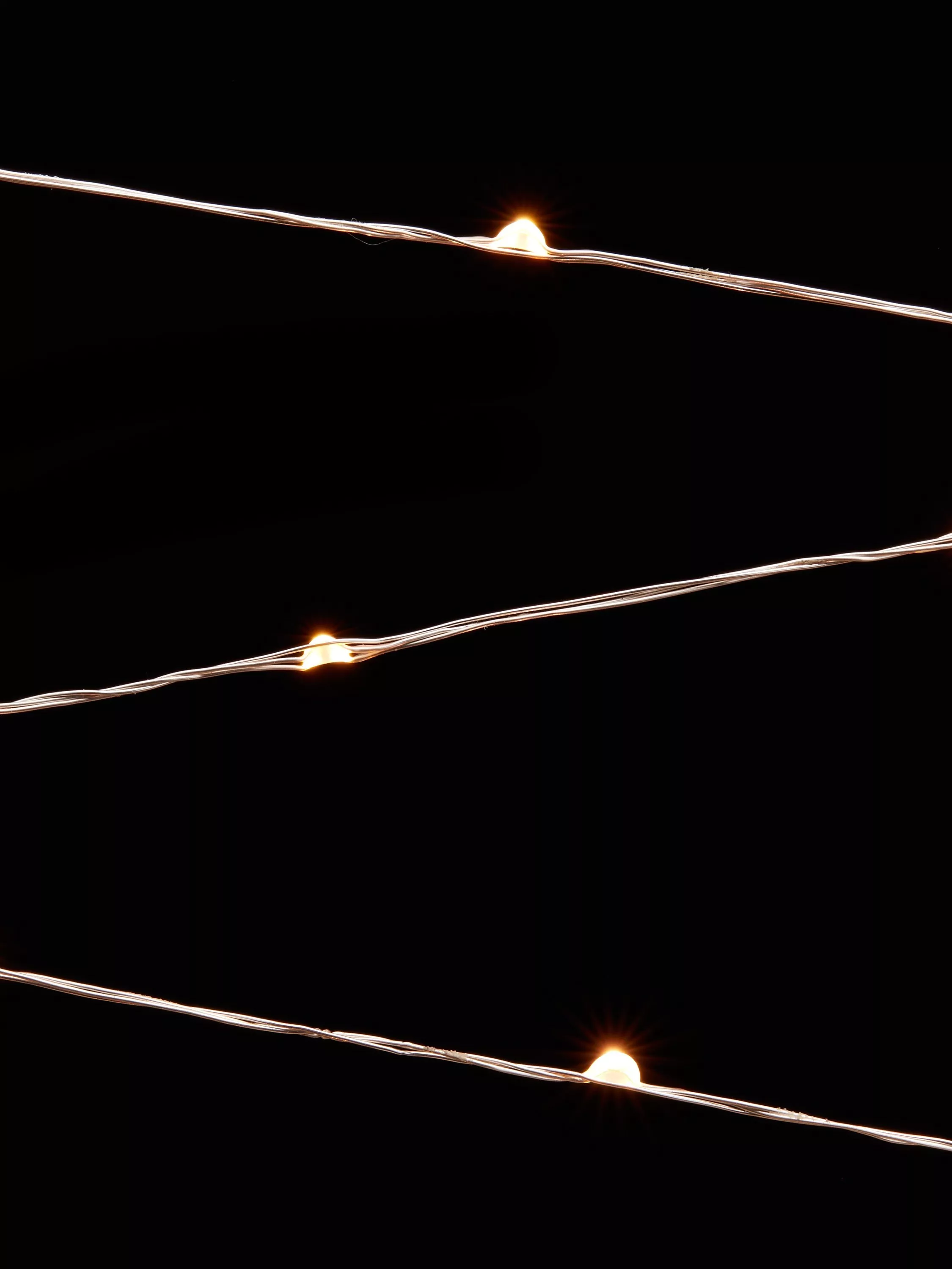 A string of energy efficient LED bulbs on a fine, flexible copper, silver or green wire.