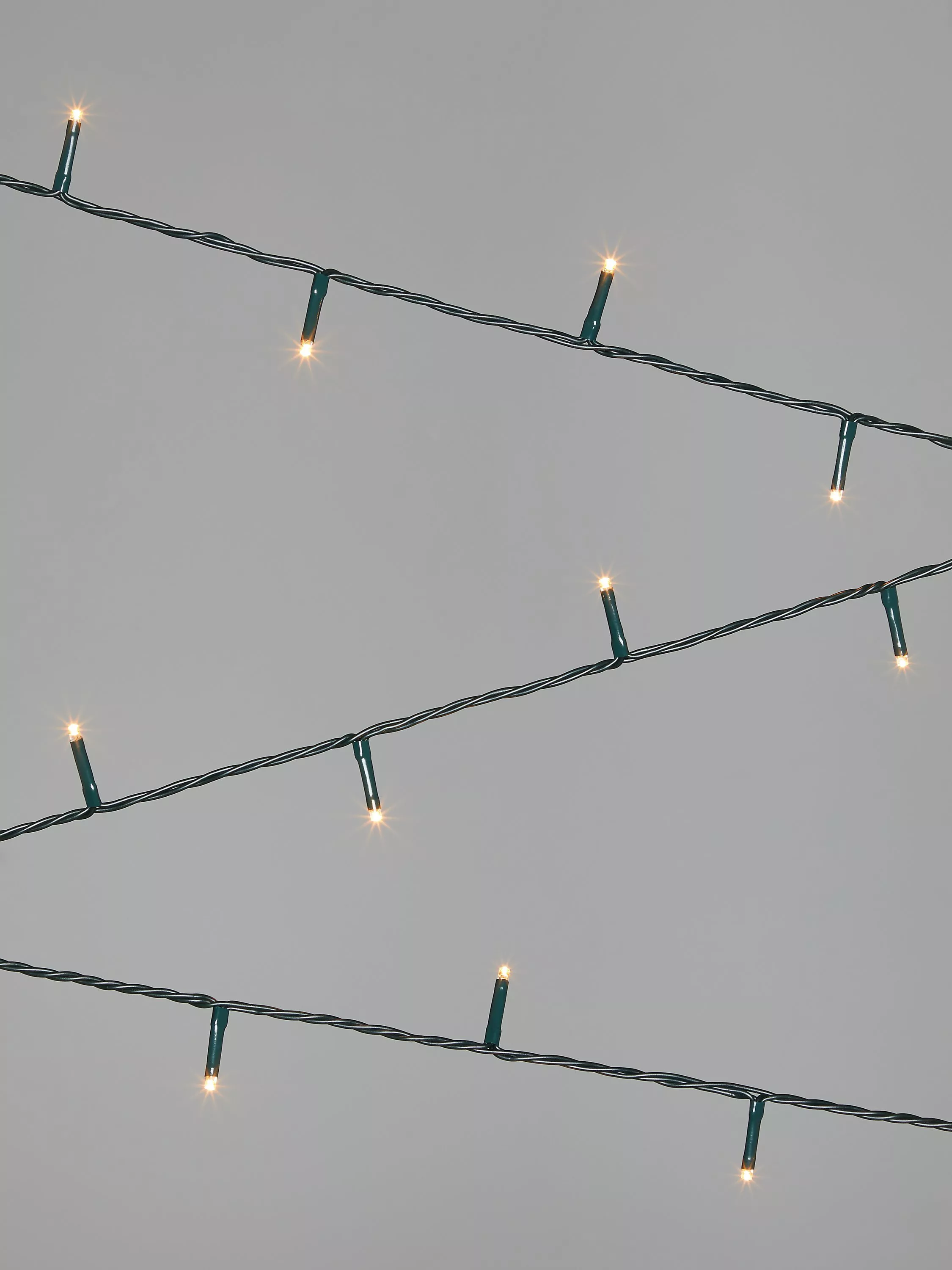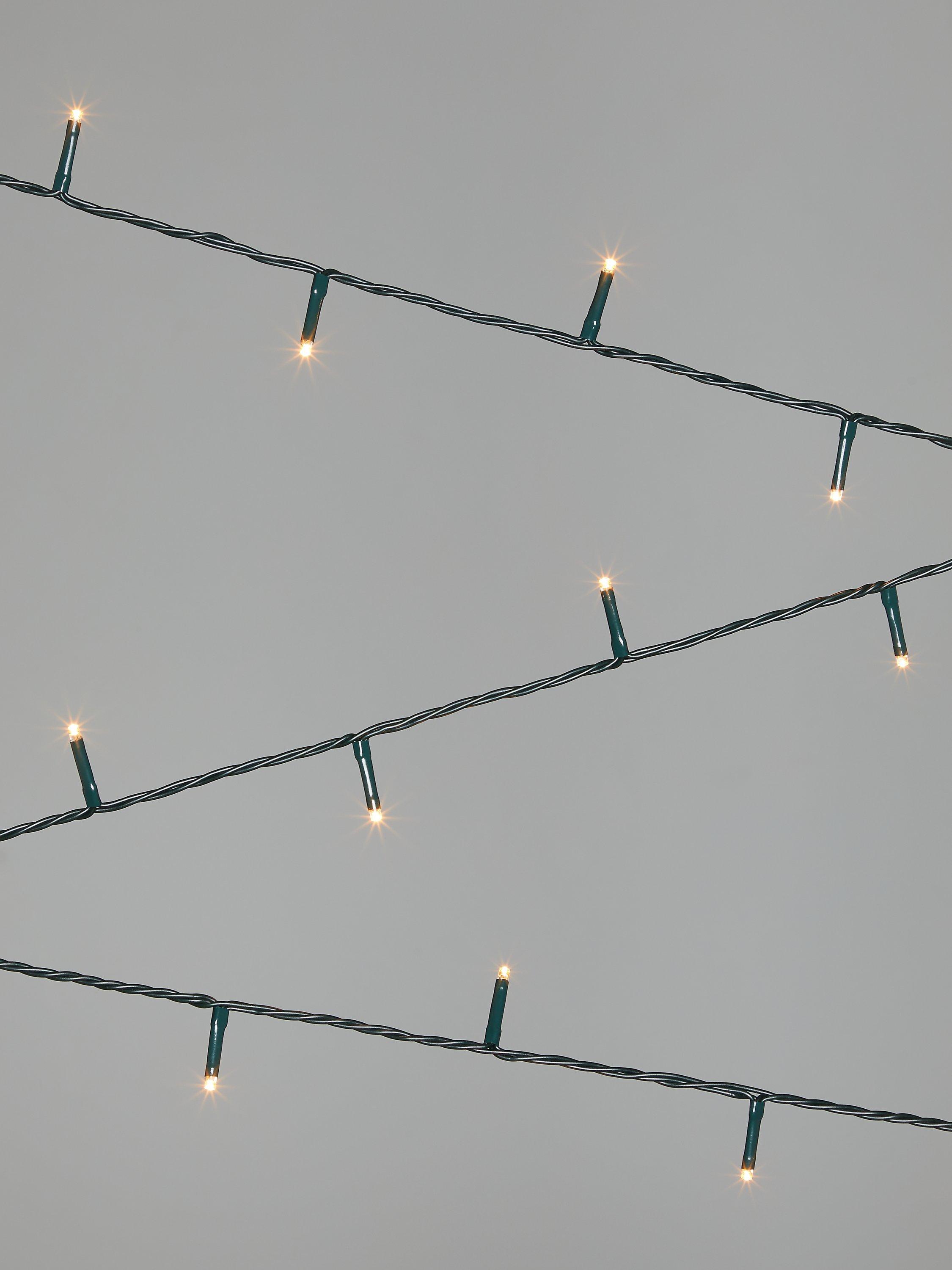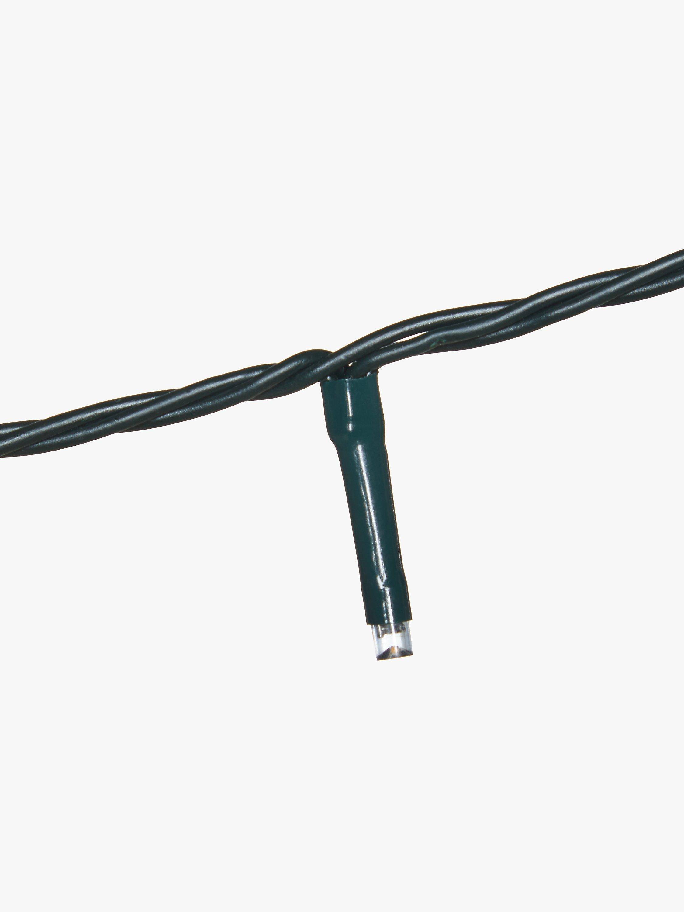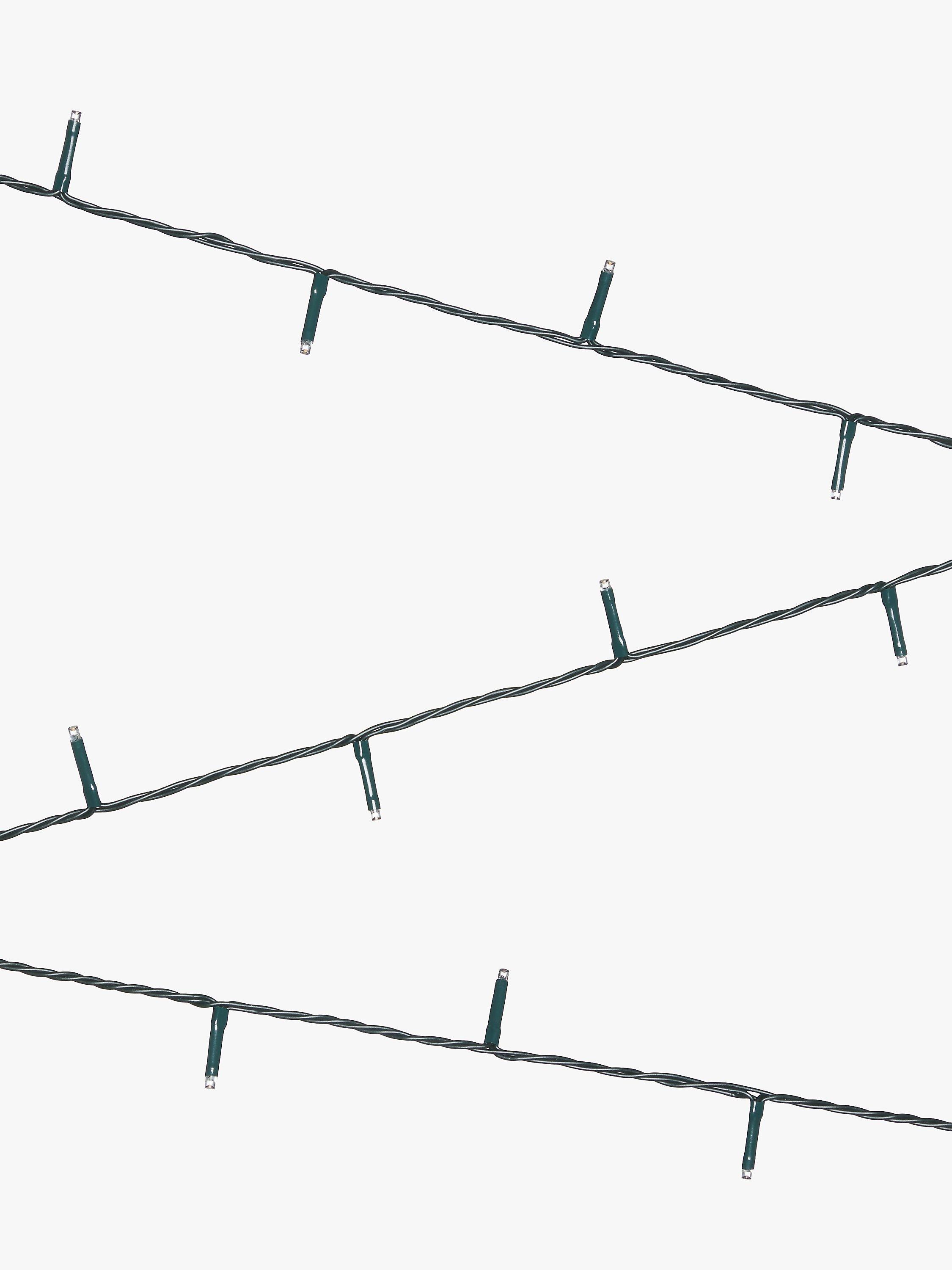 A string of energy efficient LED bulbs on a flexible green wire. These classic lights give off a warm white glow, ideal for any Christmas tree.