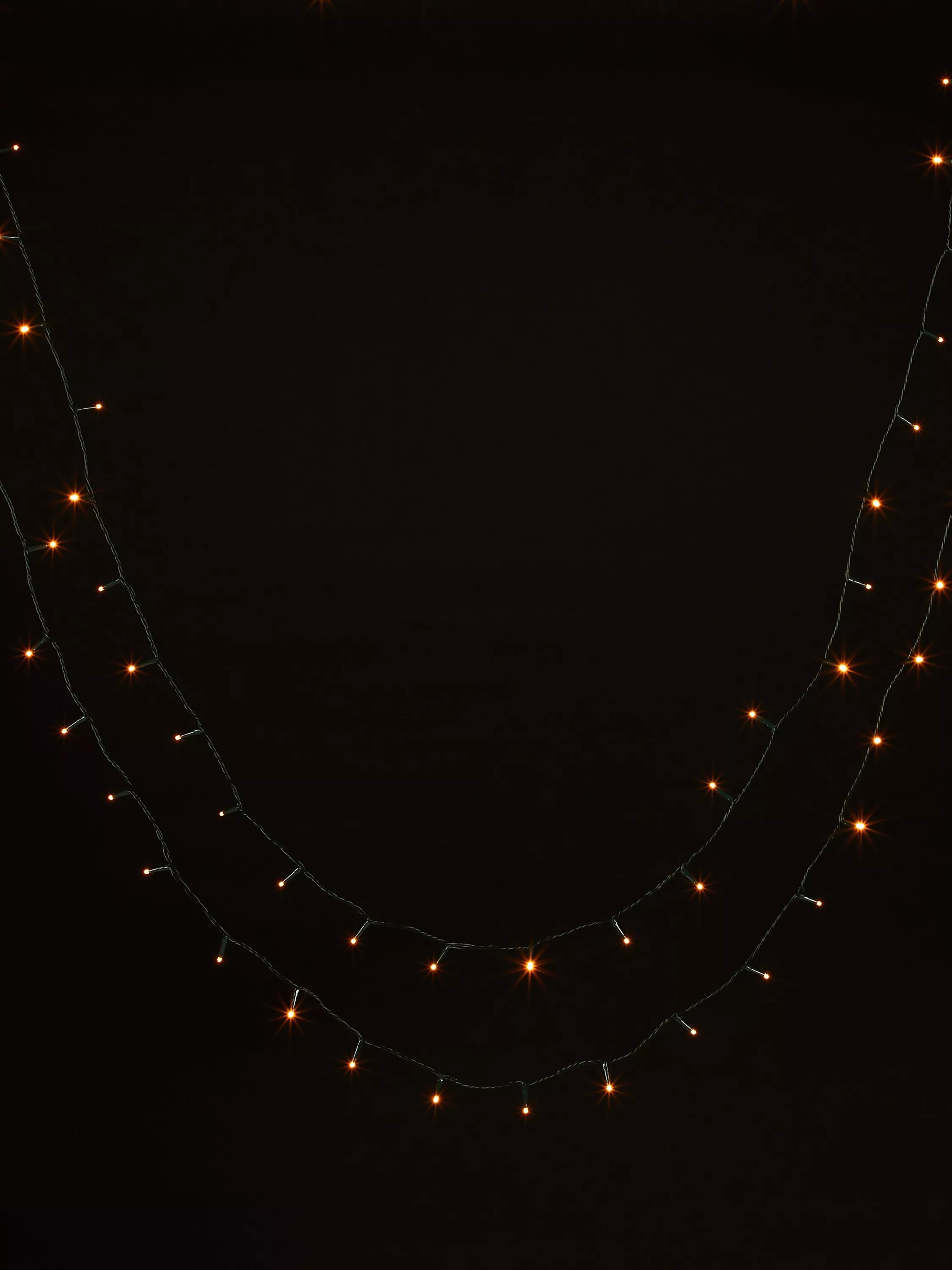 A string of energy efficient LED bulbs on a flexible green wire. These classic lights give off a warm white glow, ideal for any Christmas tree.