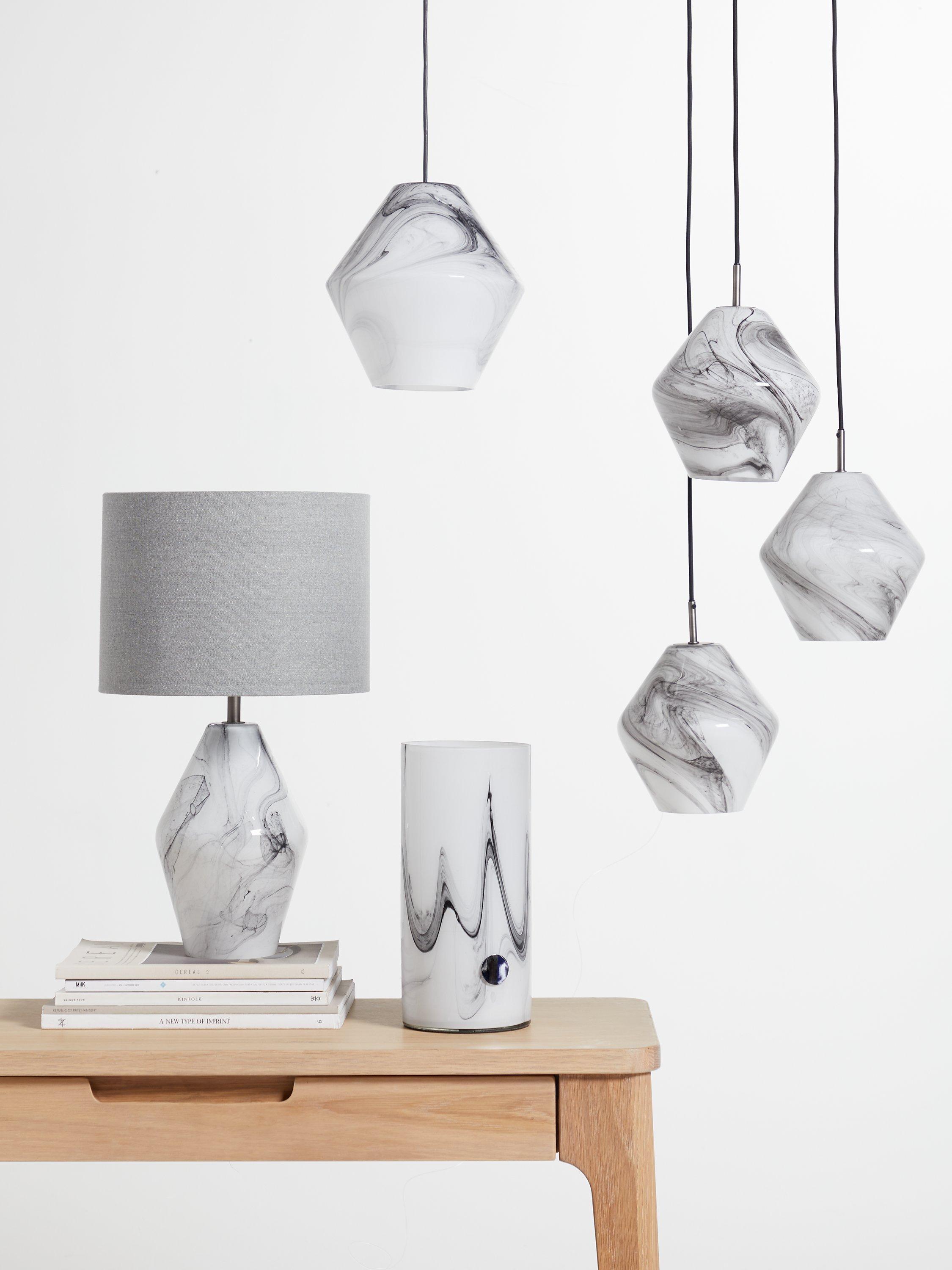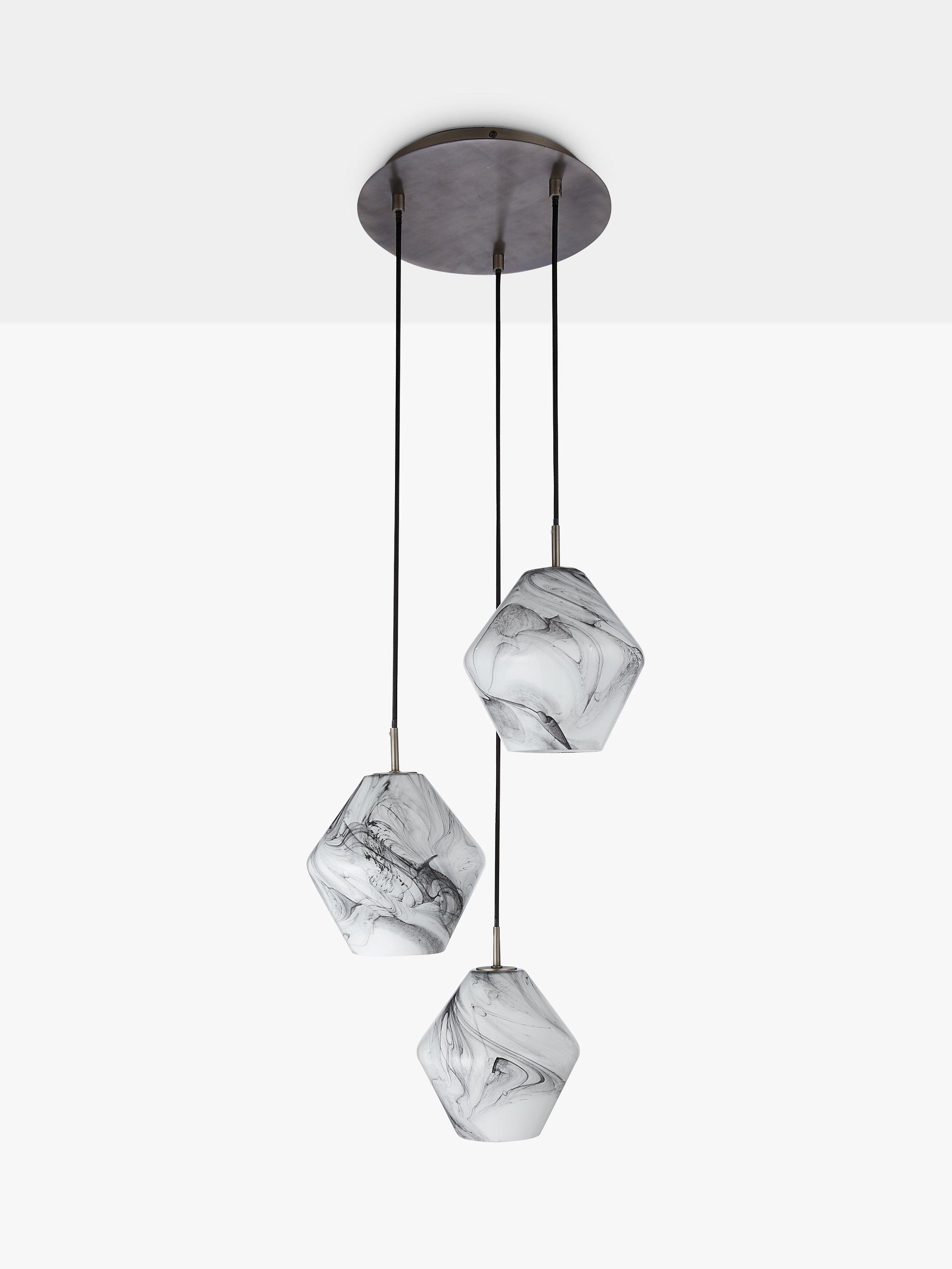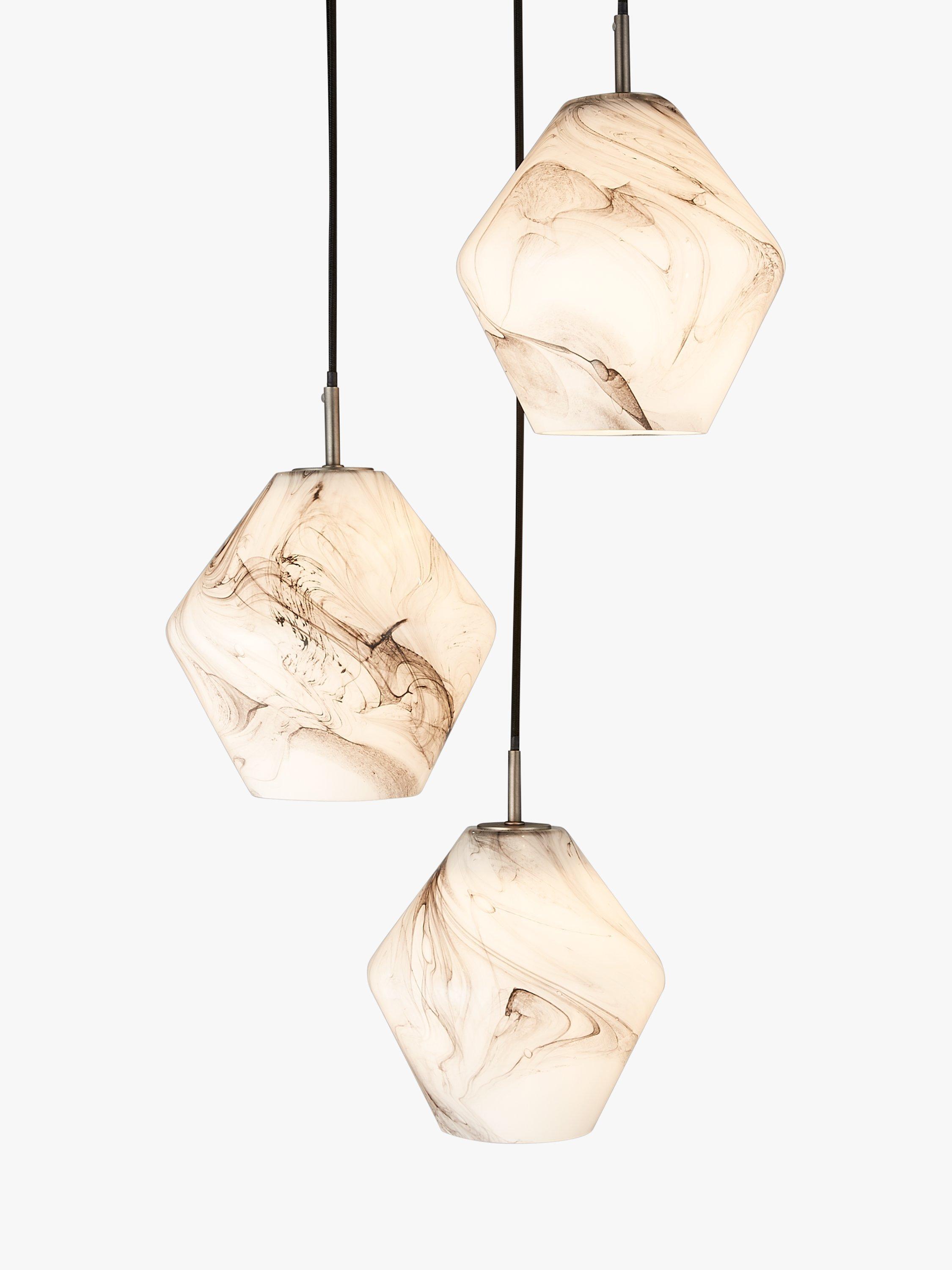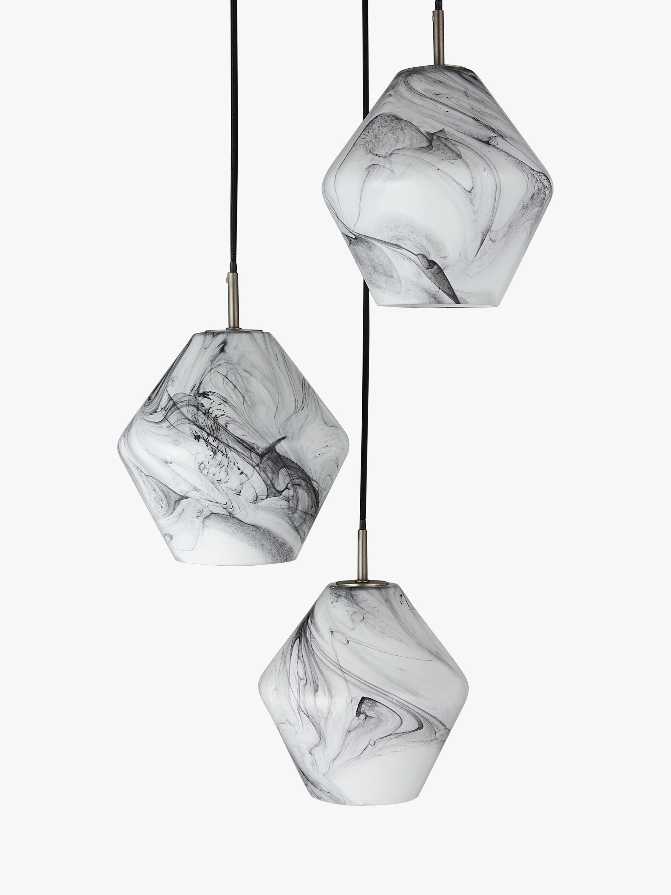 Tactile and contemporary, this cluster of three lights will complement modern settings. Cut to a unique, geometric shape, each pendant is crafted from glass and finished with a monochrome marble effect pattern. Easy to adjust the length for your space, it will suit both bedrooms and living spaces.