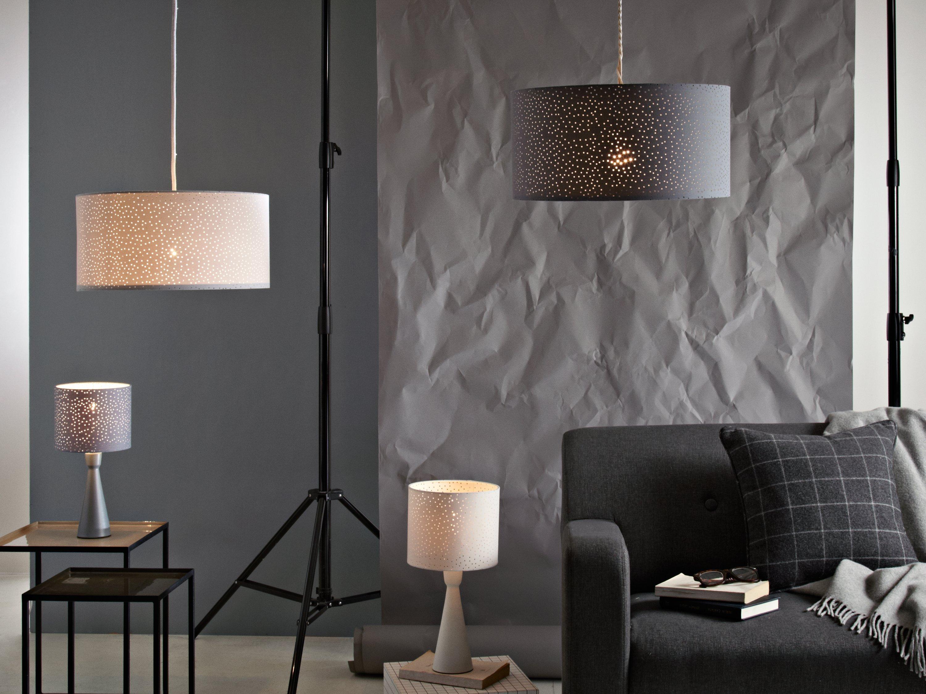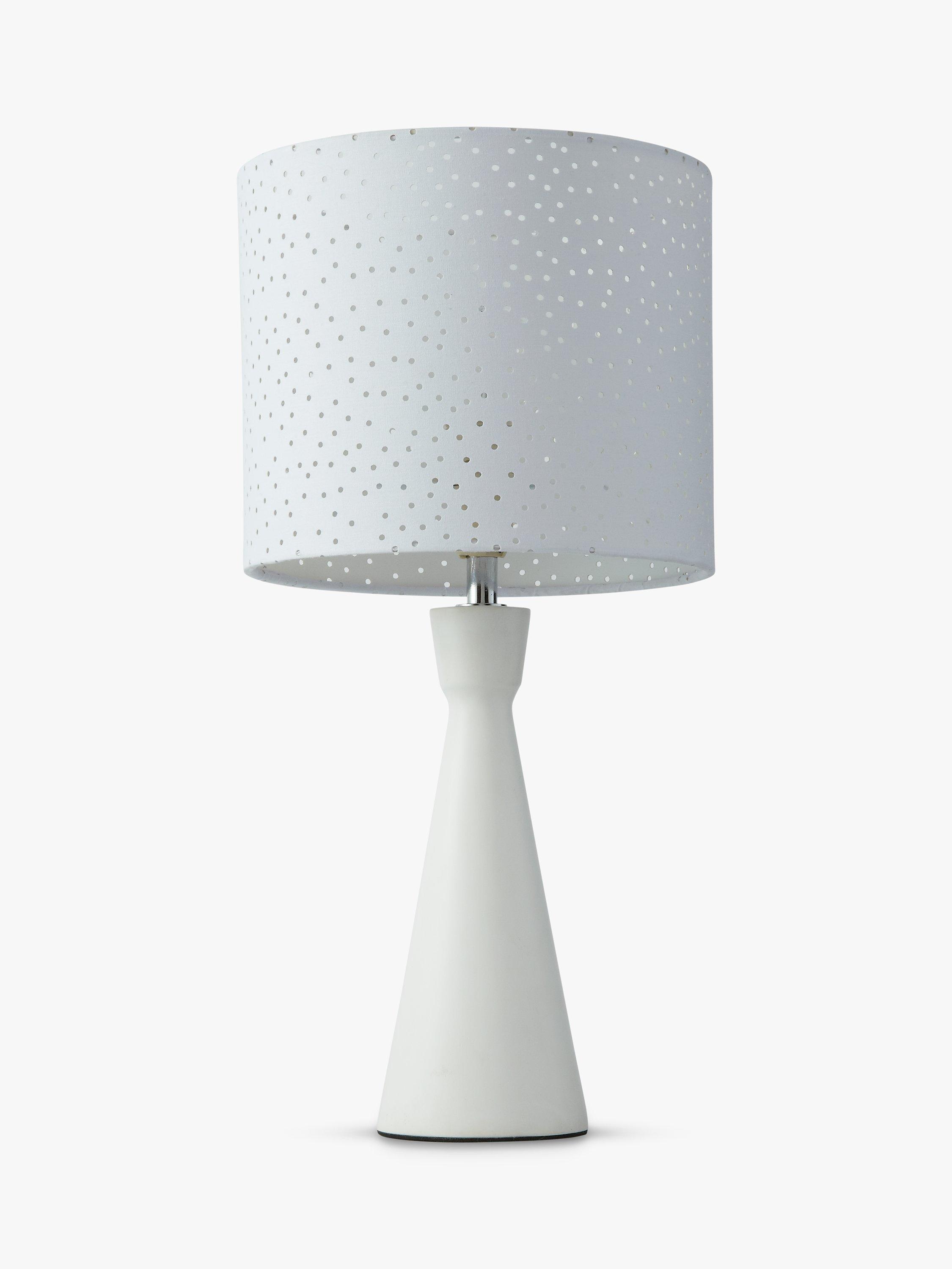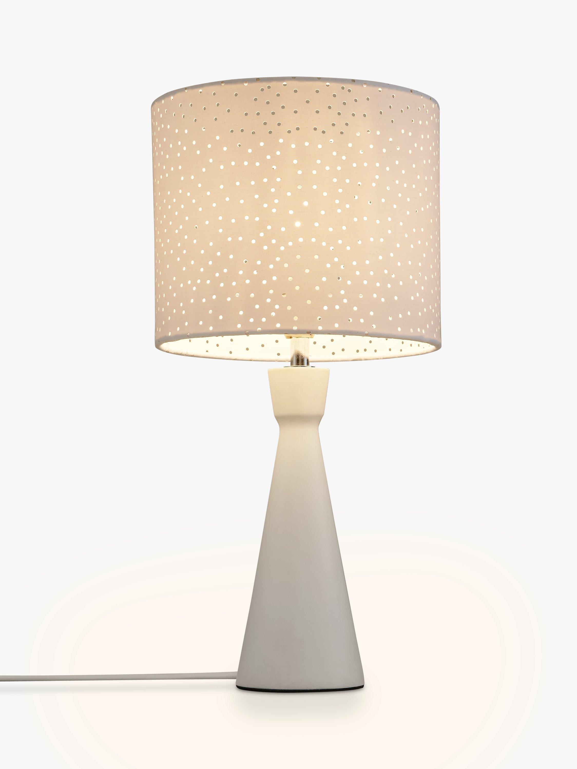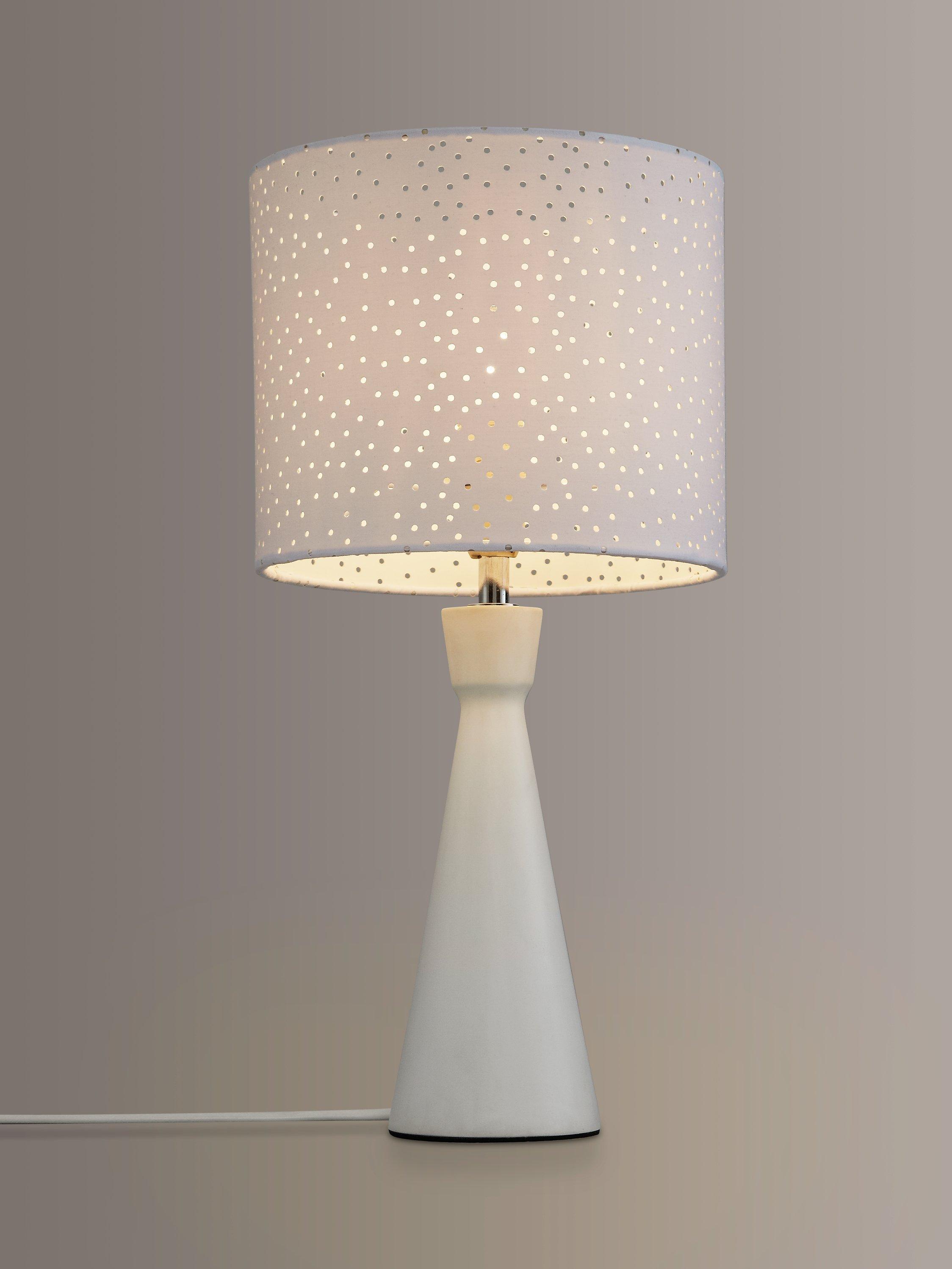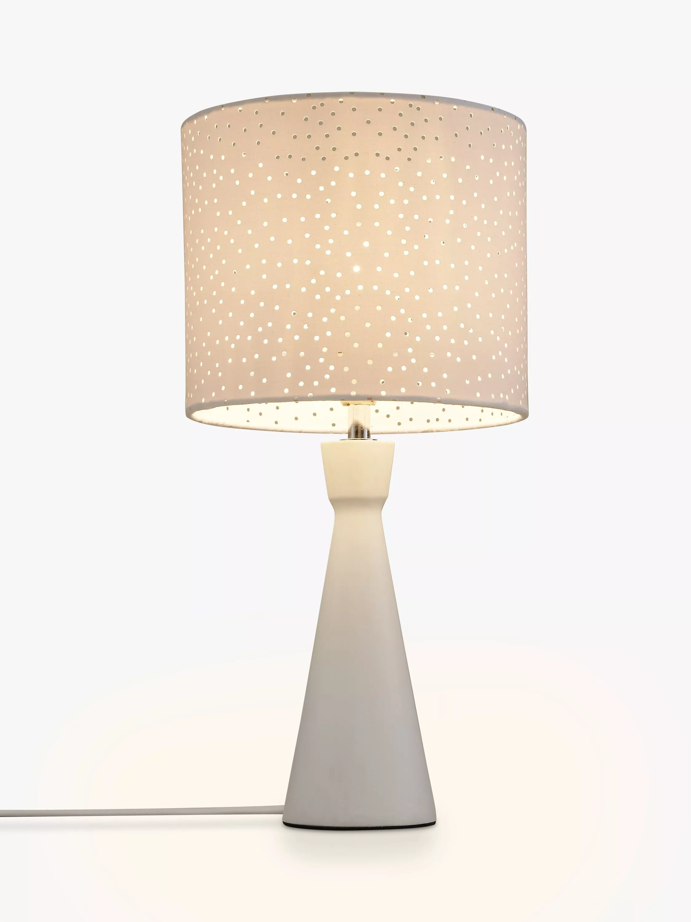 A simply beautiful table lamp, with a triangular base and neutral drum shade. The base has a three stage touch: three levels of intensity and off. The shade is pierced with a scattering of polka dot holes, which, when lit, will be beamed across surrounding walls.