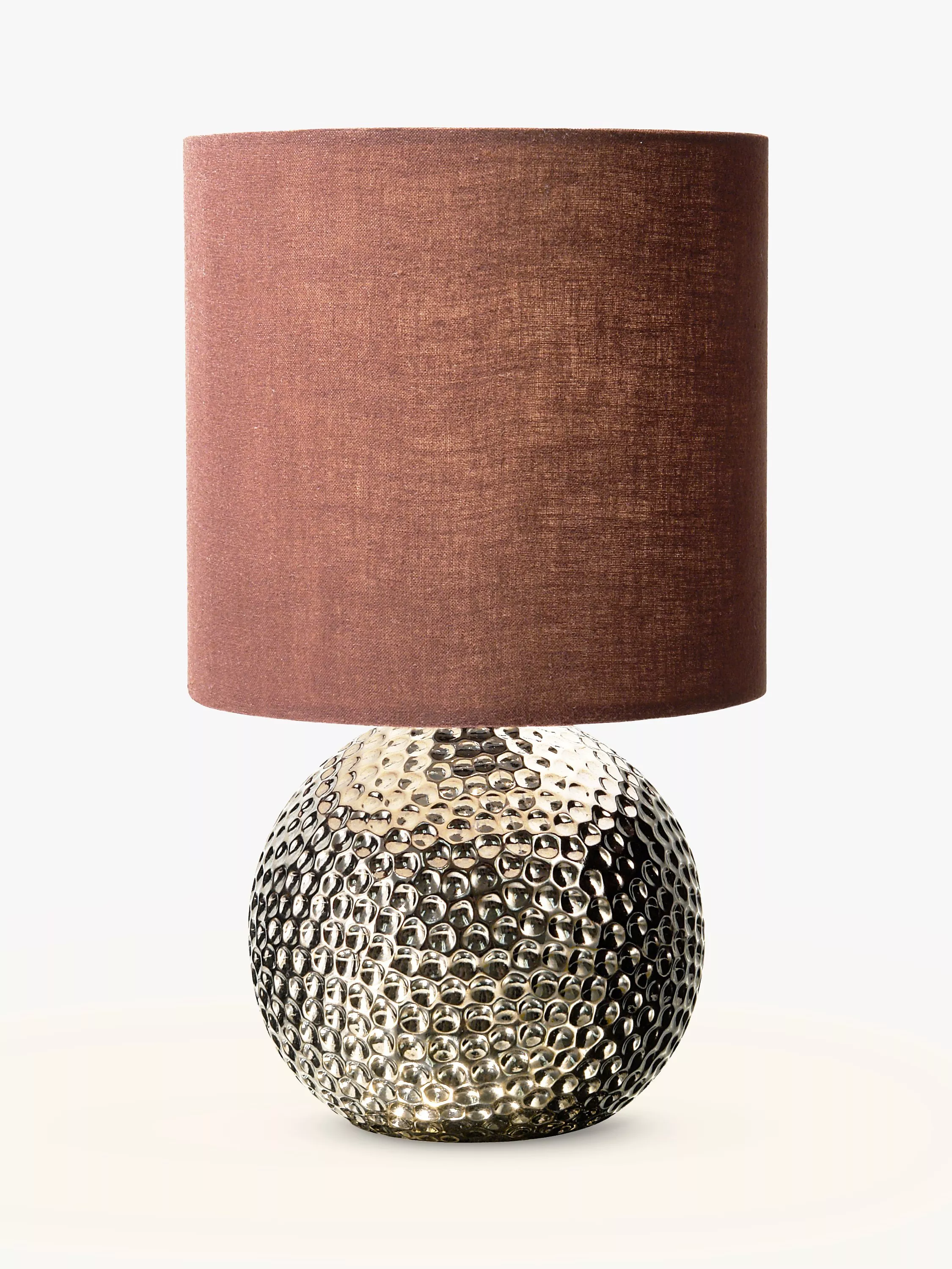 A dimpled, ceramic globe base, with a high-shine bronze finish, is topped with a mocha-coloured fabric cylinder shade.