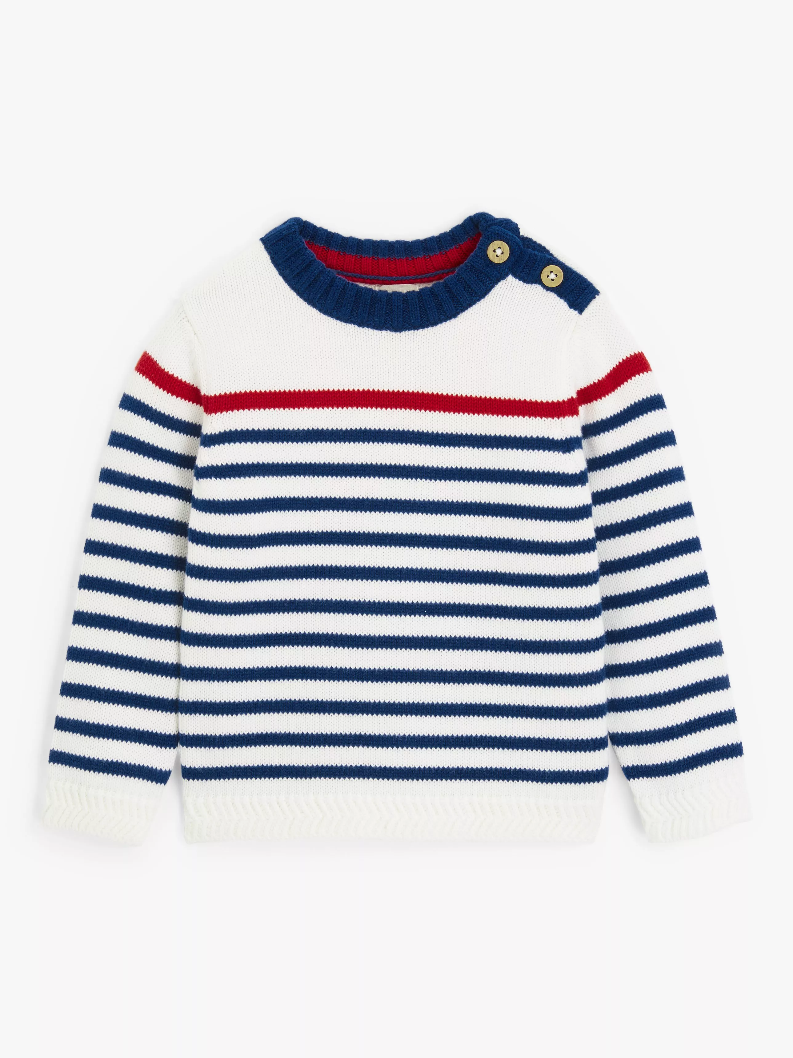 Sailor stripes, contrast trims and wooden-style buttons give this jumper from us adorable Granddad-style, with ribbed cuffs, hem and neckline for a snug fit that's great over jeans.