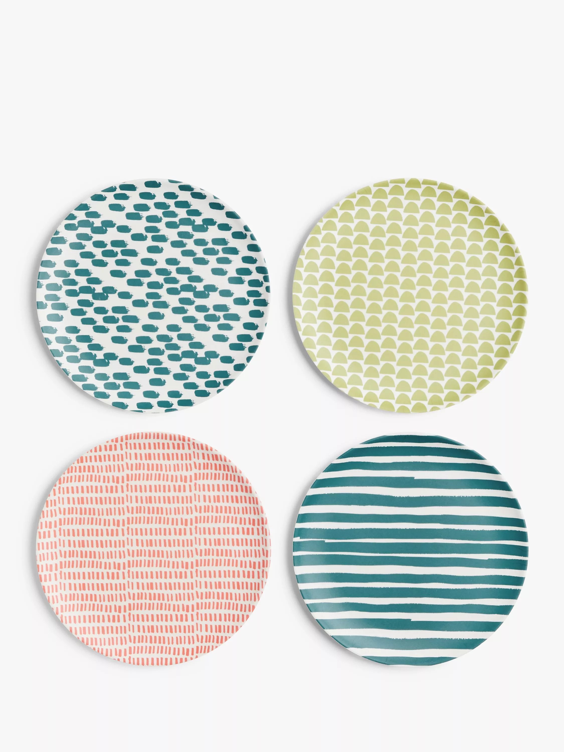 Four colourful and differently patterned side plates made from a combination of bamboo fibre, corn powder and resin. They're hardwearing and ideal for parties, picnics and outdoor or casual dining. They're also dishwasher and freezer safe.