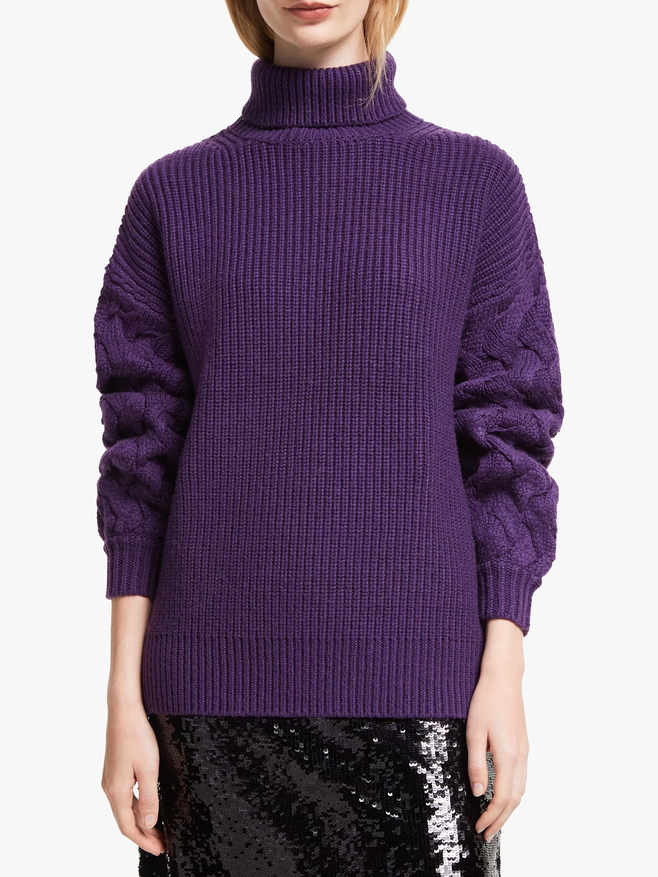 Every wardrobe needs a chunky jumper, and we designed ours with a statement modern cable design wrapping around the sleeve with a ribbed cuff that creates a blouson shape. The dropped sleeve gives it a relaxed fit, while the chunky rib stitch on the body through to the funnel neck adds texture. Super comfortable and cosy, wear it with skirts, trousers or denim for a style that suits you.