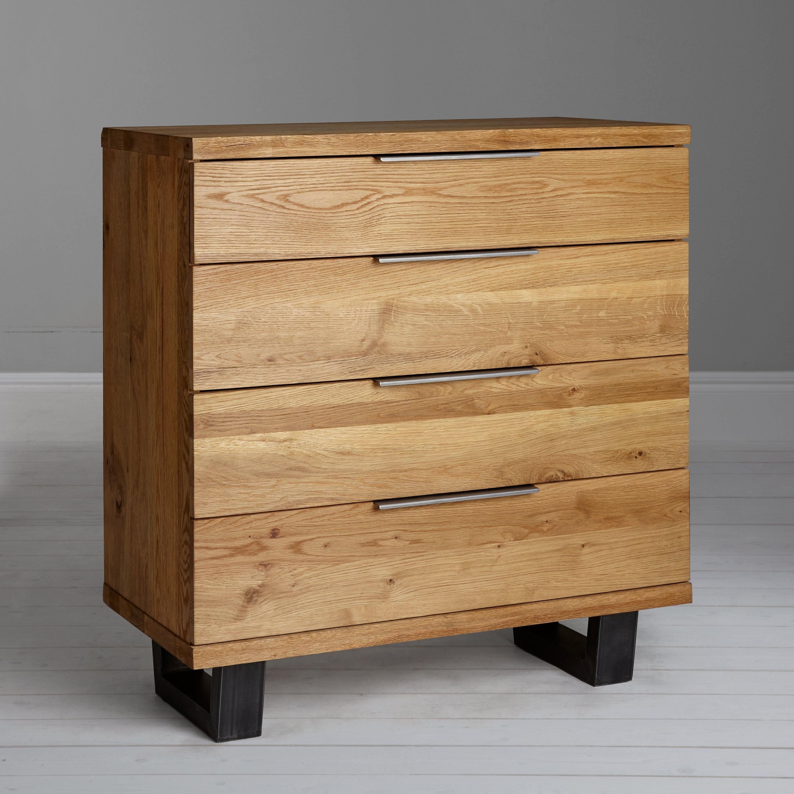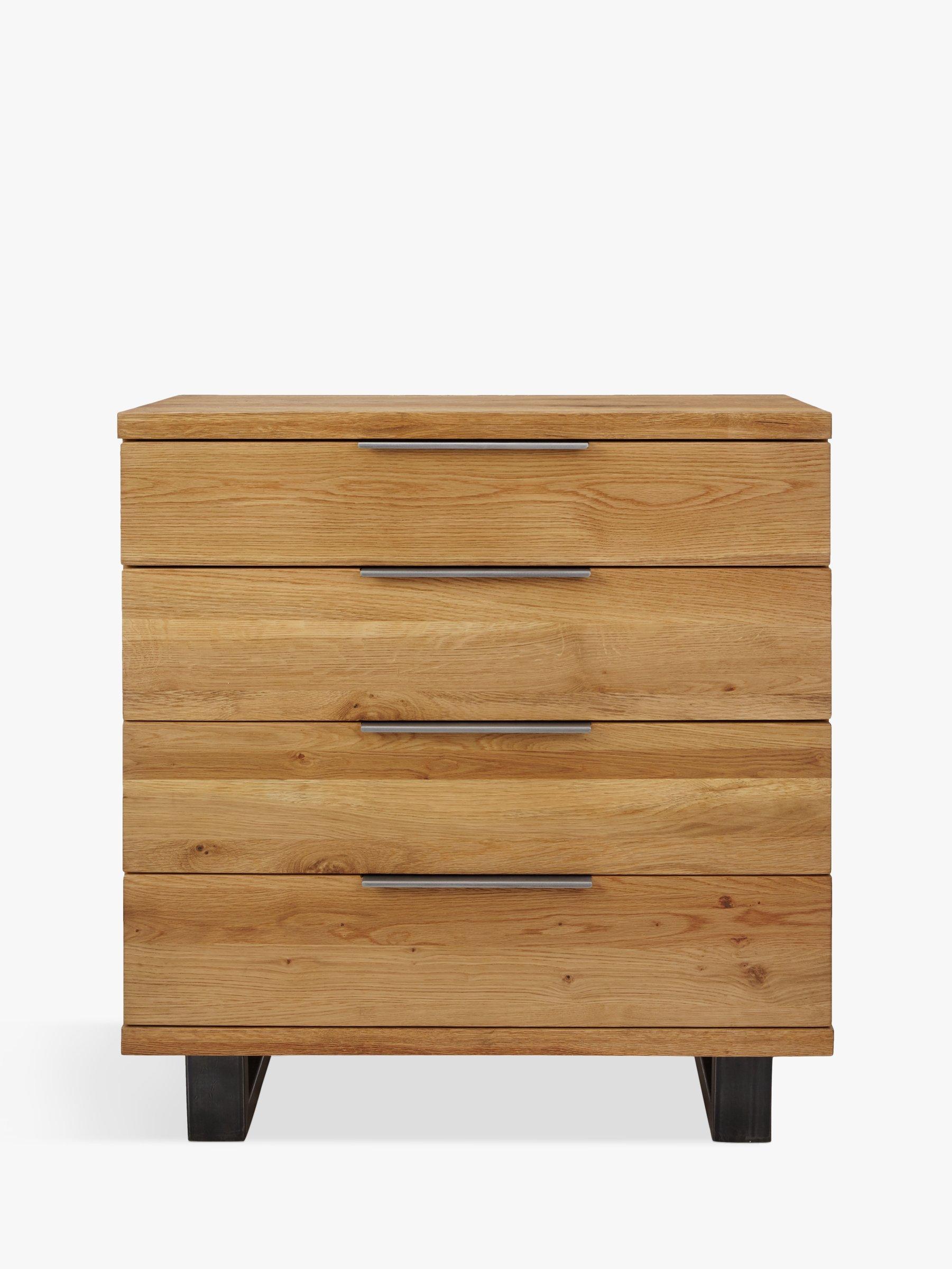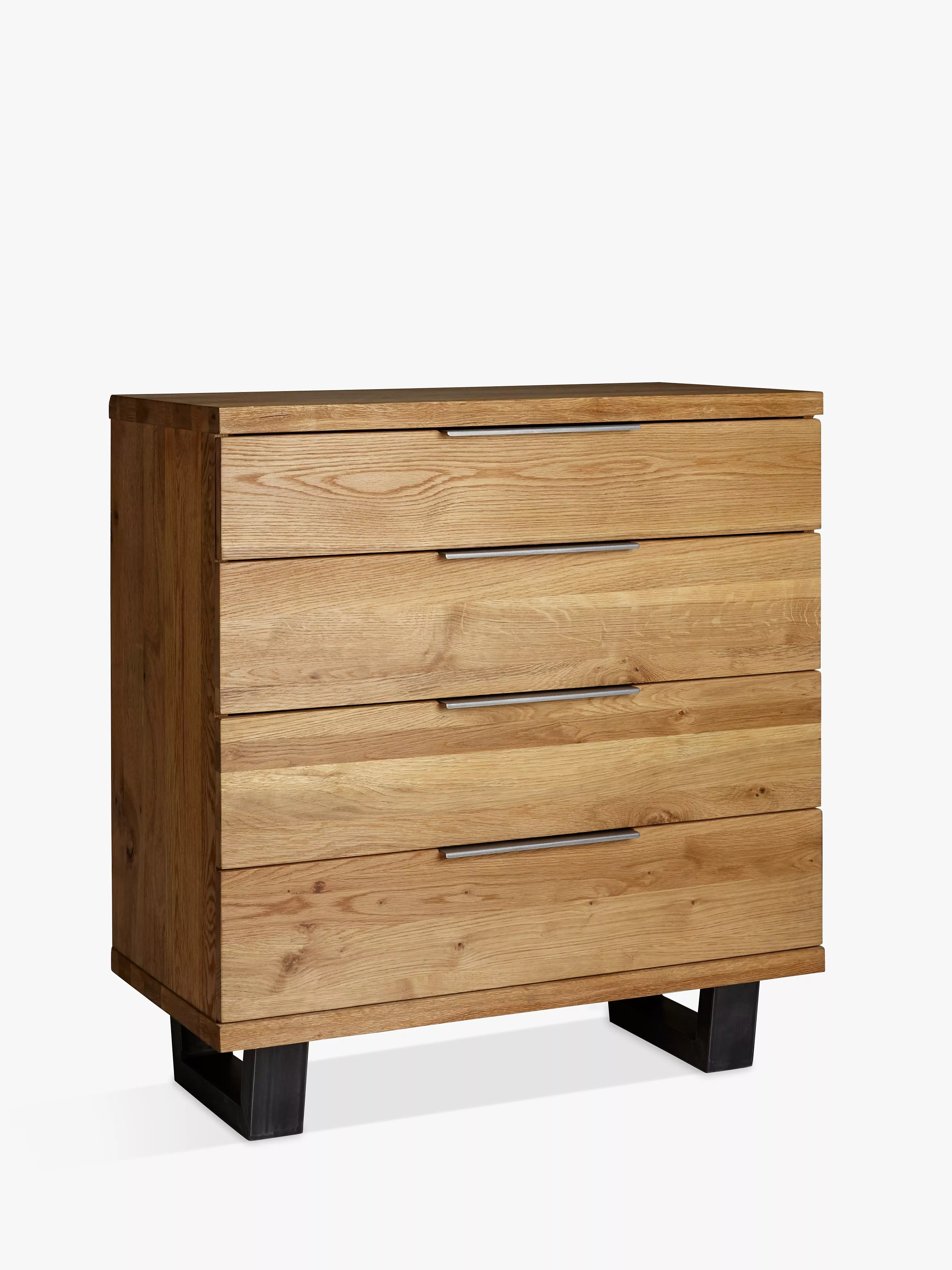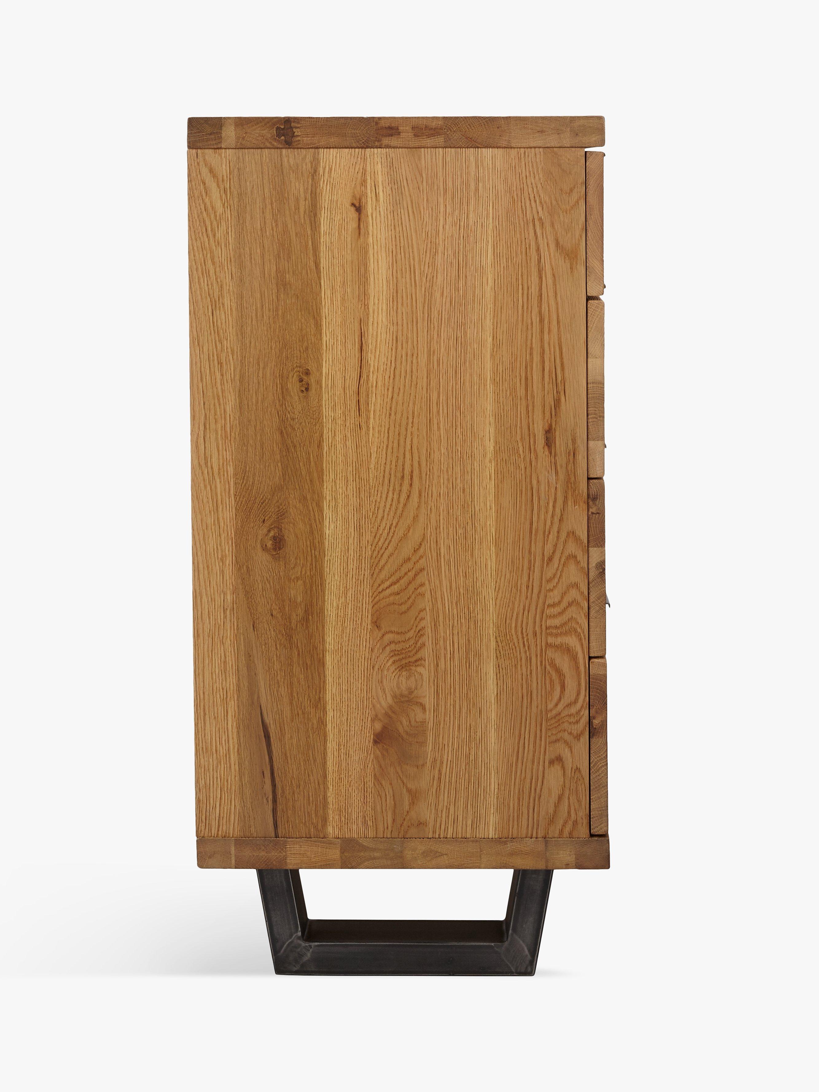 This industrial-inspired chest offers ample storage space thanks to its four drawers that open on wooden runners. Functional in design, its iron handles and base are finished in a durable lacquer and offer a contrast against the warm tones of the oak.