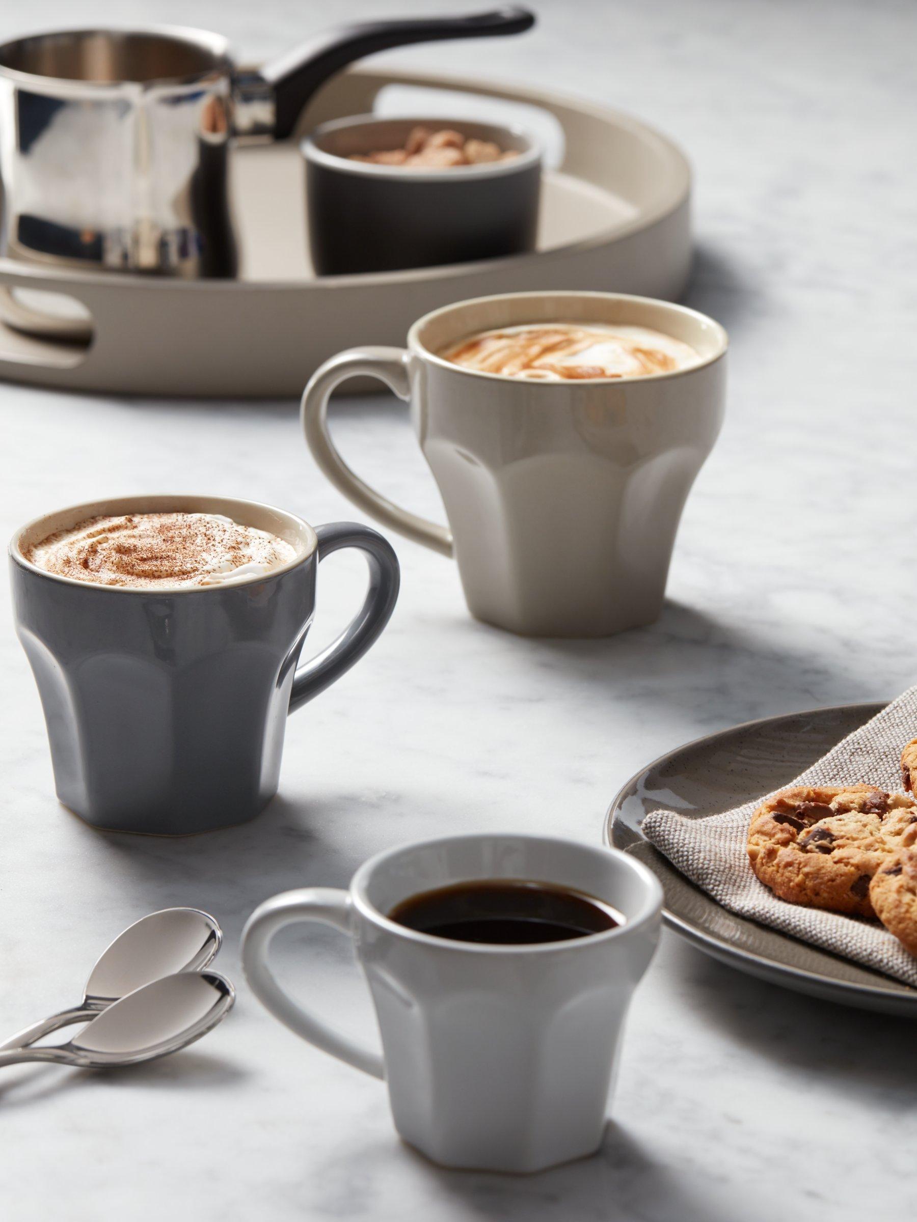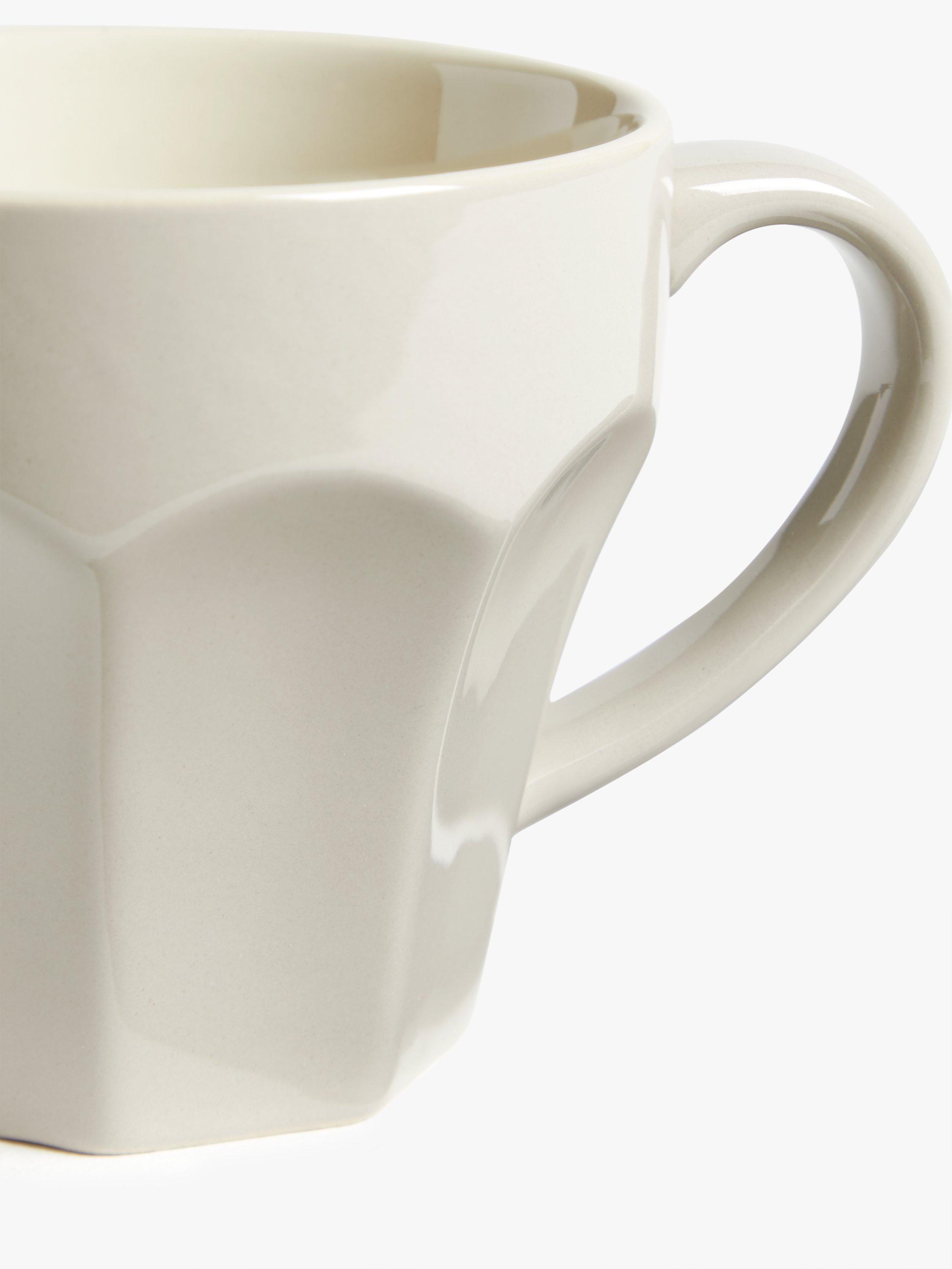 A classic latte mug with a sculpted exterior. Made of stoneware, it's both dishwasher and microwave safe.
