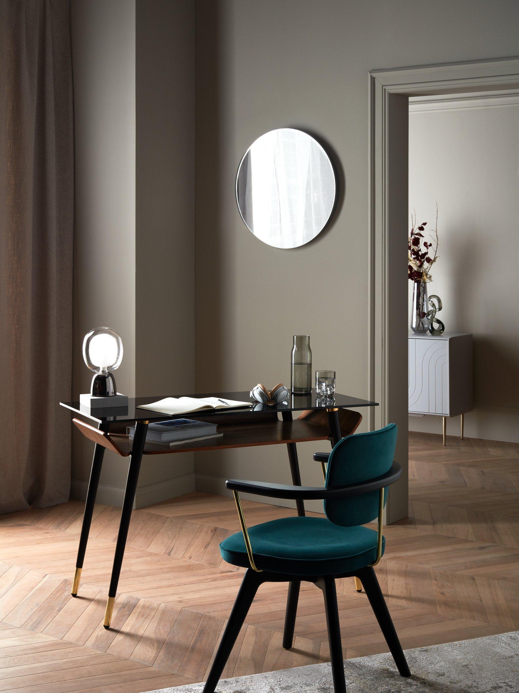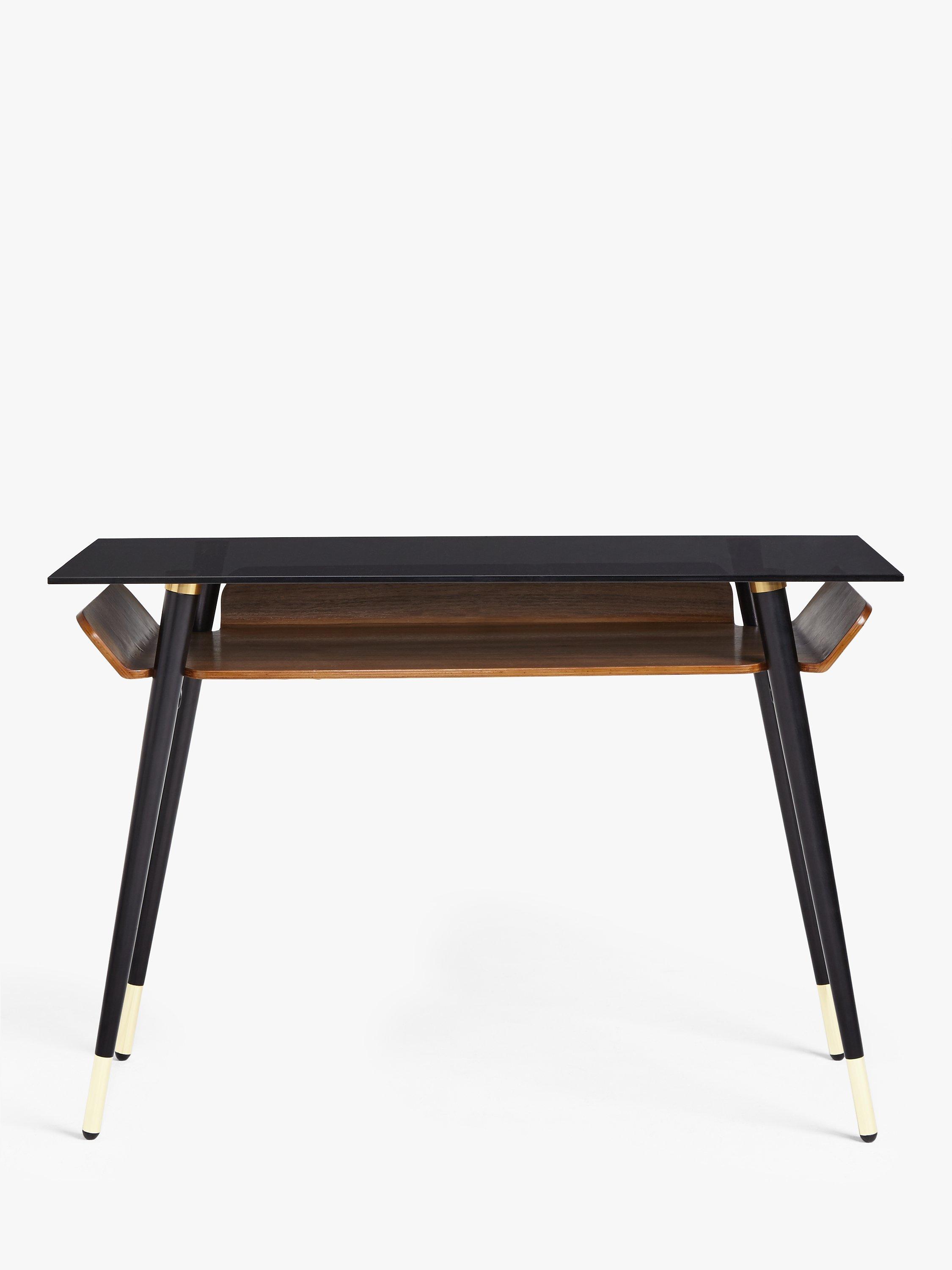 The modern design of our Contour desk will give your home office a sophisticated edge. Designed with a smoked glass surface top that's complemented by a wooden open storage section below, it offers a contemporary way of organising your work documents. Supported by splayed metal legs and accents of polished brass-finished hardware, this desk provides a minimalist, yet functional space for work-from-home days.