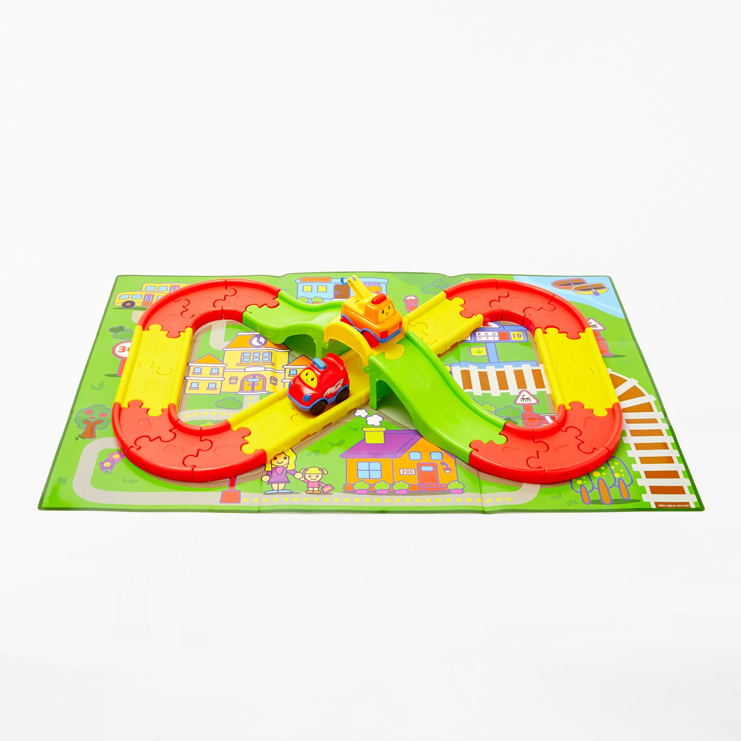 Drive the cars around and around the track and the built-in flyover! There’s a cardboard layout undermat and a car and pick-up truck with flashing lights and sound effects.