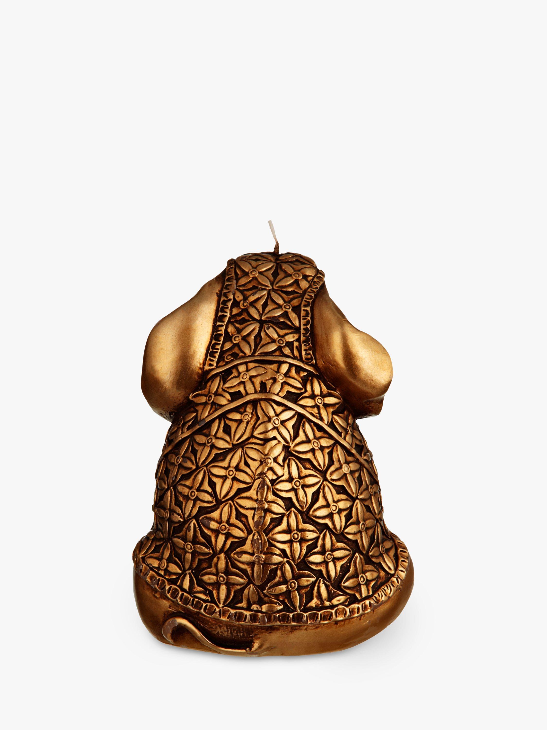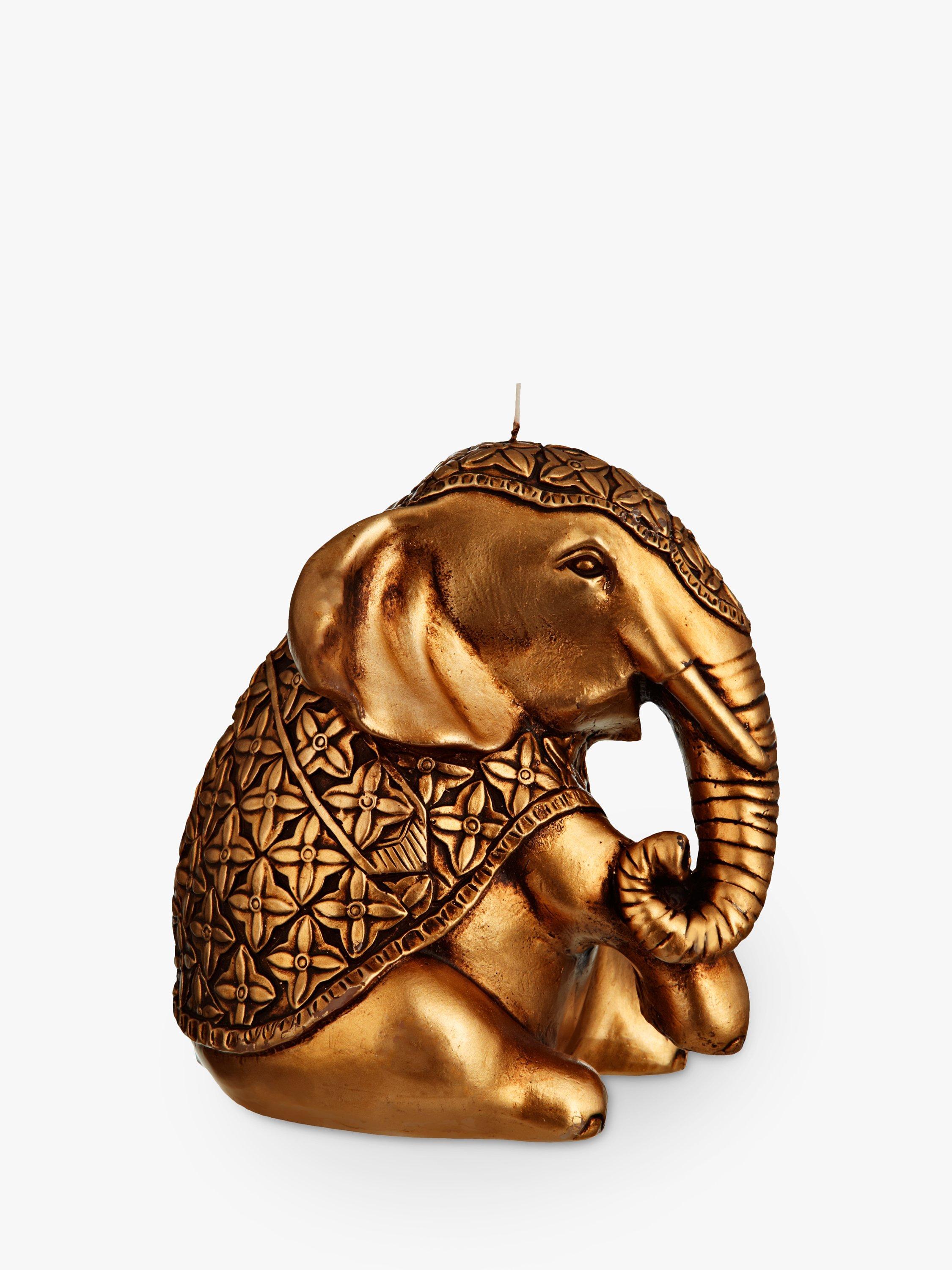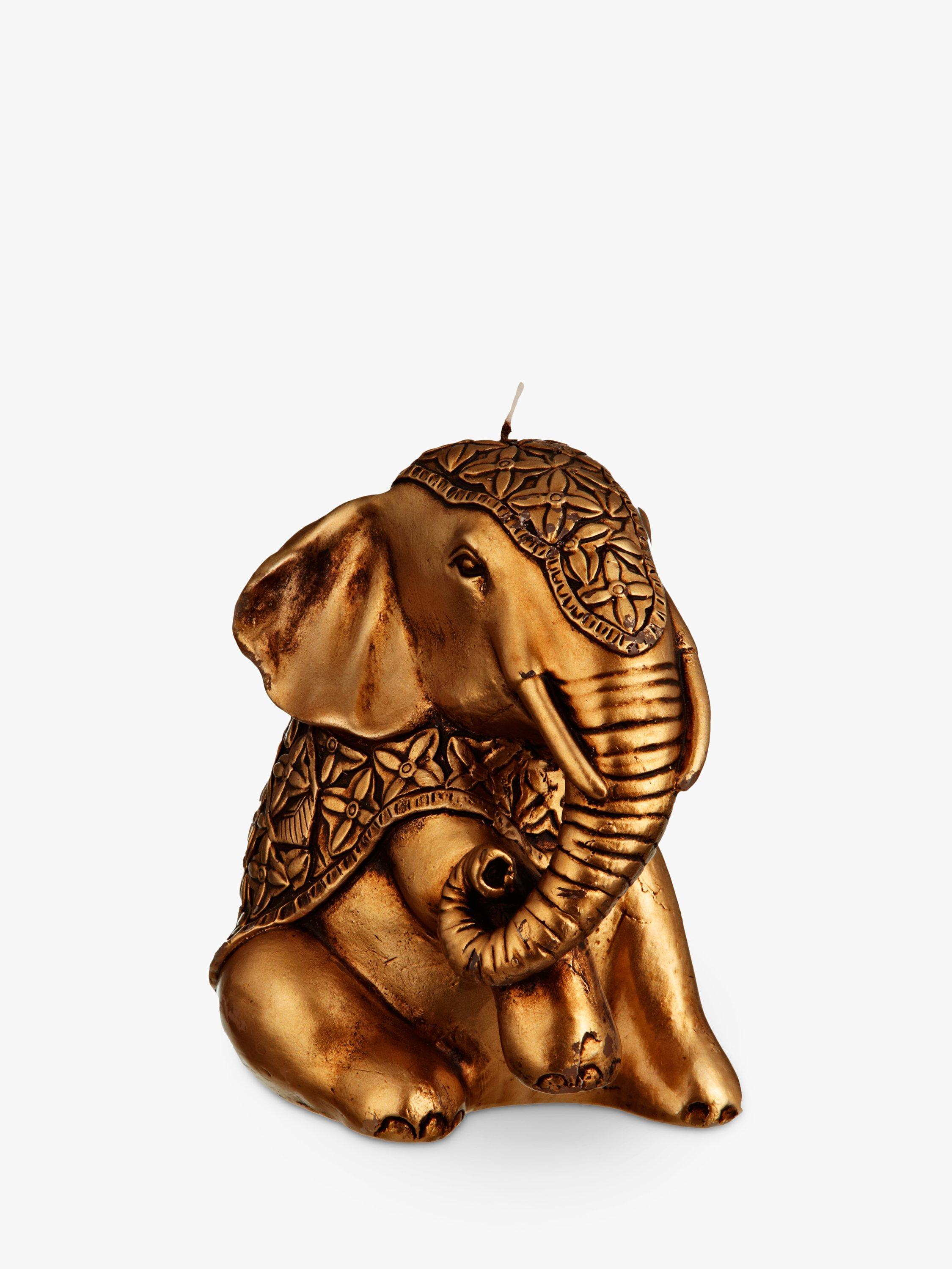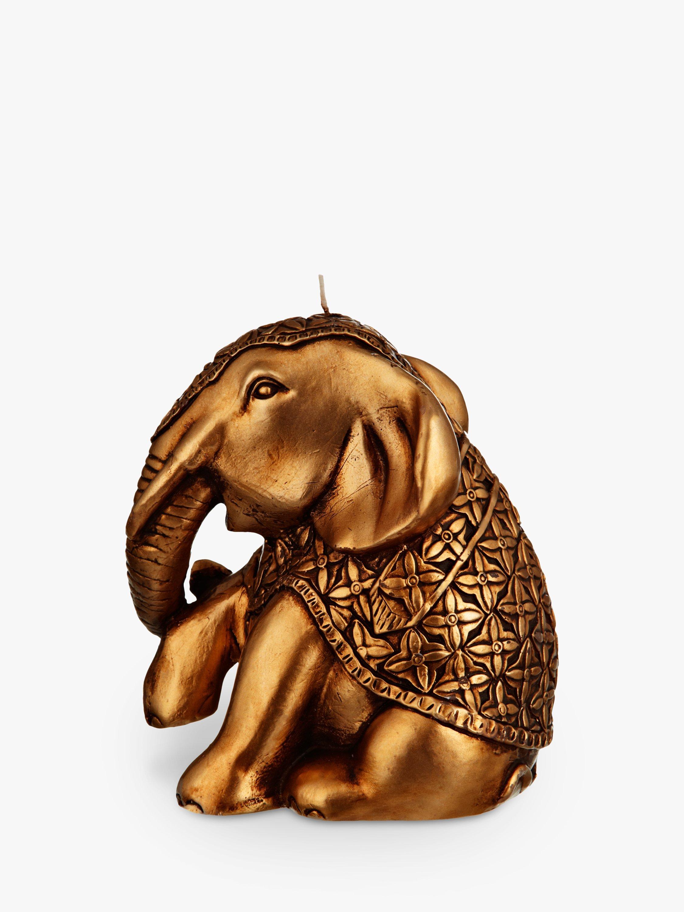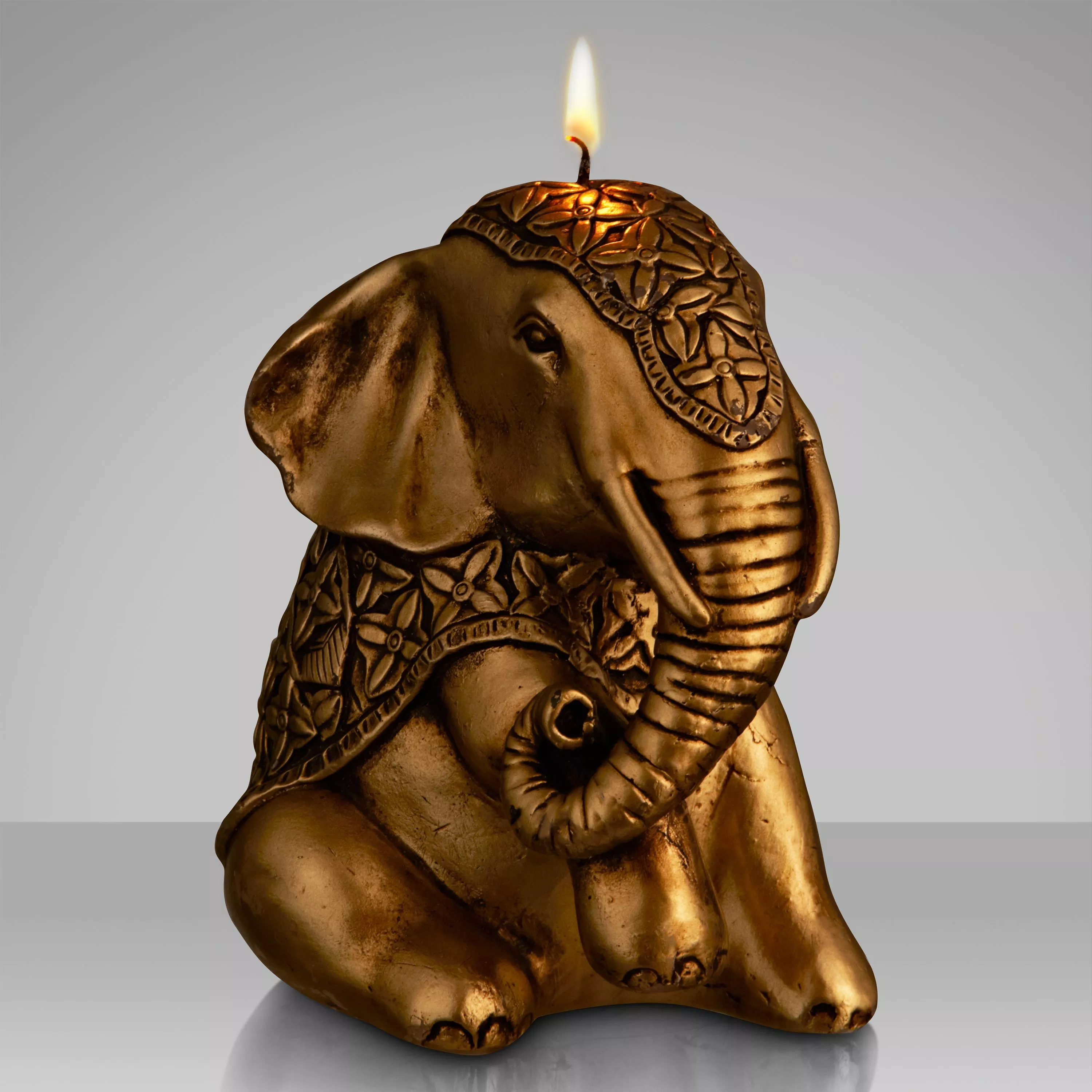 An ornamental elephant candle. He sits there peacefully, decorated with a beautiful pattern. Finished in a rich gold, he looks stunning unlit with other decorative objects.