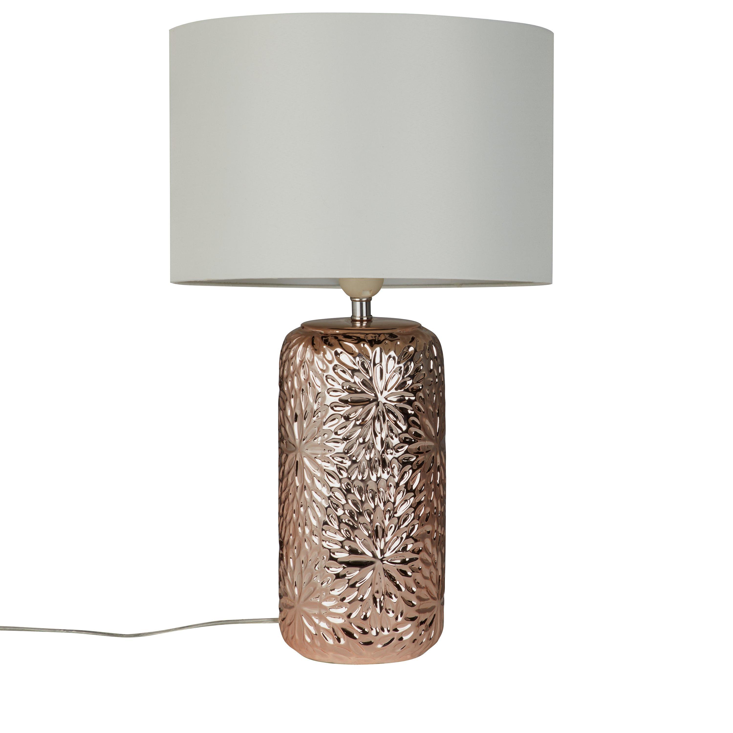 Our elegant Flora table lamp is a considered choice for any room. Boasting a ceramic base, delicately decorated with a floral design, its metallic rose gold finish will beautifully complement natural settings. Complete with a neutral coloured polysilk shade, it will equally suit bedside tables or coffee tables.