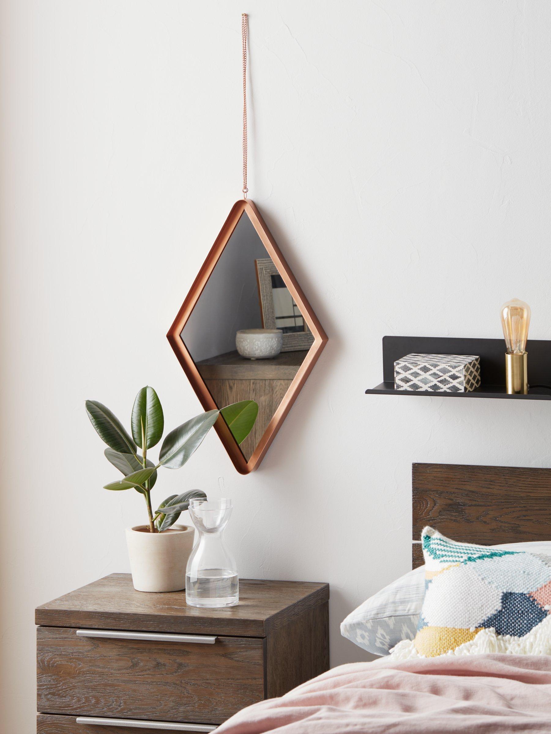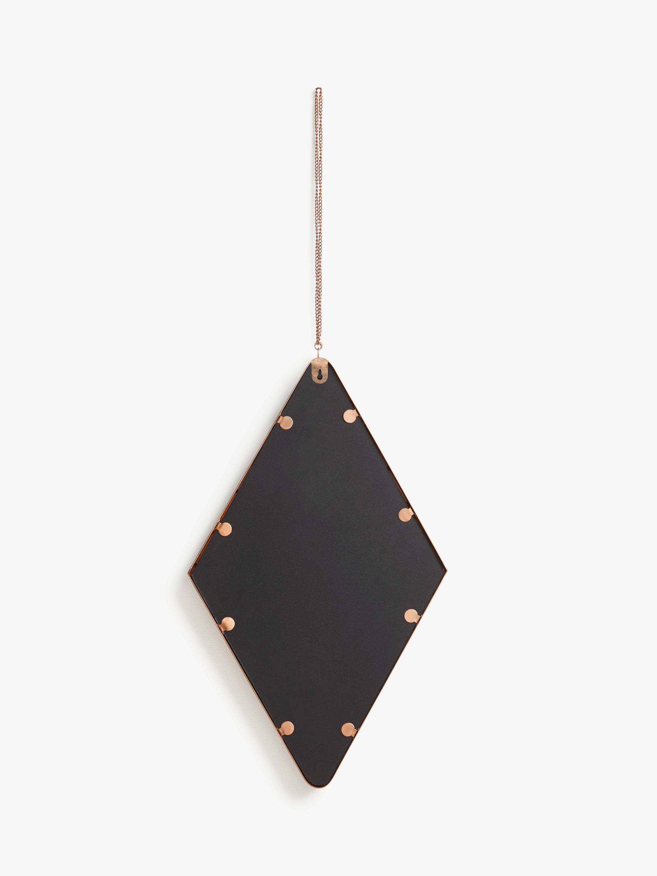 An elegant decorative piece for any room or hallway, this diamond-shaped mirror has a metal frame with a smooth coloured finish and a matching hanging chain.