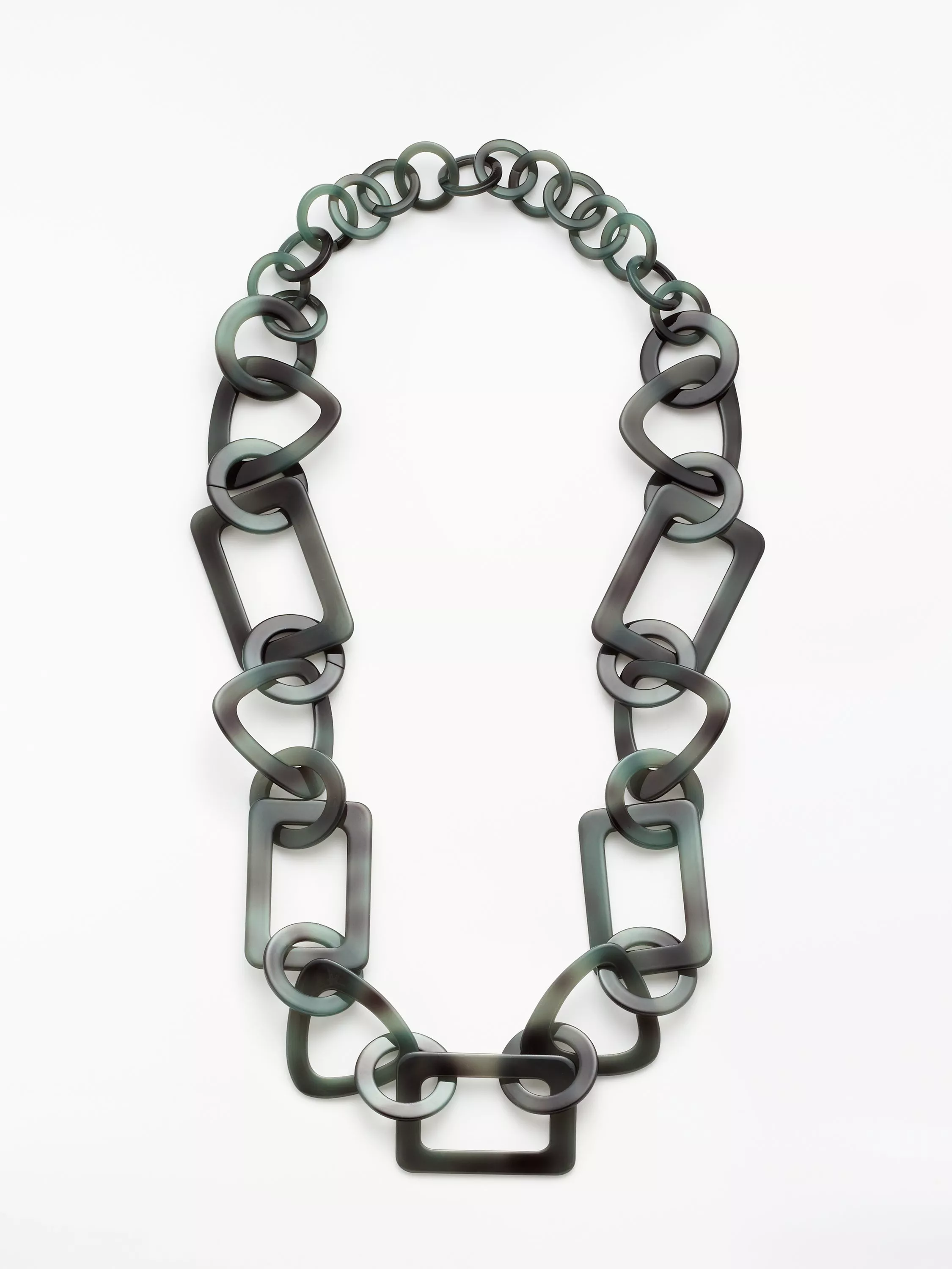 With interlinked geometric elements with a subtle patterned finish, the necklace is made of smooth acrylic fibre that conveys a light yet statement finish.