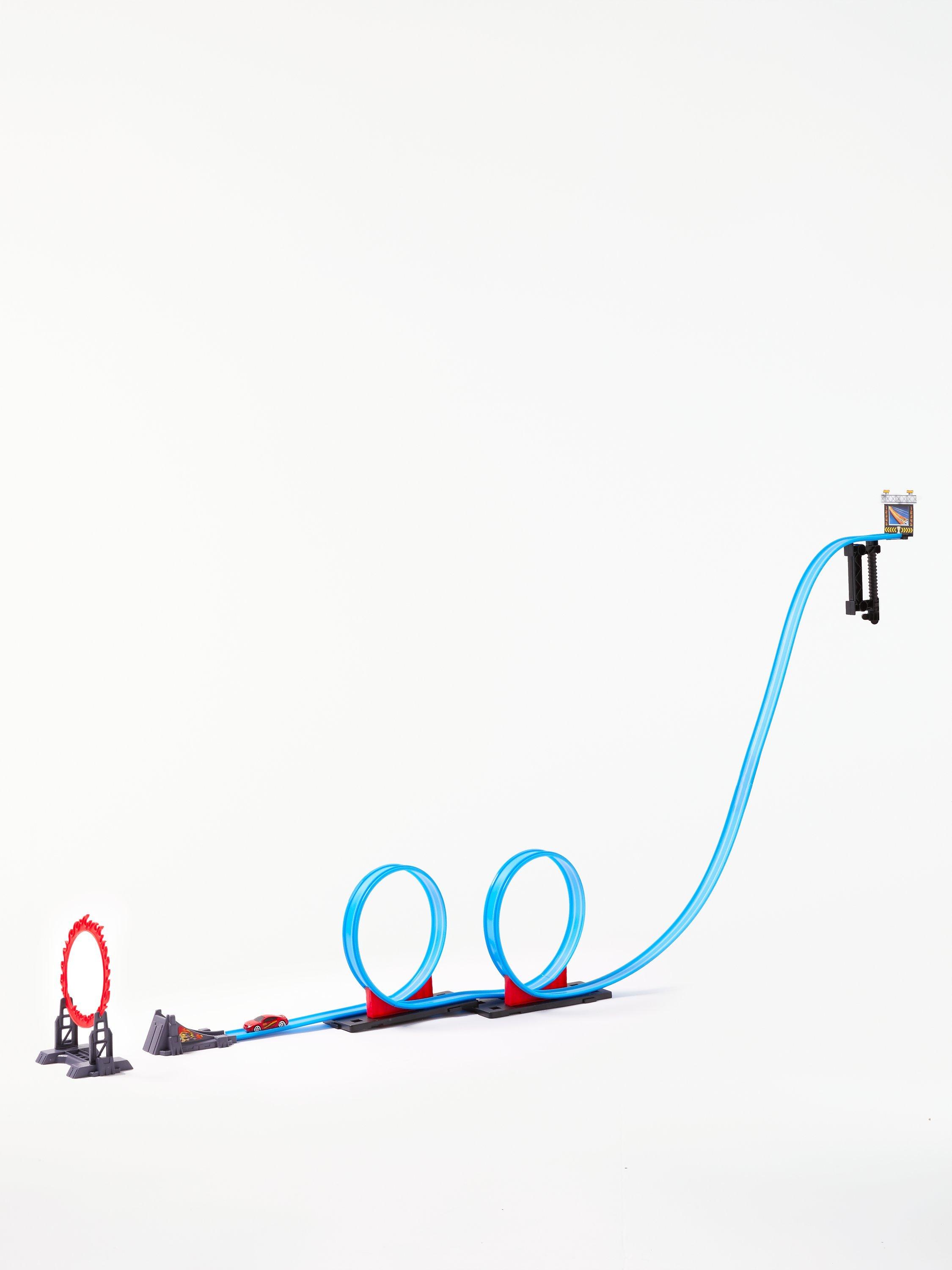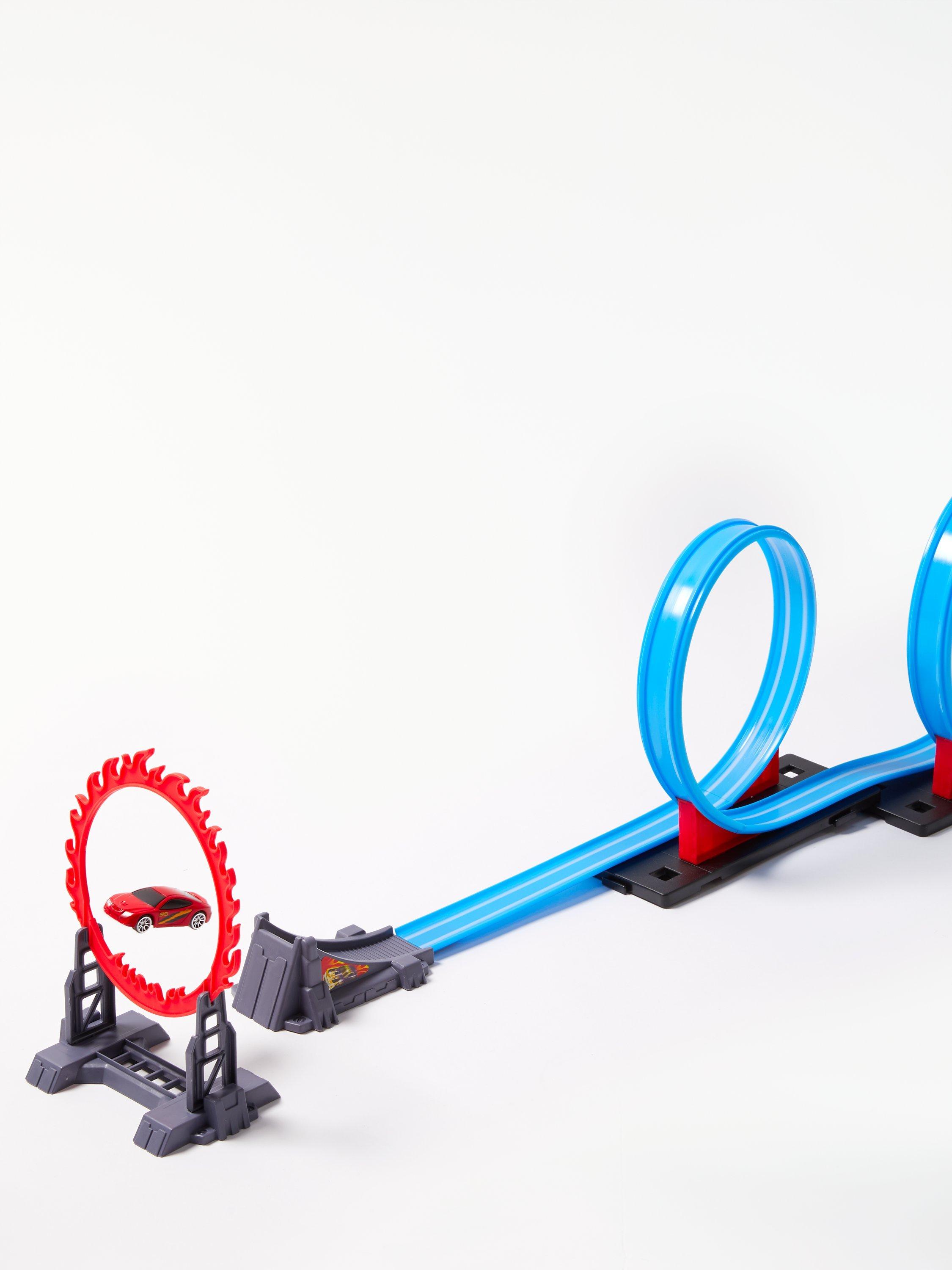 Enjoy the thrills and spills of high speed action with this 137cm-long stunt track. It features a racing car, 2 loop-the-loops and a 'ring of fire': it's your ultimate test track!