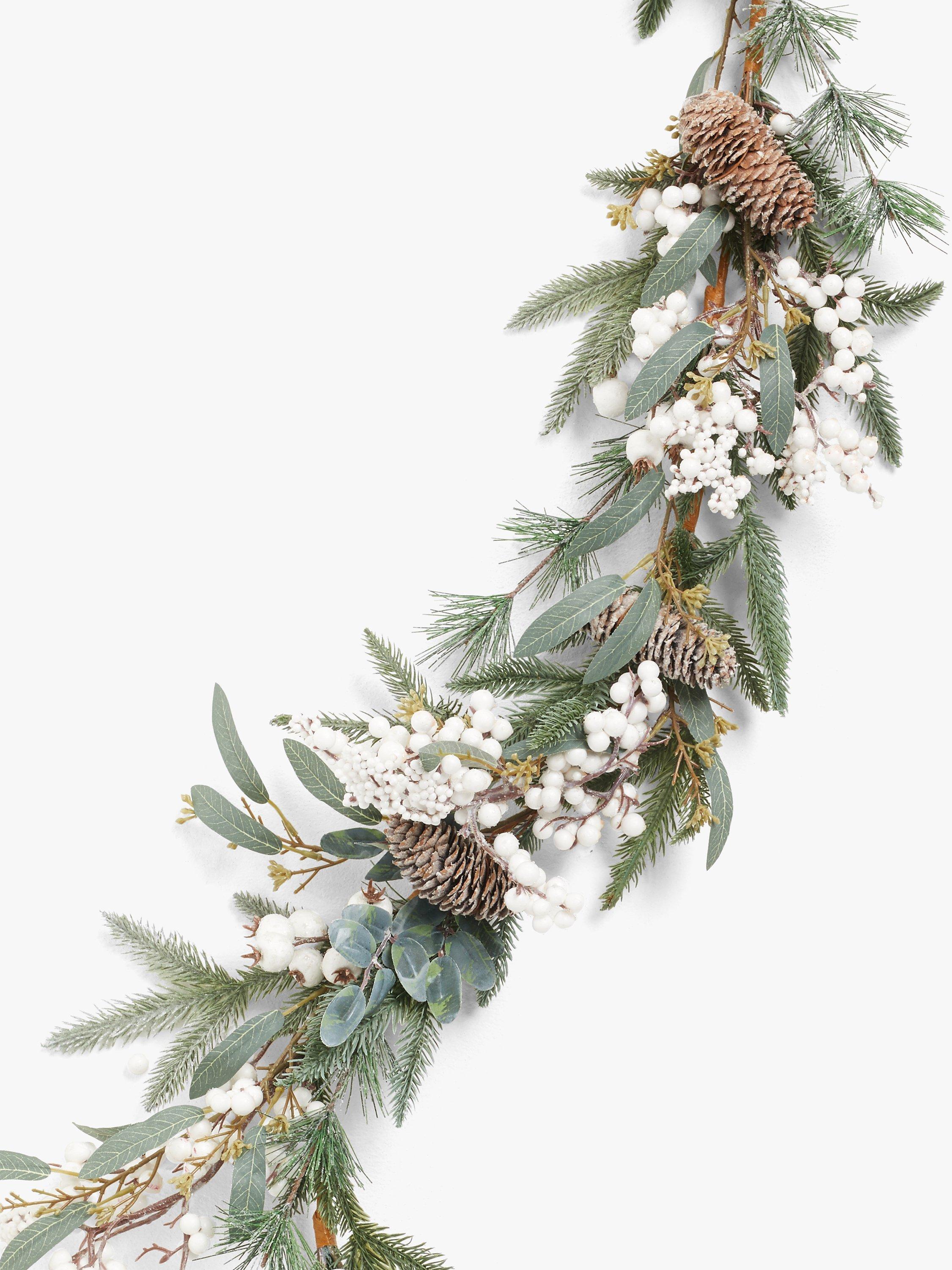 This beautifully detailed garland is made up of realistic mistletoe leaves and white frosted berries, pine sprigs and real pine cones.