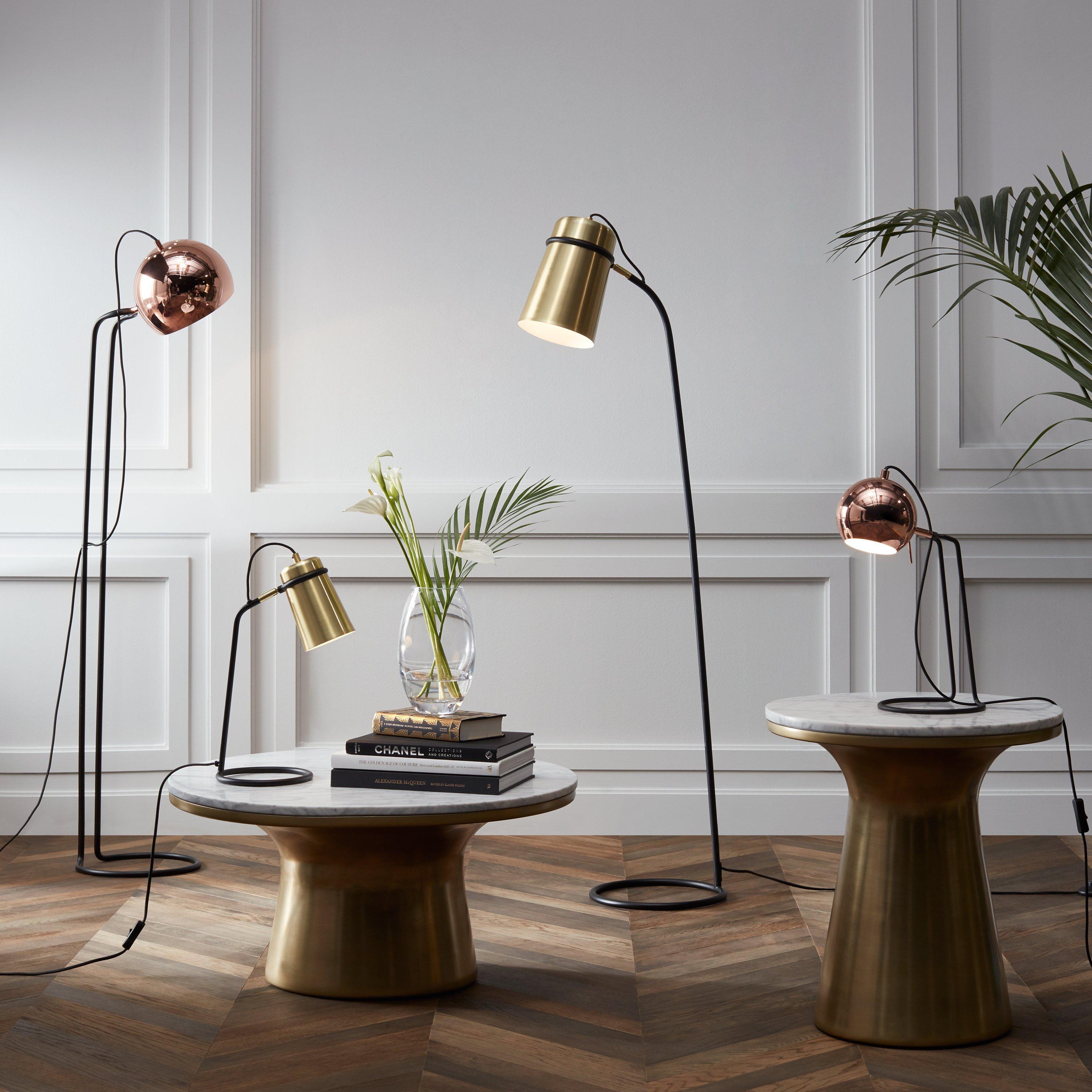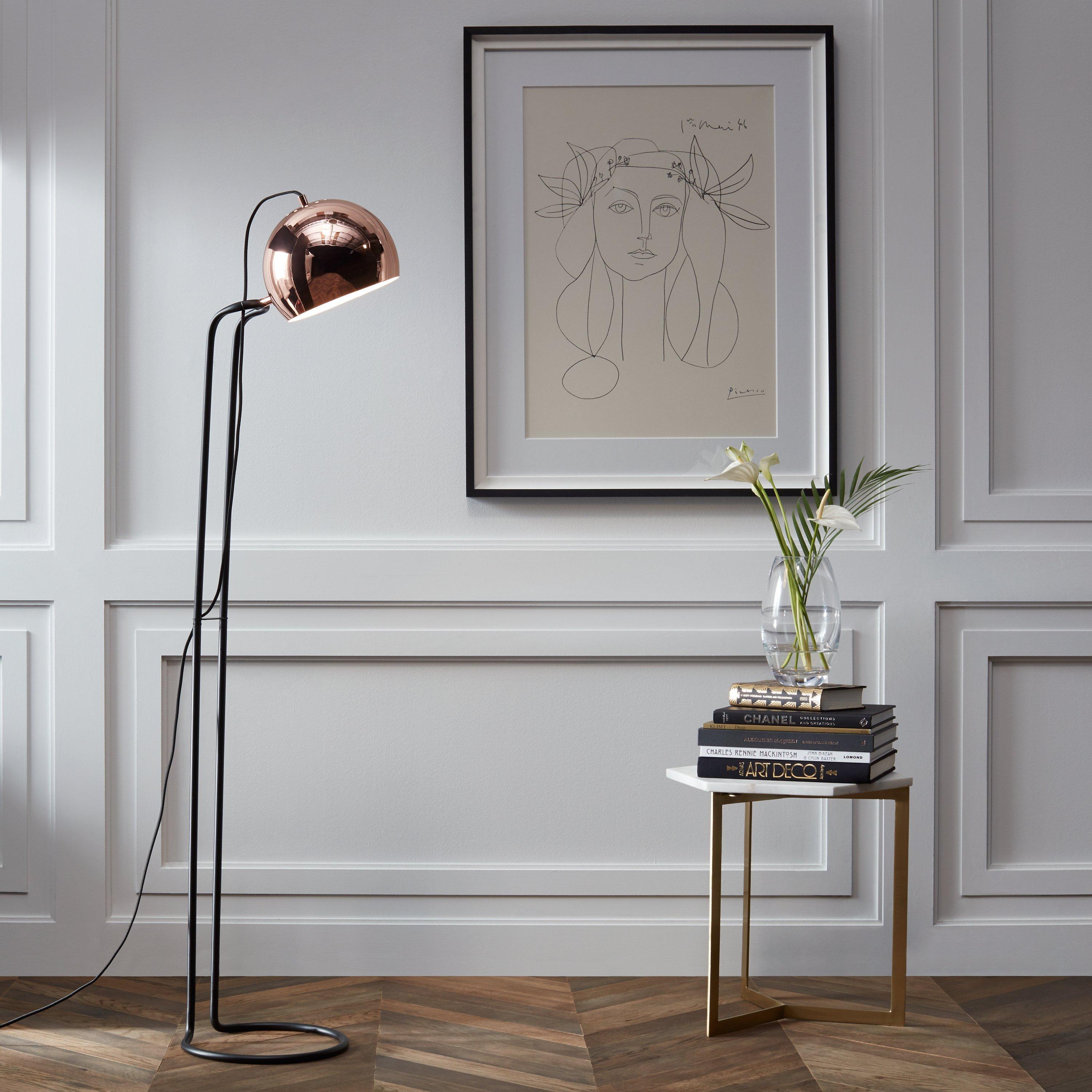 An industrial-style floor lamp with a simple, loop-shaped base and stunning copper ball shade, which is adjustable. It will make a smart addition to your living room or home office.