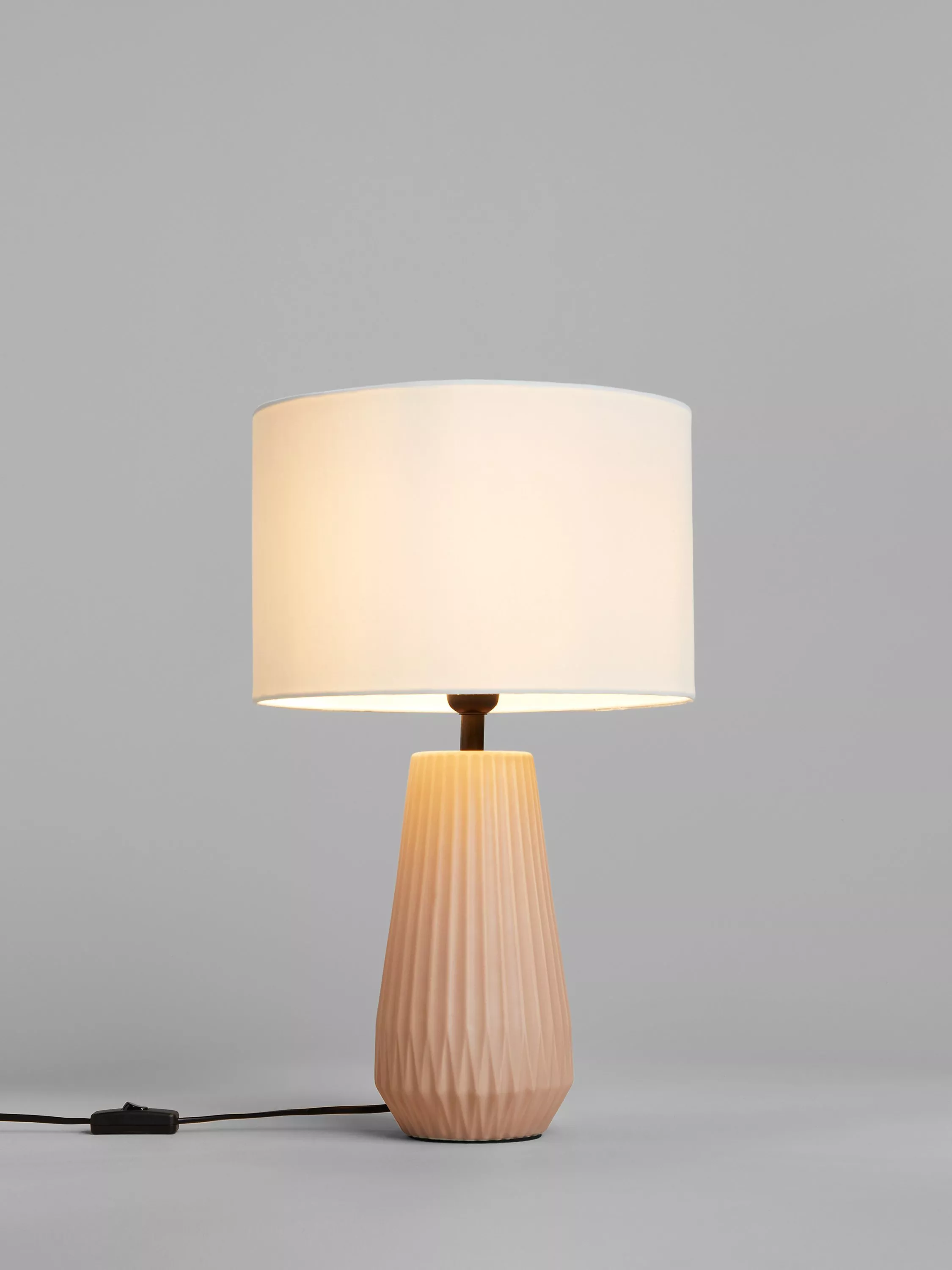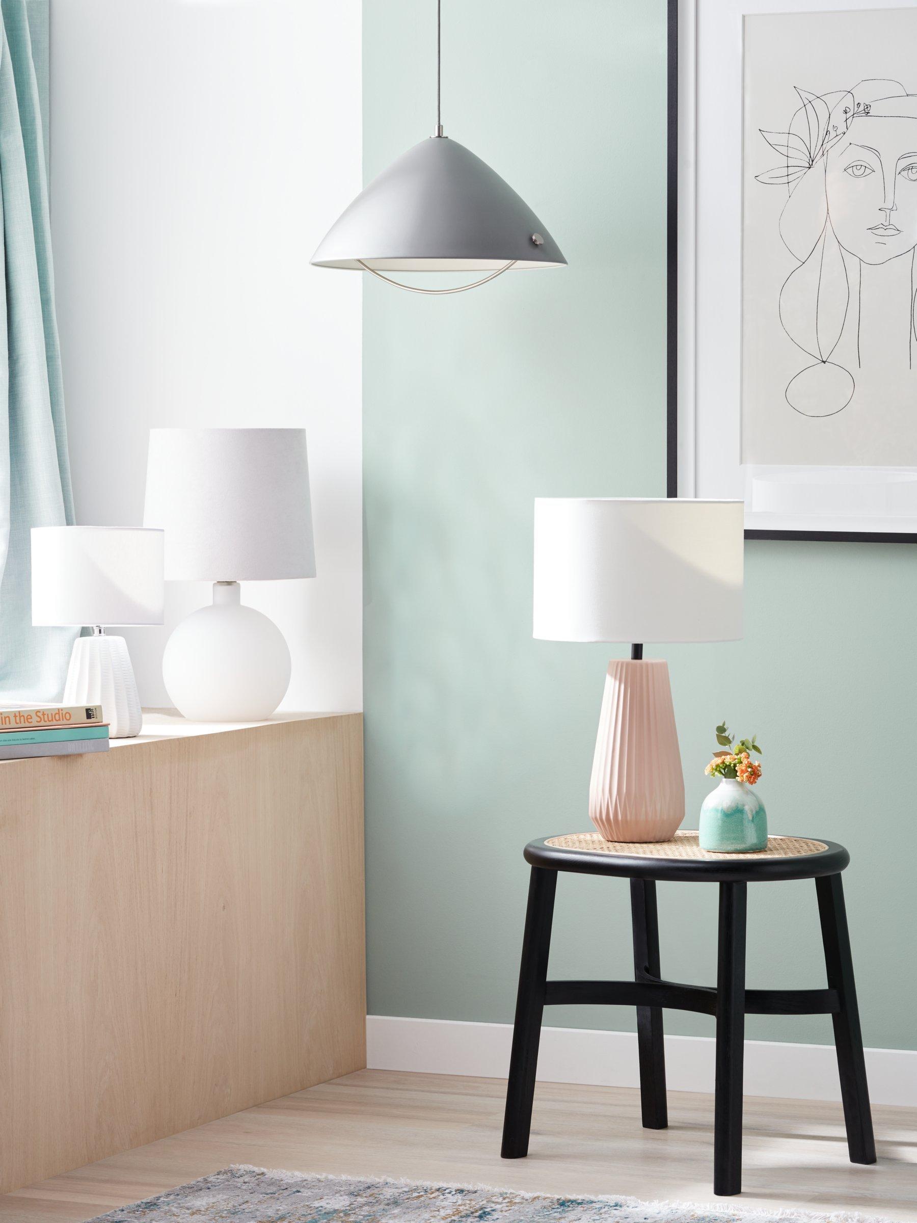 The painted ceramic base of our Kite table lamp has a geometric-style, scallop design and is finished in a matt glaze. A cool-toned, contemporary option for your bedroom or living rooms, it's paired with a fabric lampshade that maximises light spill and accented with contrast metal work to ensure that it stands out on your surface top.