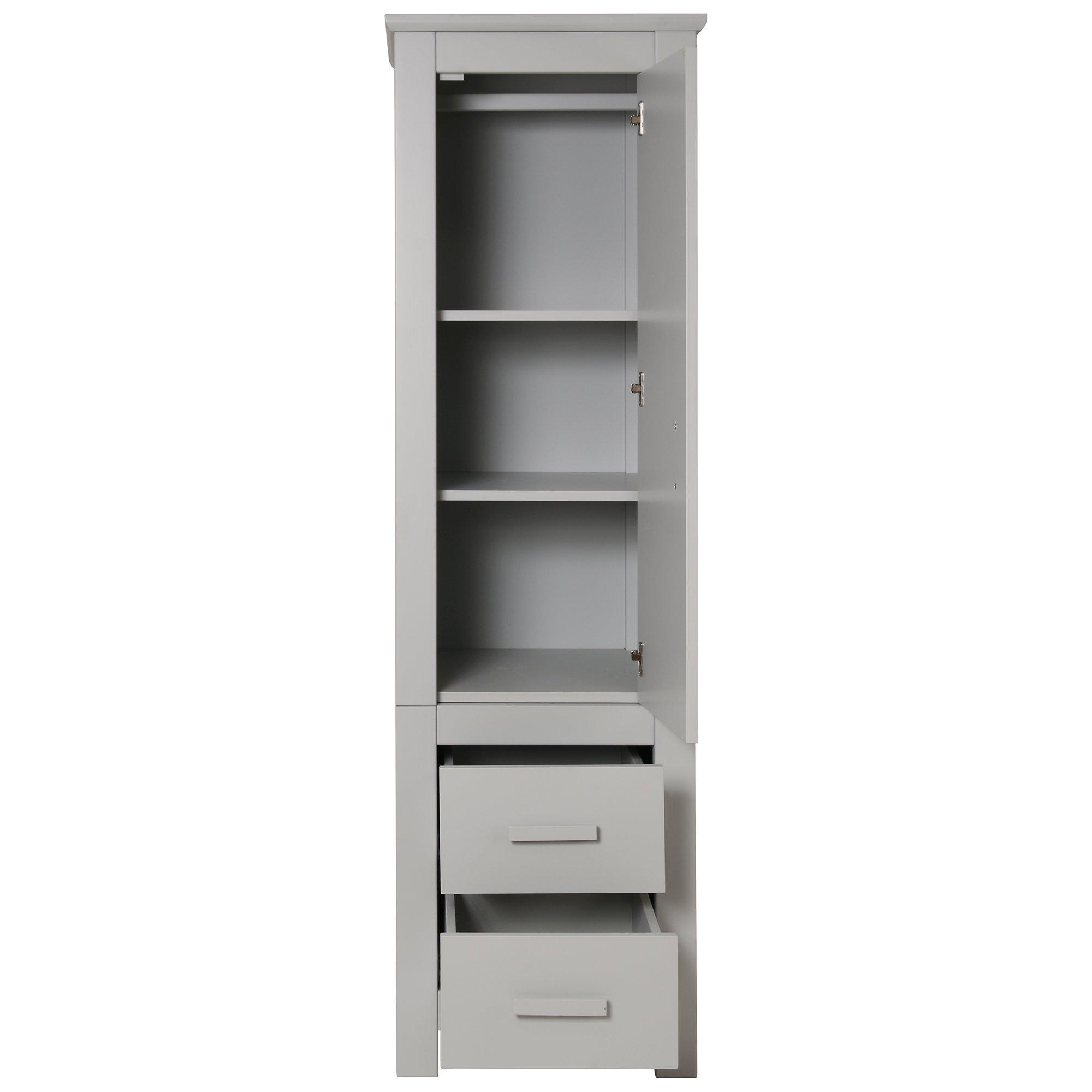Good for space saving, it has a hanging rail, 2 spacious drawers, a singular door, and 2 removable shelves.