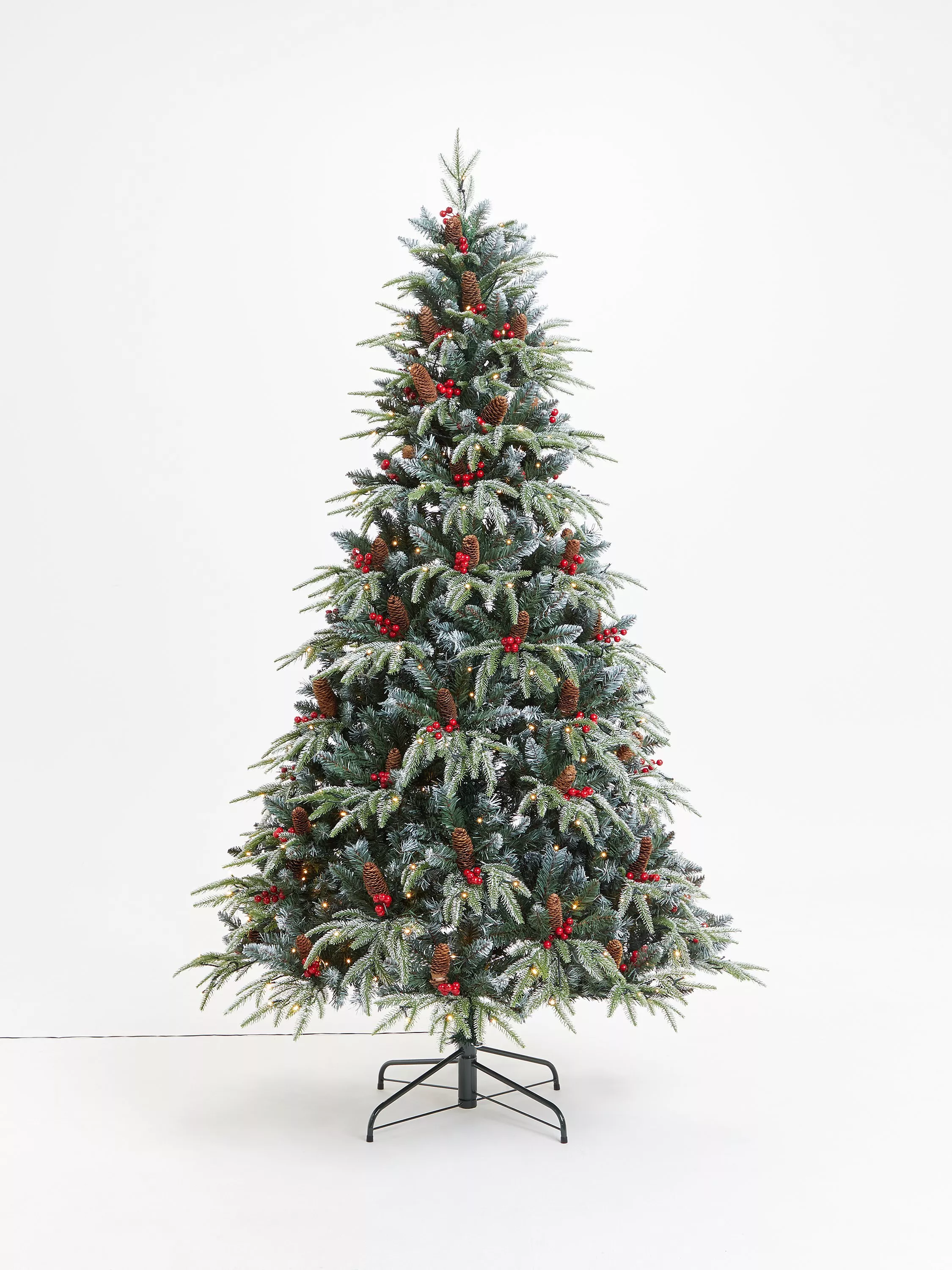 A classically conical artificial Christmas tree,pre-lit with 350 pure white LEDs. The tree's outer tips are fine needles, decorated with real pine cones and artificial red berries.