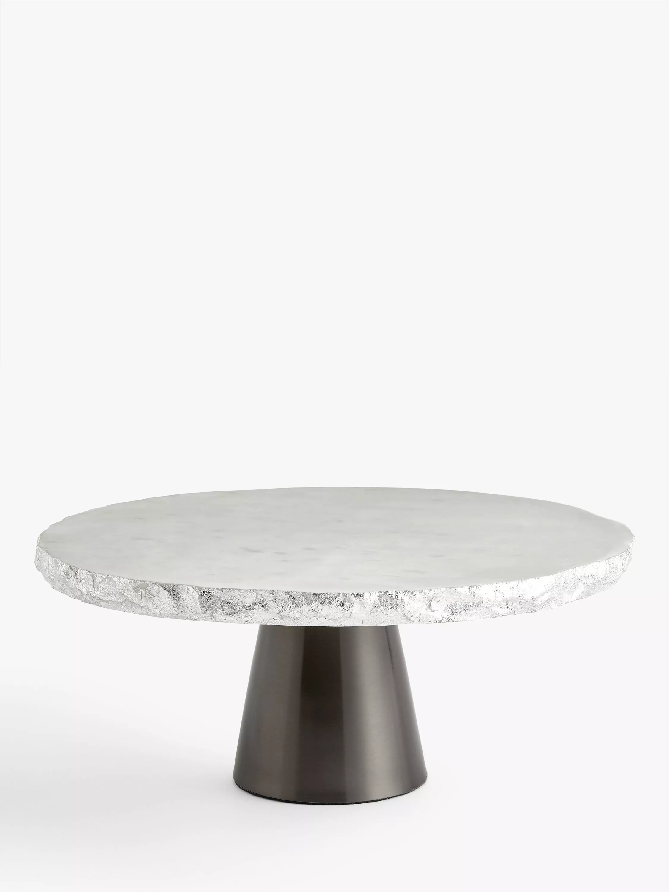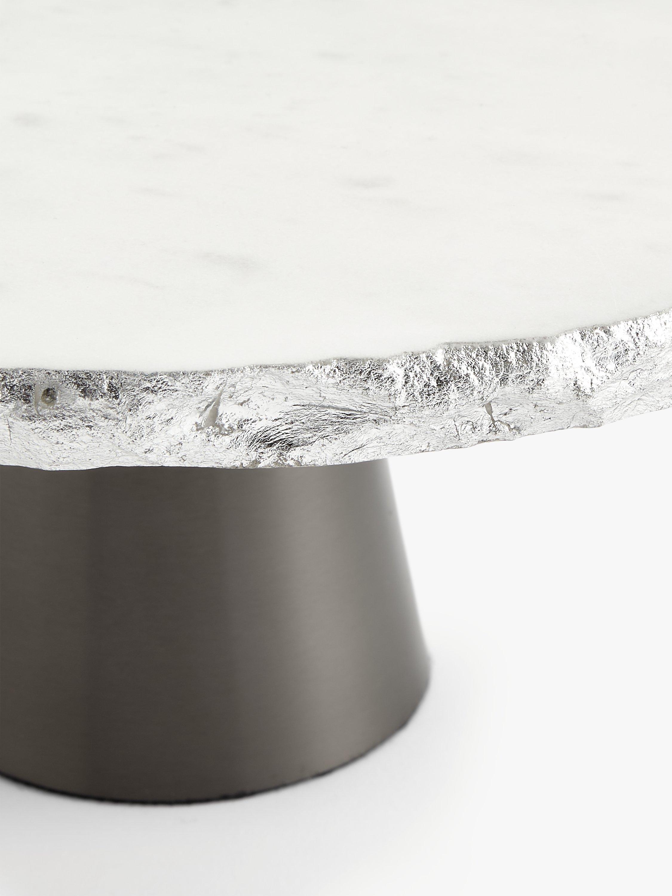 Present cakes and puddings in contemporary fashion on this white marble cake stand with a natural edge finished in silver. The sturdy stainless steel base has a sleek nickel finish, making a striking contrast.
