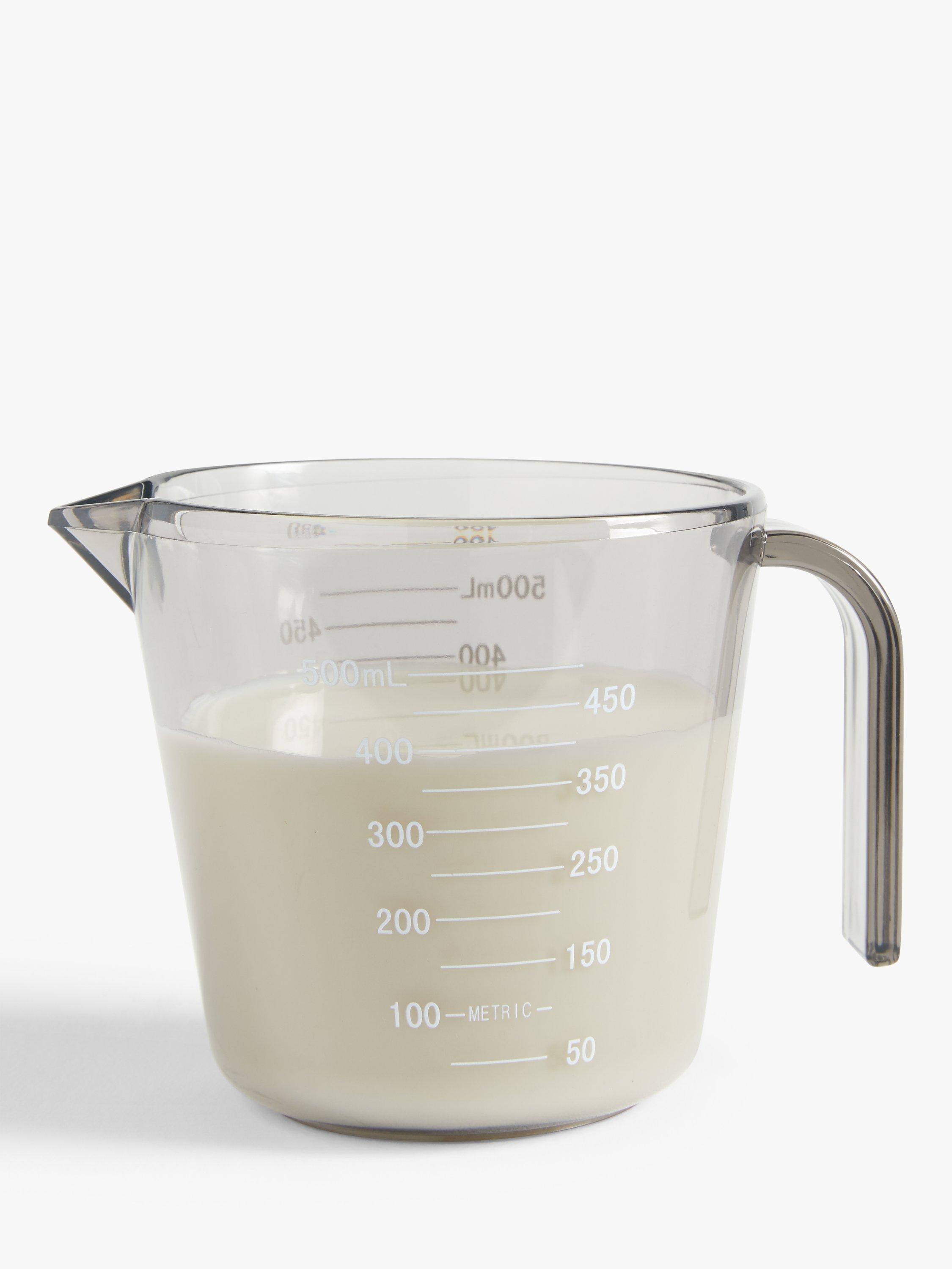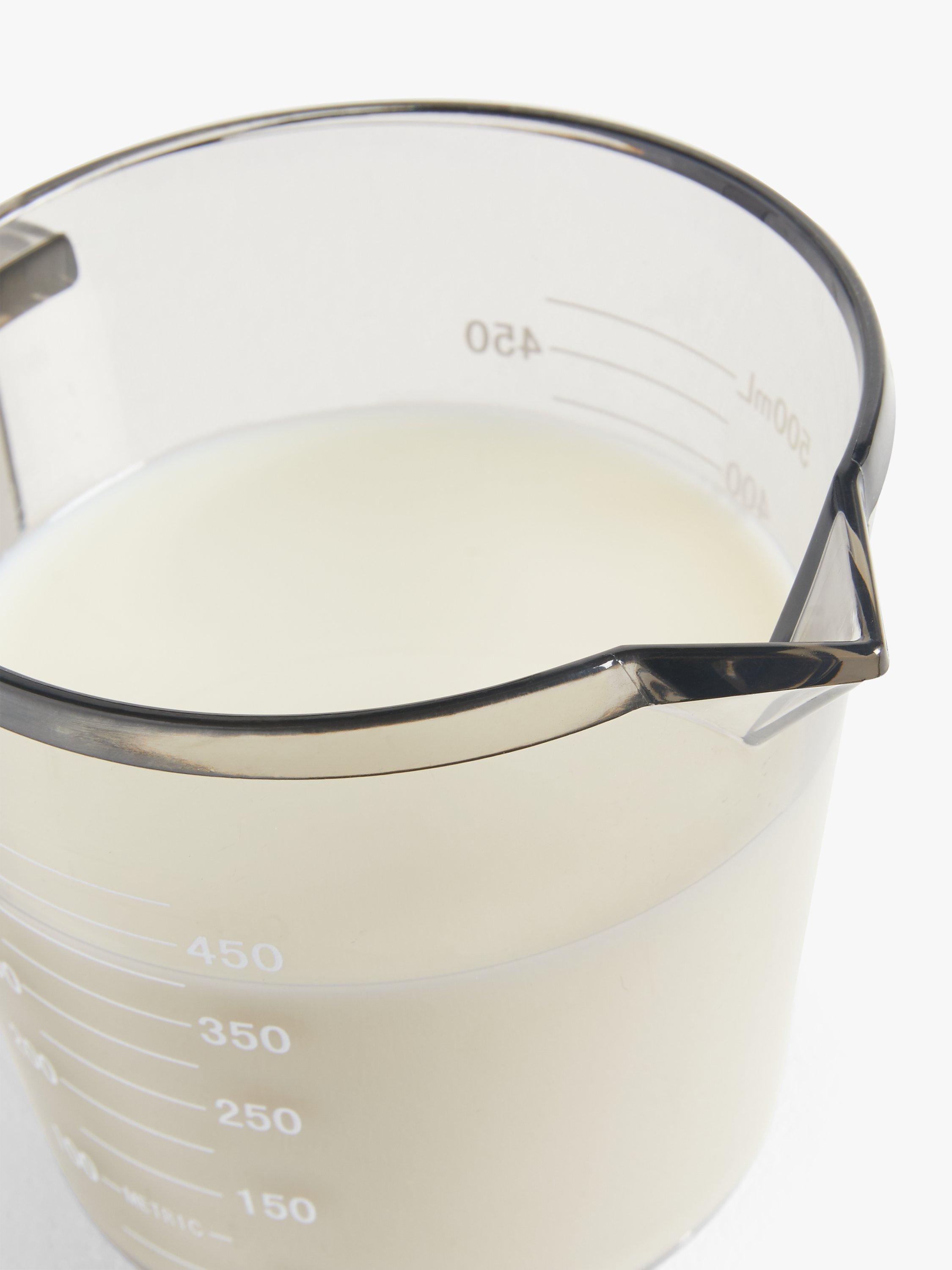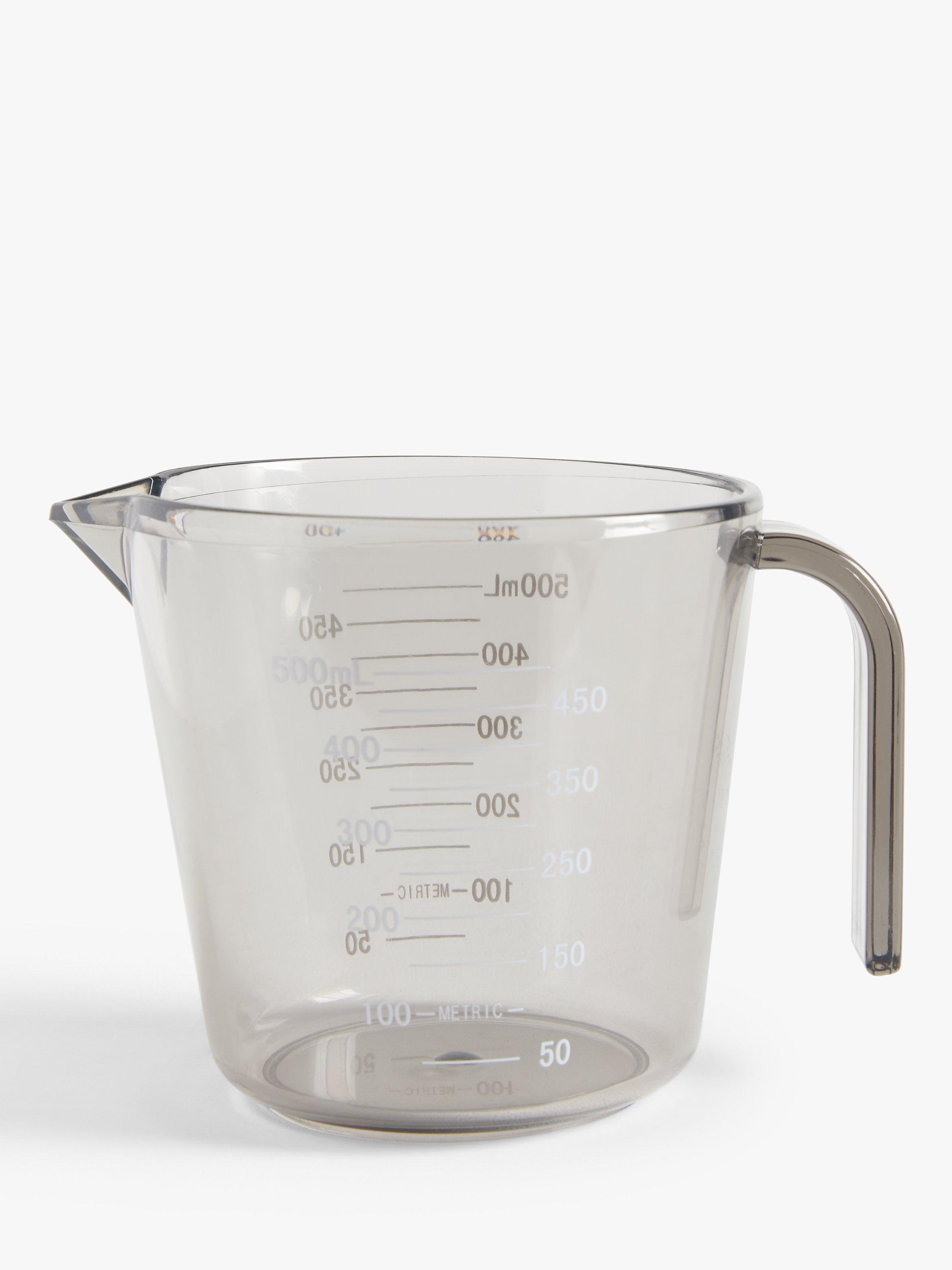 This transparent plastic measuring jug is dishwasher safe and measures up to 600ml of liquid. Easy to hold, it has a lip for gentle pouring.