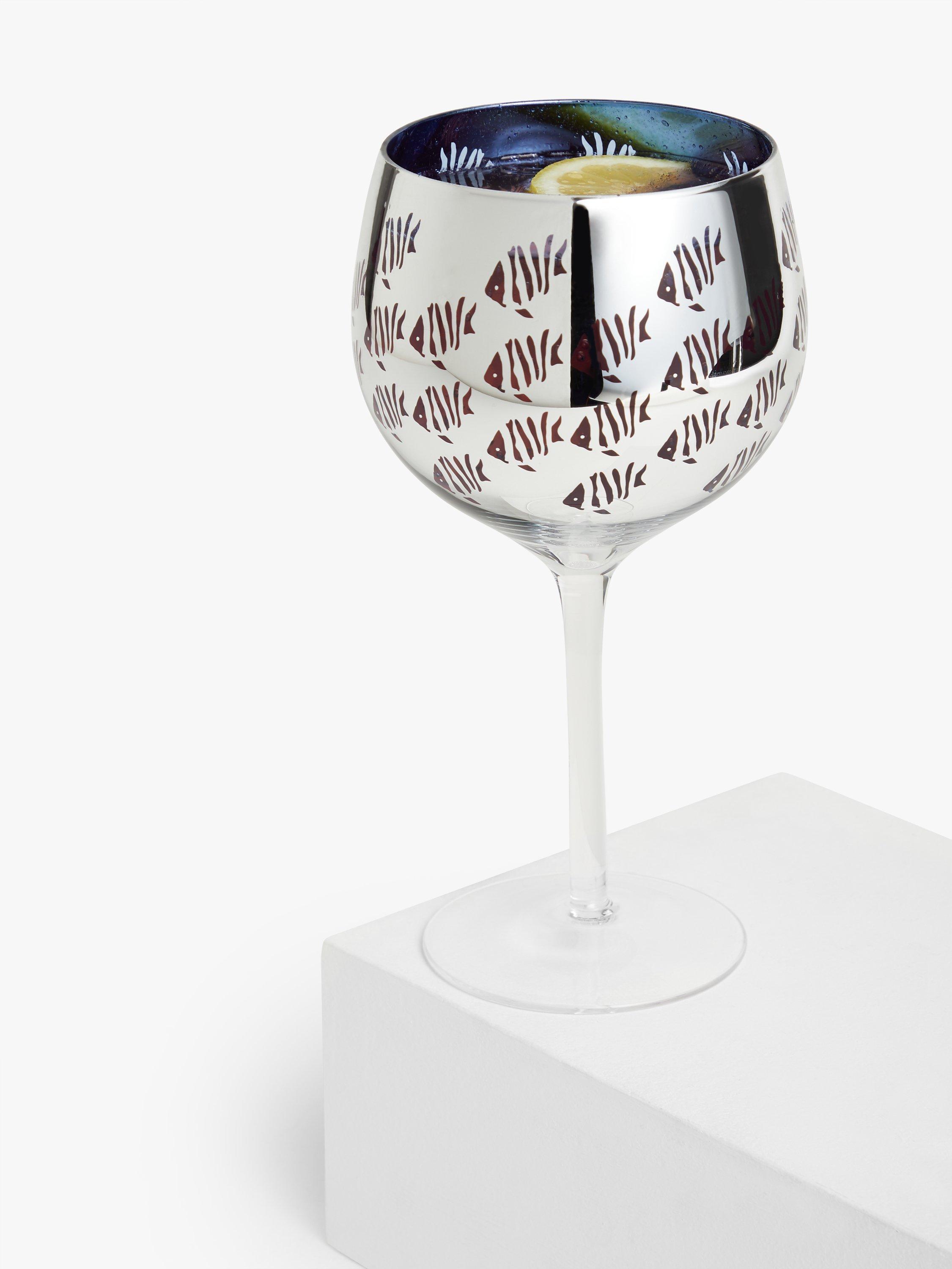 Decorated with a shimmering fish motif, this glass is made for gin-based cocktails. The wide bowl allows gin, mixers and citrus garnish to blend together, while the long stem prevents the hand from warming up the chilled drink. This design has a hint of blue with electroplated metallic detailing that beautifully catches the light.