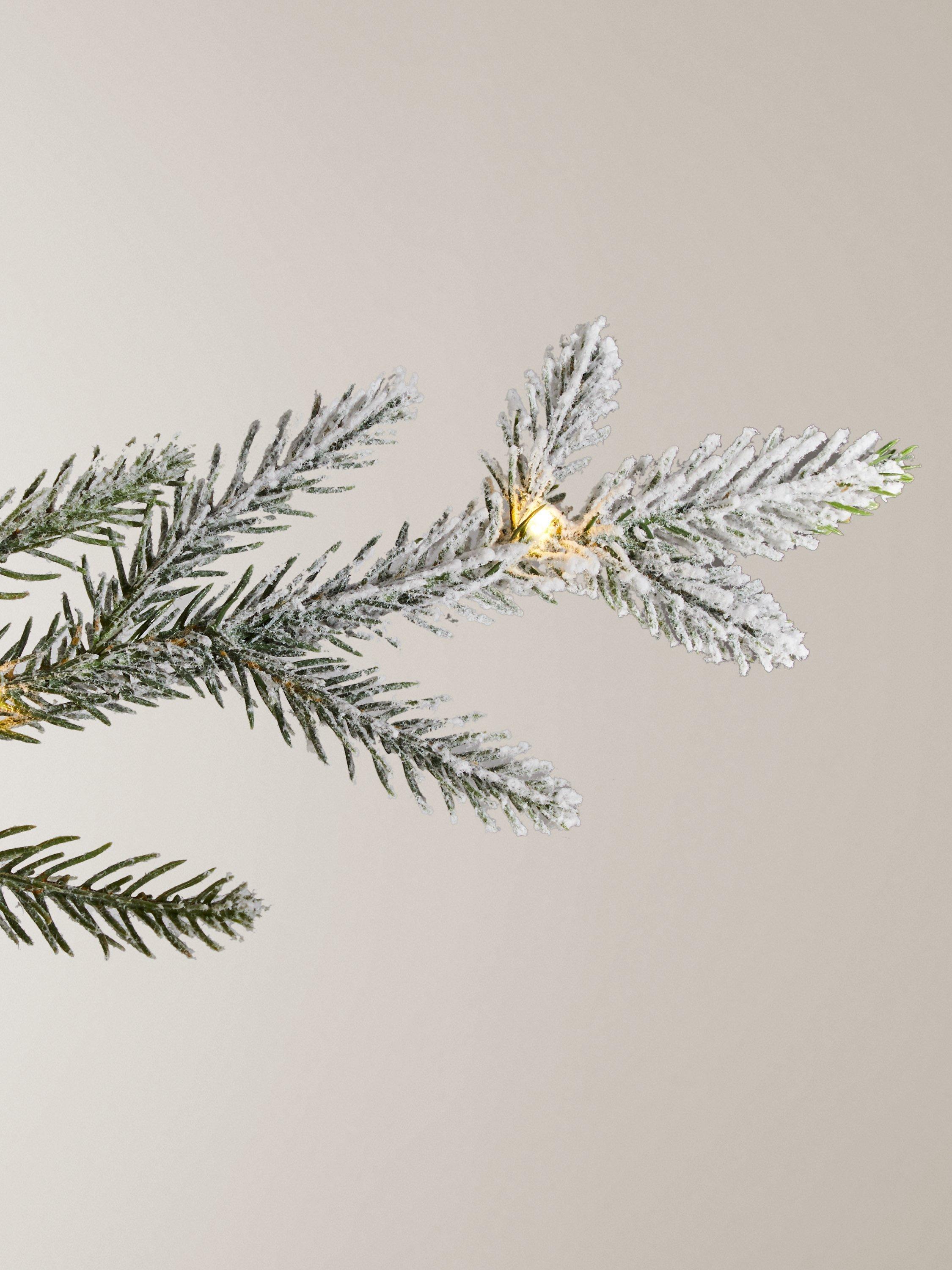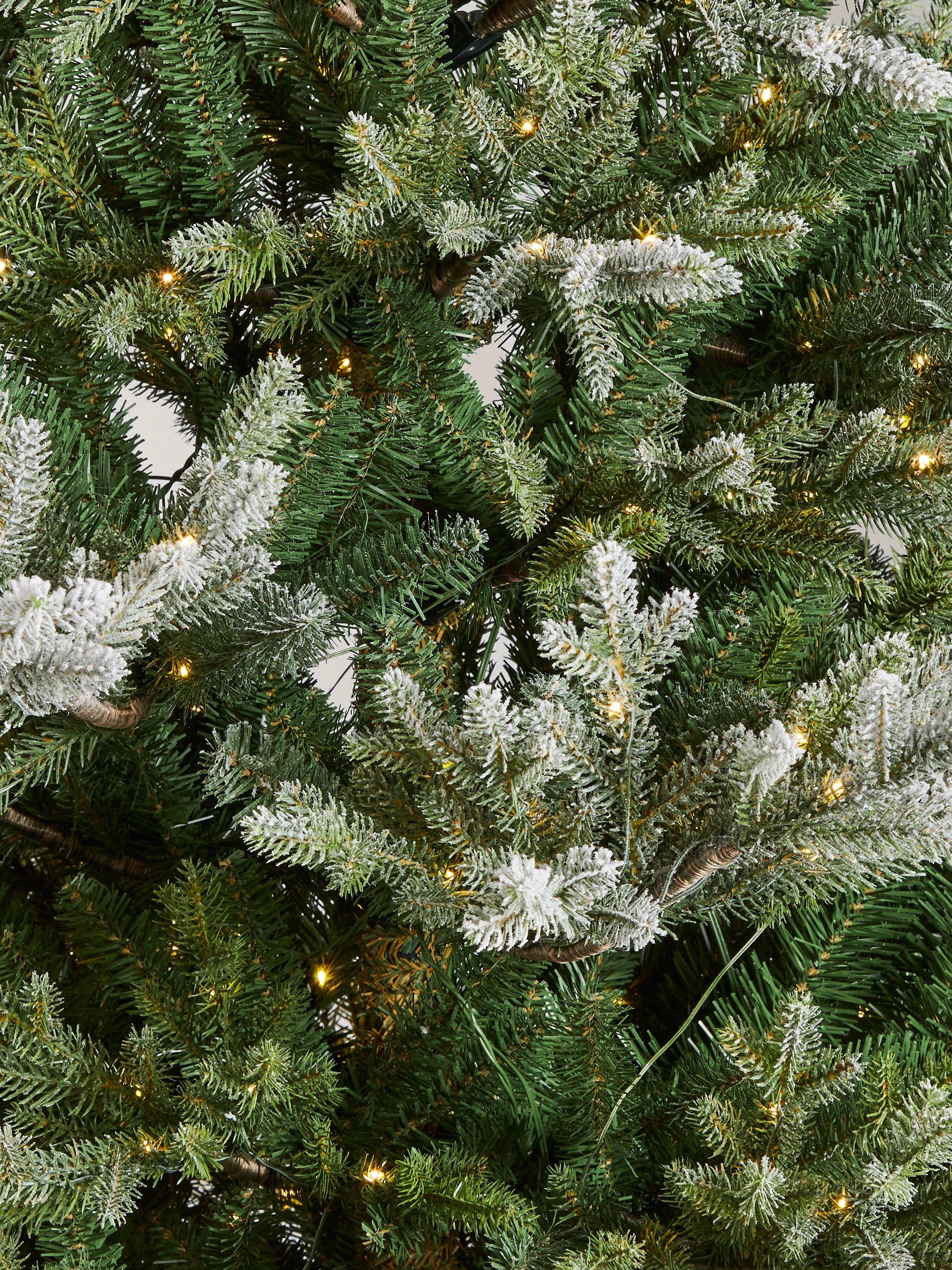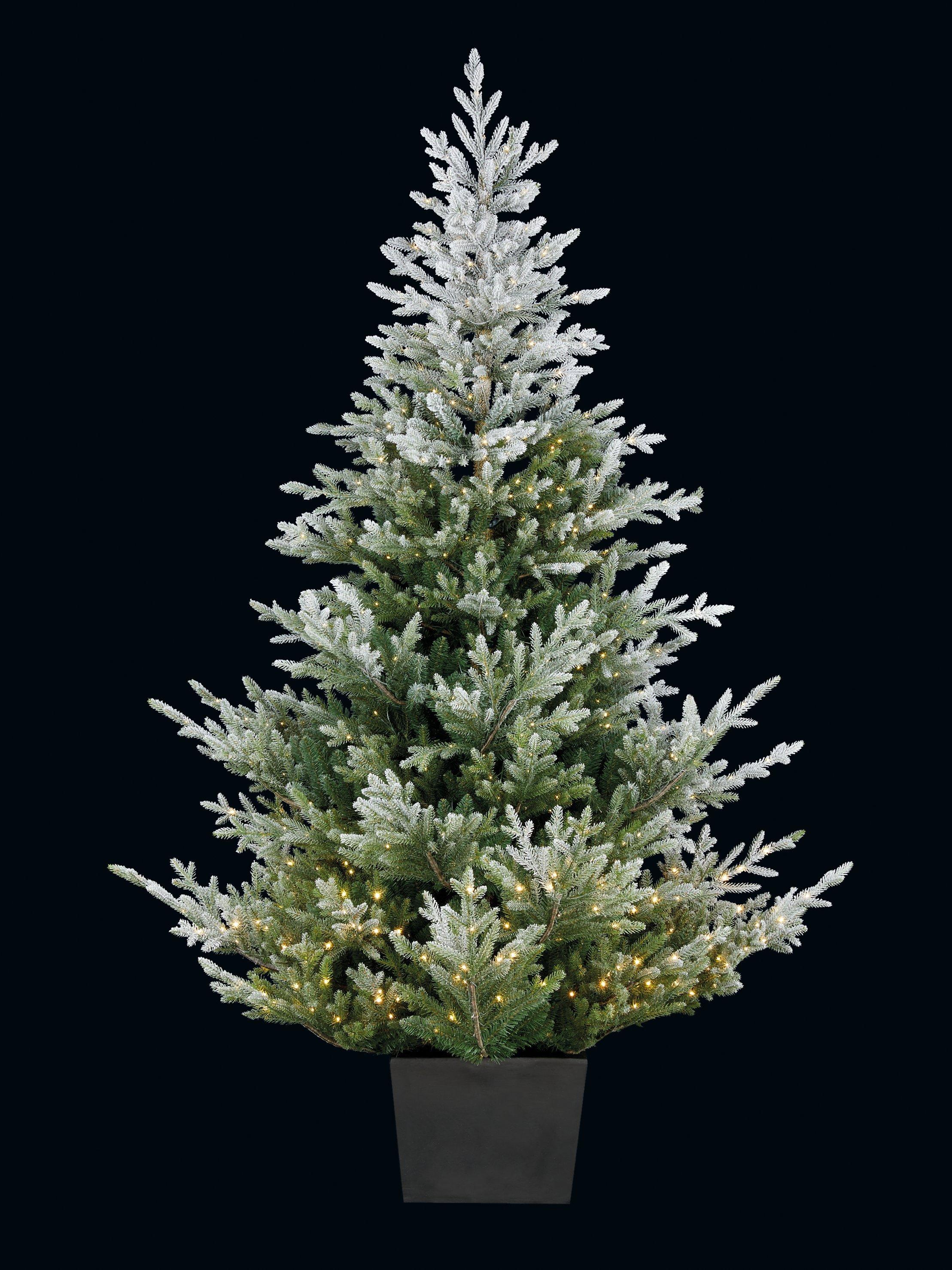 A bushy, classically conical artificial Christmas tree, pre-lit with 900 pure white micro LEDs. The tree's outer tips are accurately moulded and coloured to mimic a real spruce tree, with a dusting of artificial snow.