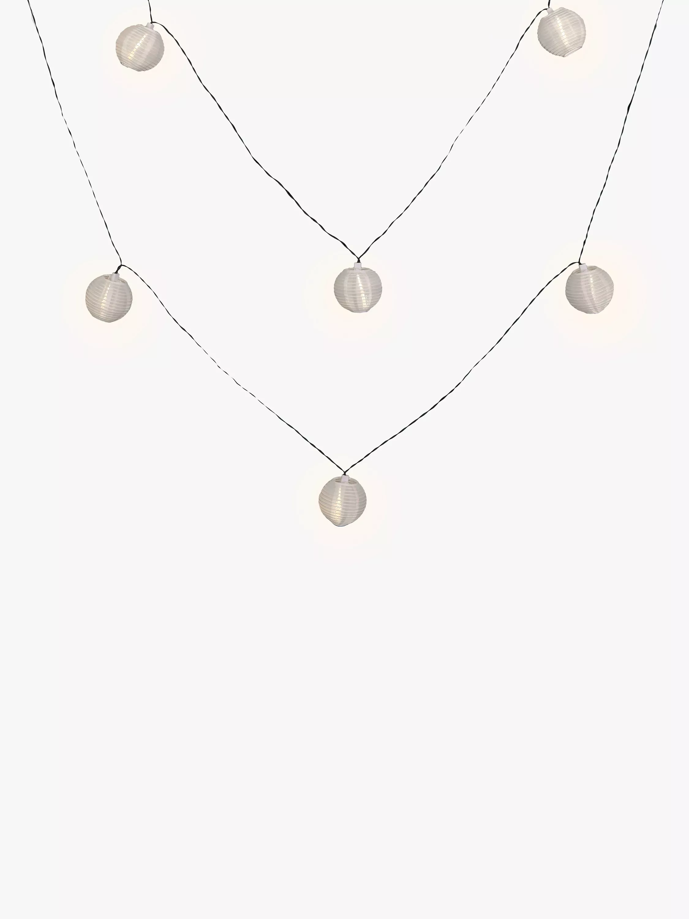 These unique John Lewis 10 LED solar line lights with polyester ball lanterns provide the perfect outdoor decoration.Includes rechargeable AA battery. 3m cable with 50cm between lanterns.