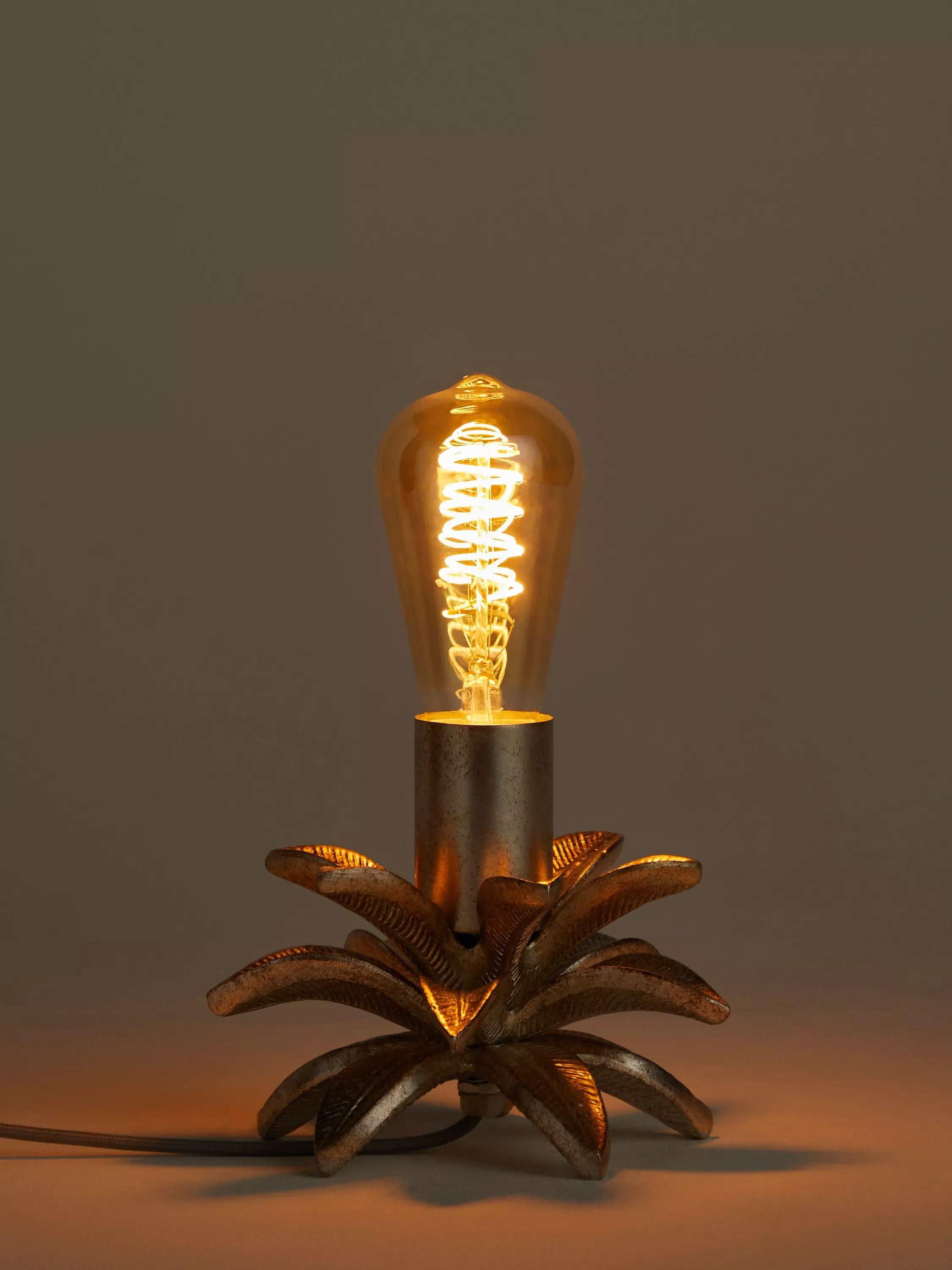 This petite table lamp takes the form of a bulb holder, designed with a quirky base in the shape of a pineapple. Designed from polyresin and metal, its aged finish has a vintage appeal, and it will stand out on any surface top. Opt for a decorative filament bulb for a striking look.