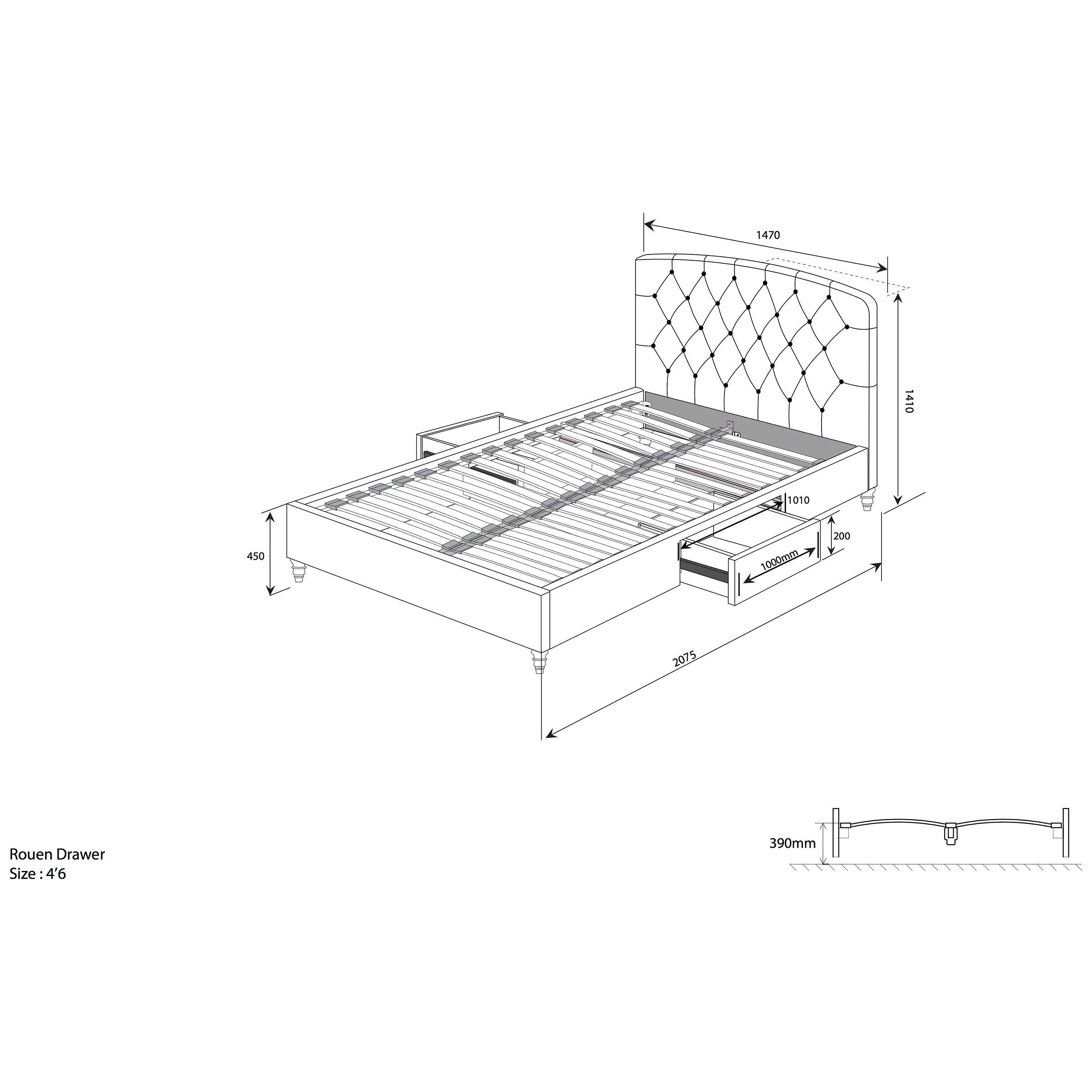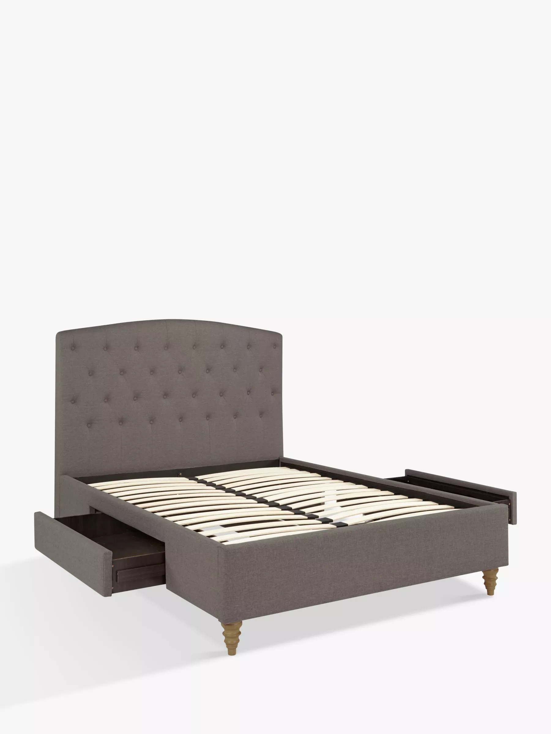 Featuring a curved headboard with beautiful button detailing and twisted ash effect legs, this piece will help bring a touch of drama to any interior. A drawer at either side of the frame provides additional storage that glides beneath on smooth runners. Its sprung slat system also offers heightened comfort when paired with a quality mattress, for an improved night's sleep.
