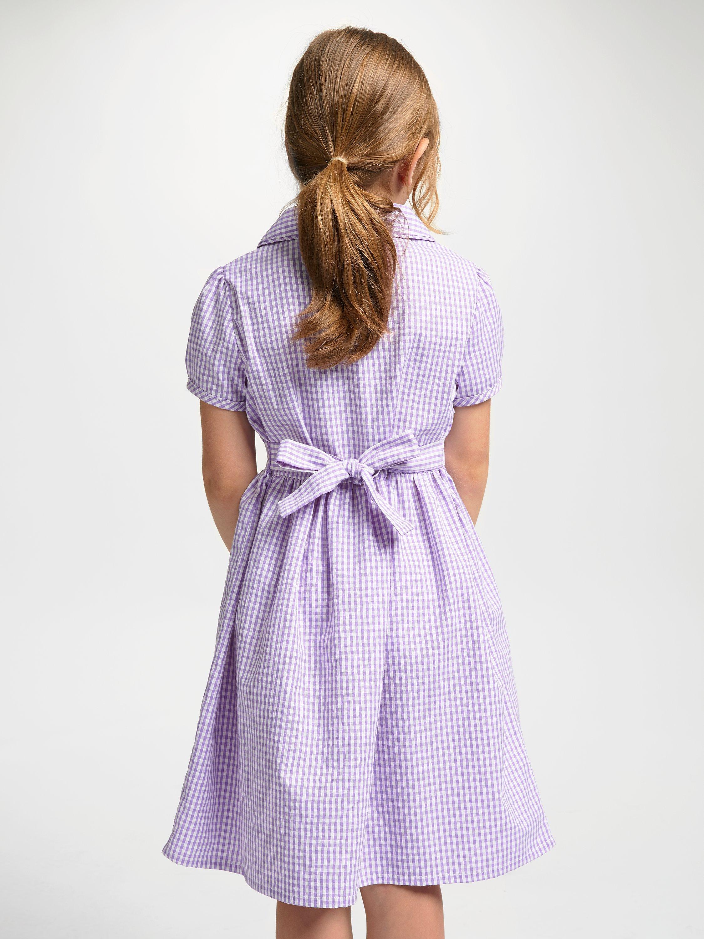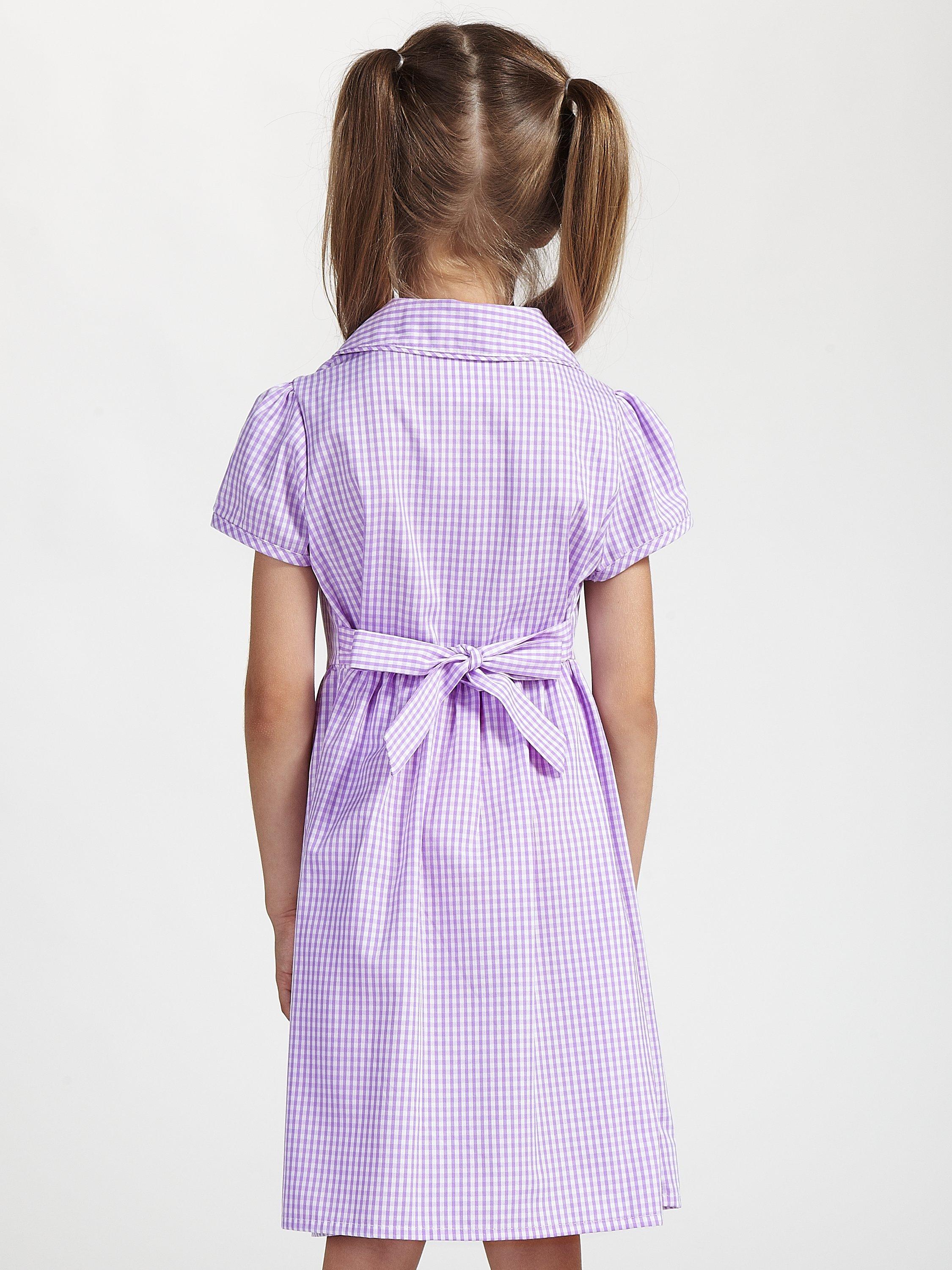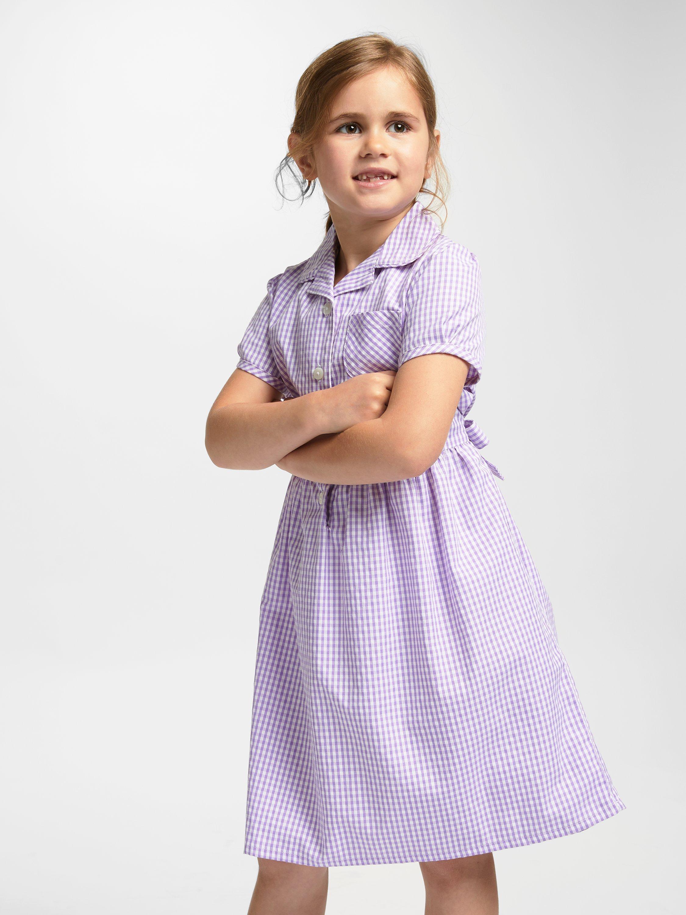 Displaying a classic gingham check pattern, our smart school summer dress has short sleeves, a front button fastening and small collar. The slim tie belt gives the dress shape and detail.