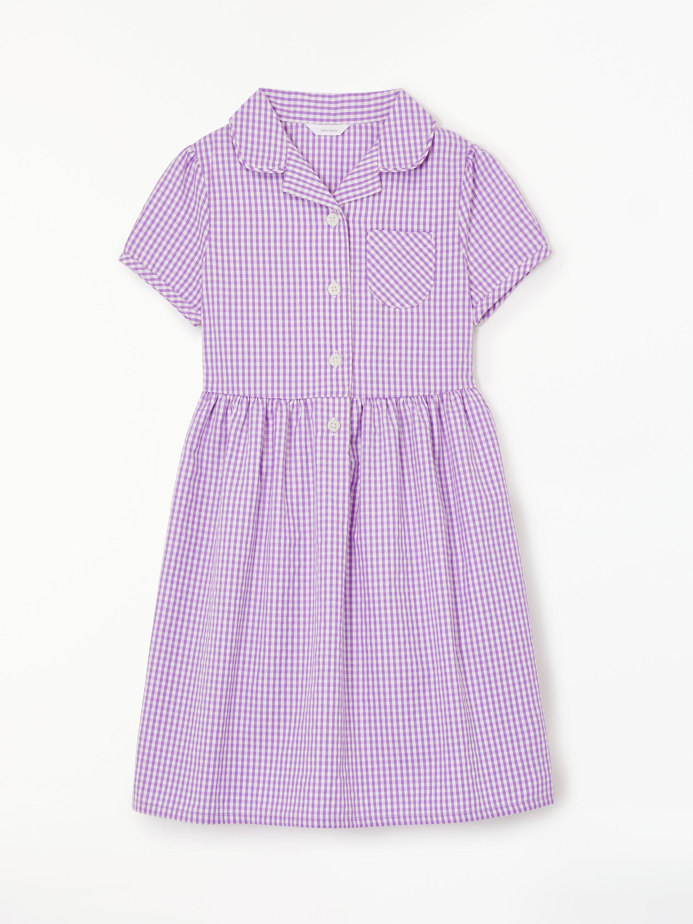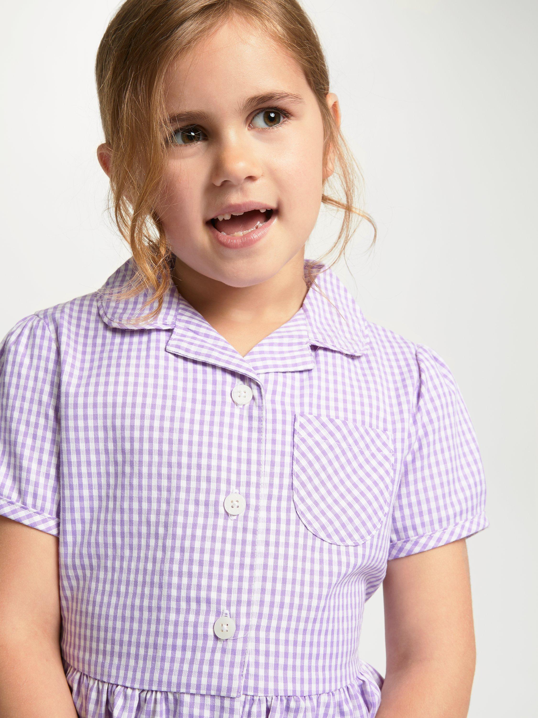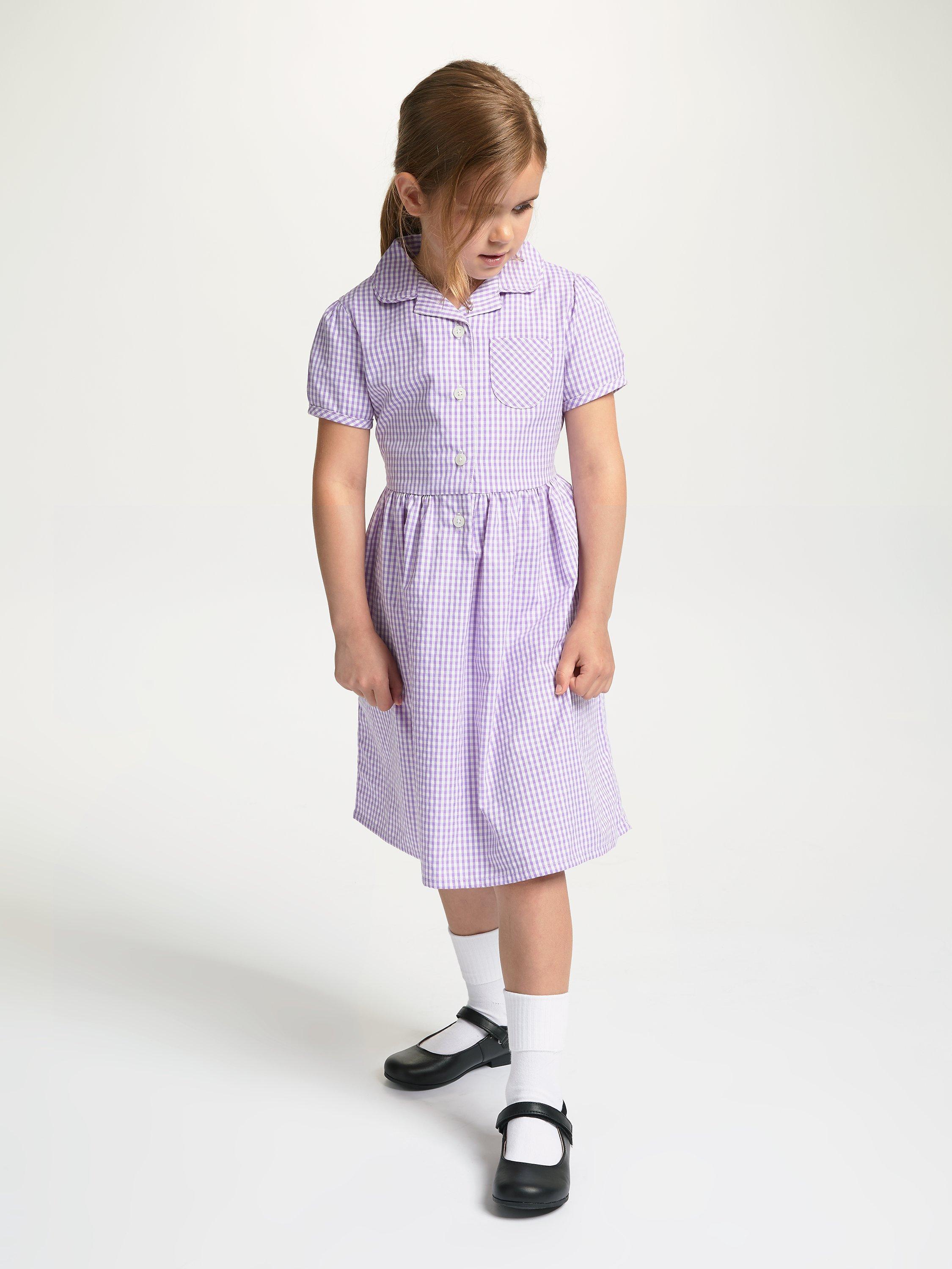 Displaying a classic gingham check pattern, our smart school summer dress has short sleeves, a front button fastening and small collar. The slim tie belt gives the dress shape and detail.