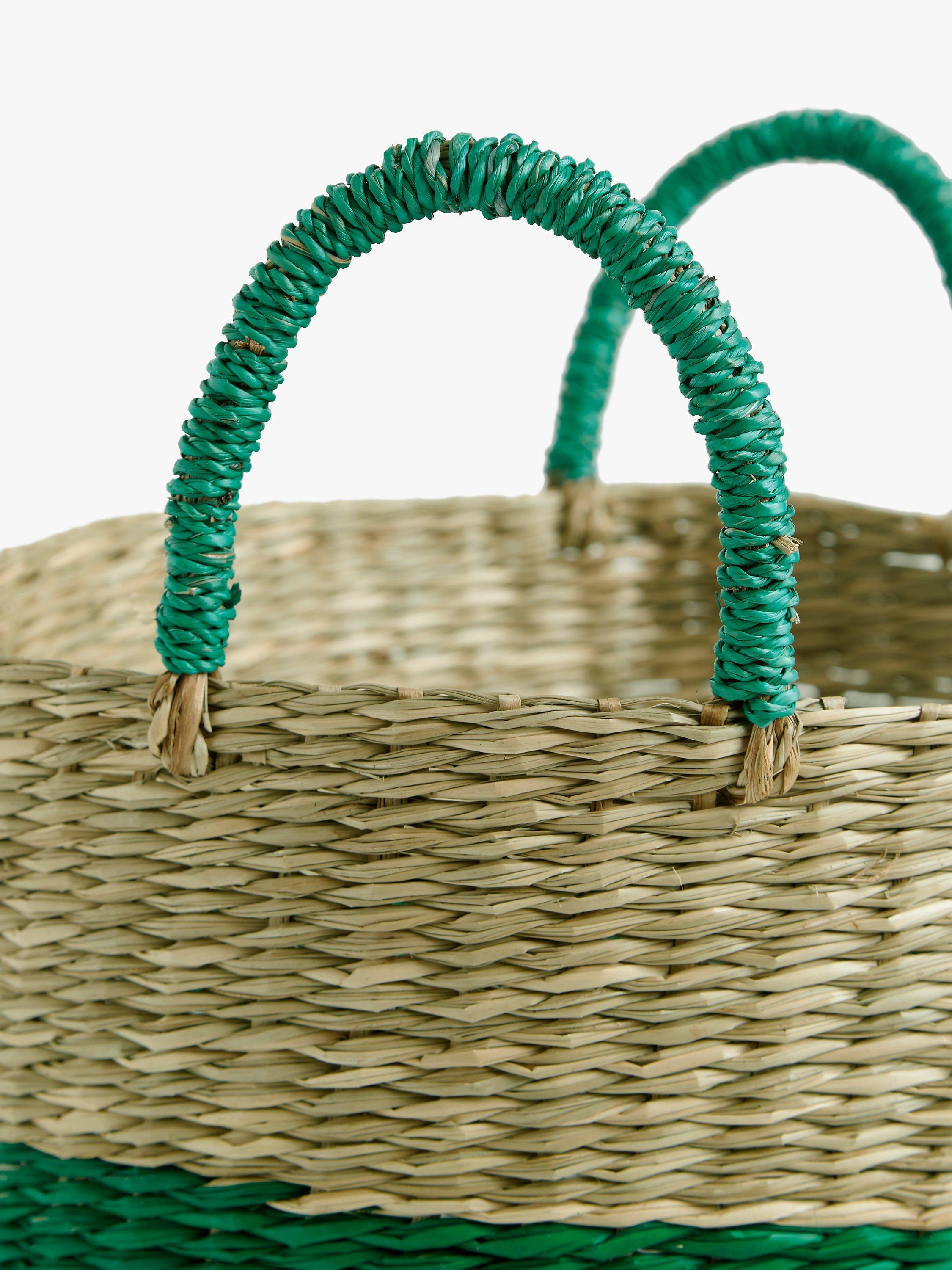 A basket with attractive coloured thirds. The top third is left untouched to show off the natural colour of the seagrass.