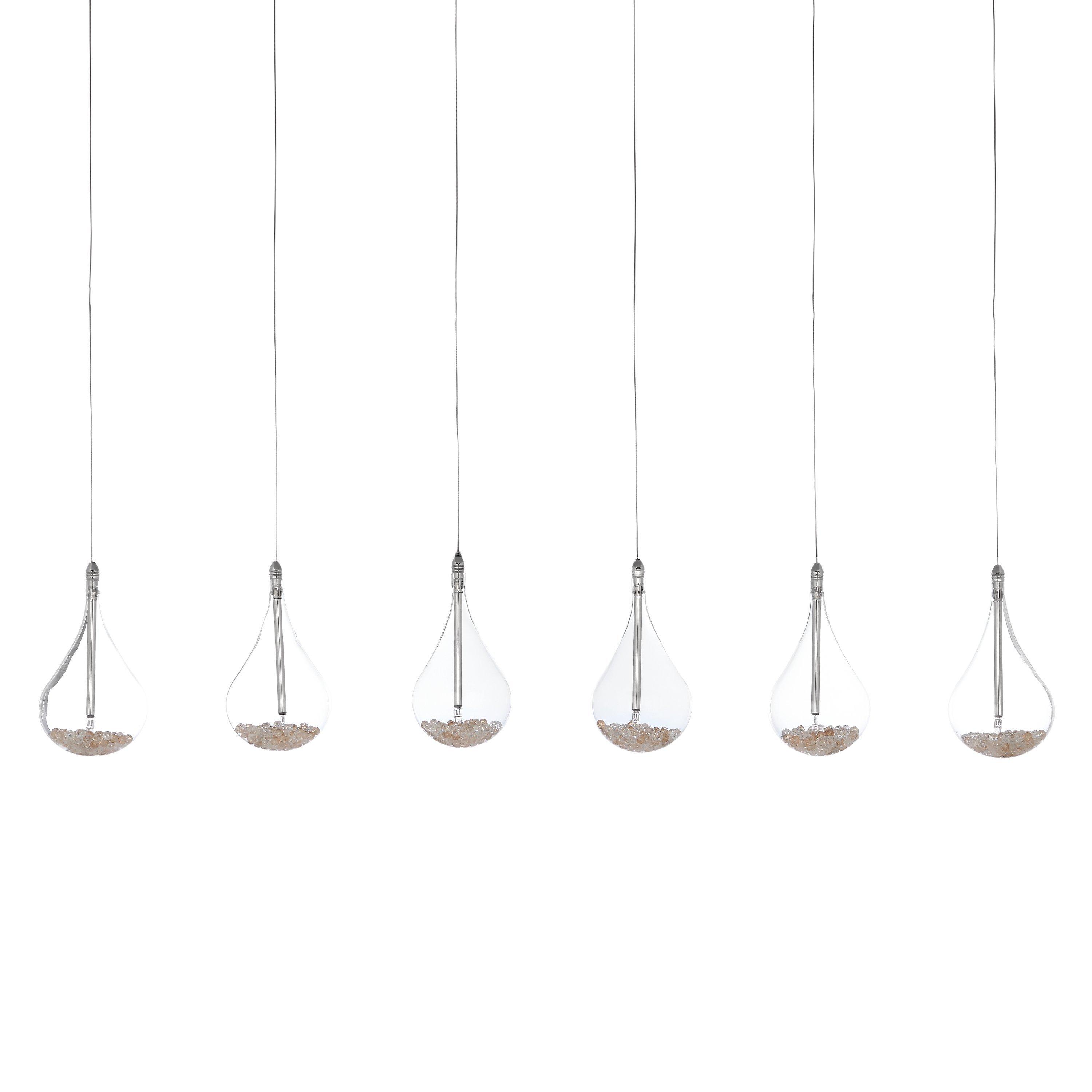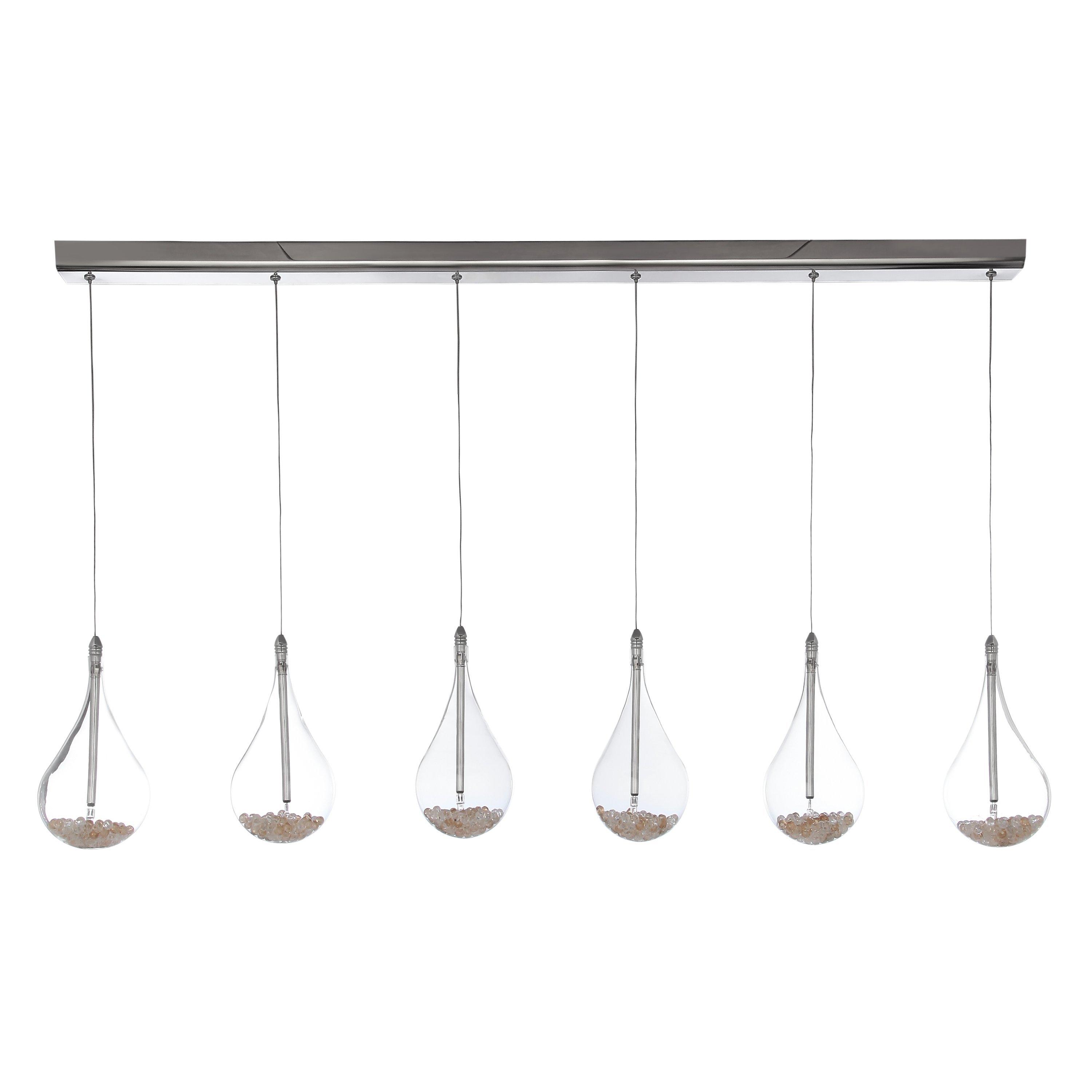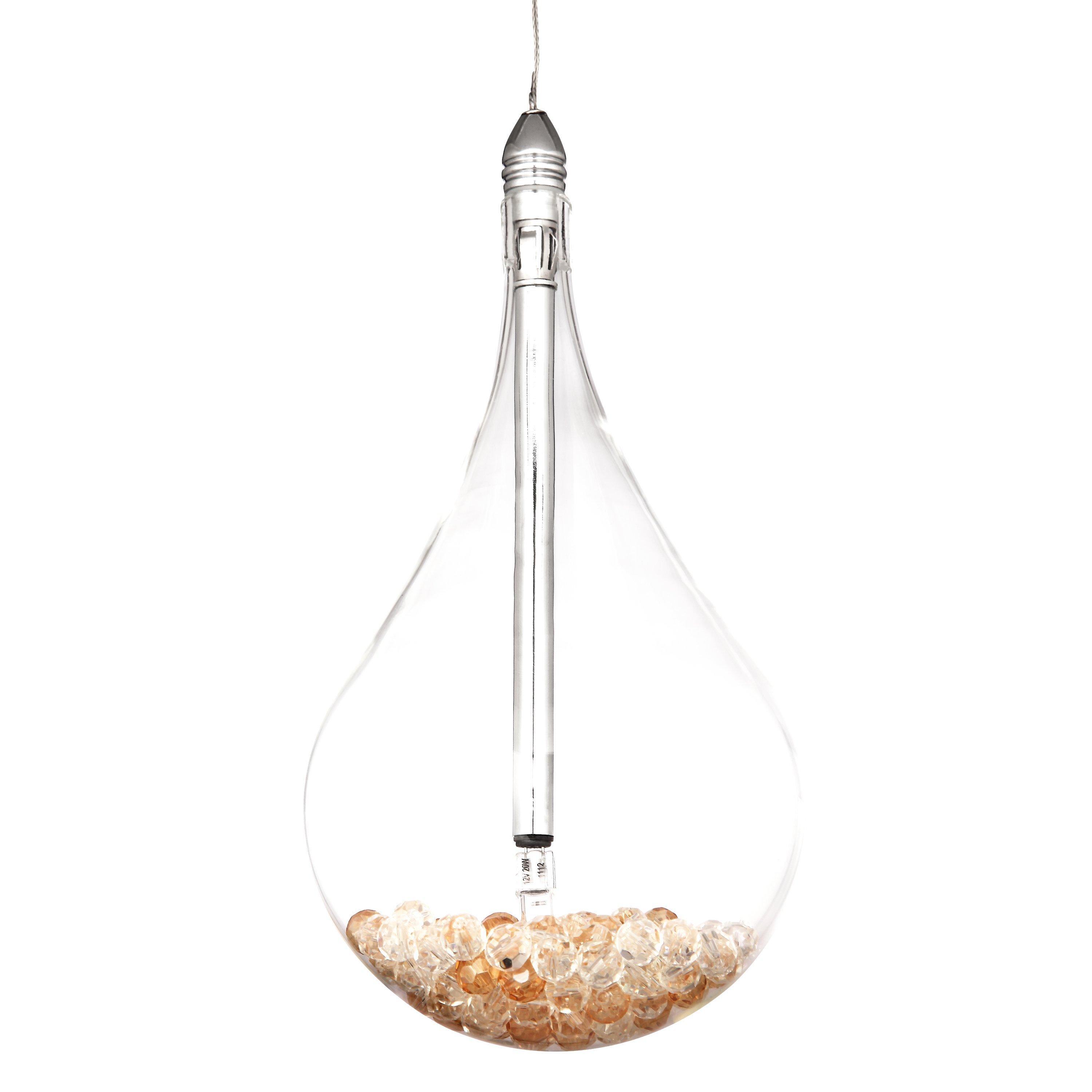 Hanging from a semi-flush plate dangle six glass tear drops. Inside each there is a dusting of amber and clear crystal beads for added drama. The beads capture the light and conceal the bulb when looking from below the fixture.