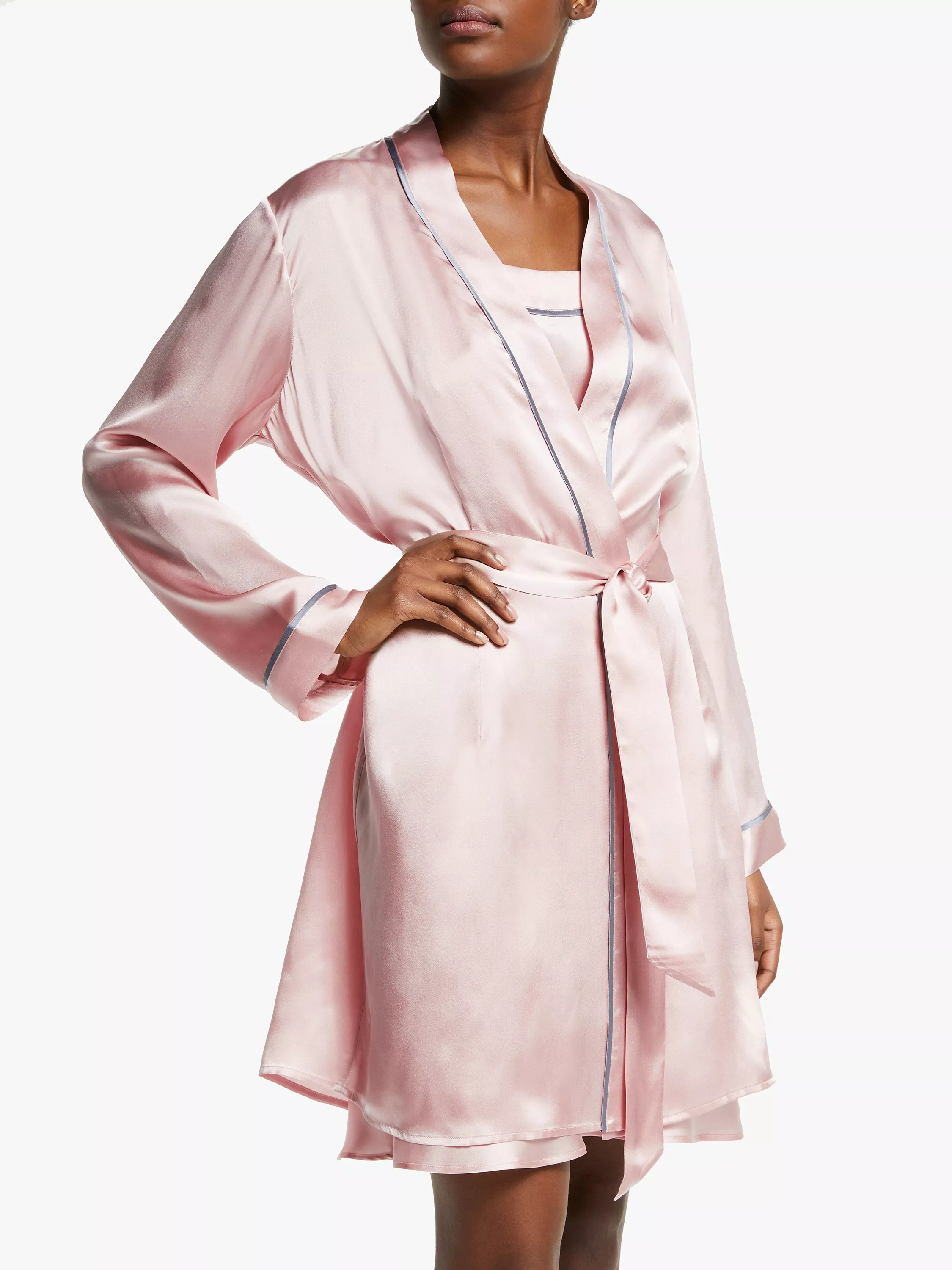 Soft to the touch with a smooth and wonderful lustre, this indulgent piece features contrast piping to the neck and cuffs complete with a tie at the waist to fasten. Drape yours over our coordinating pieces.