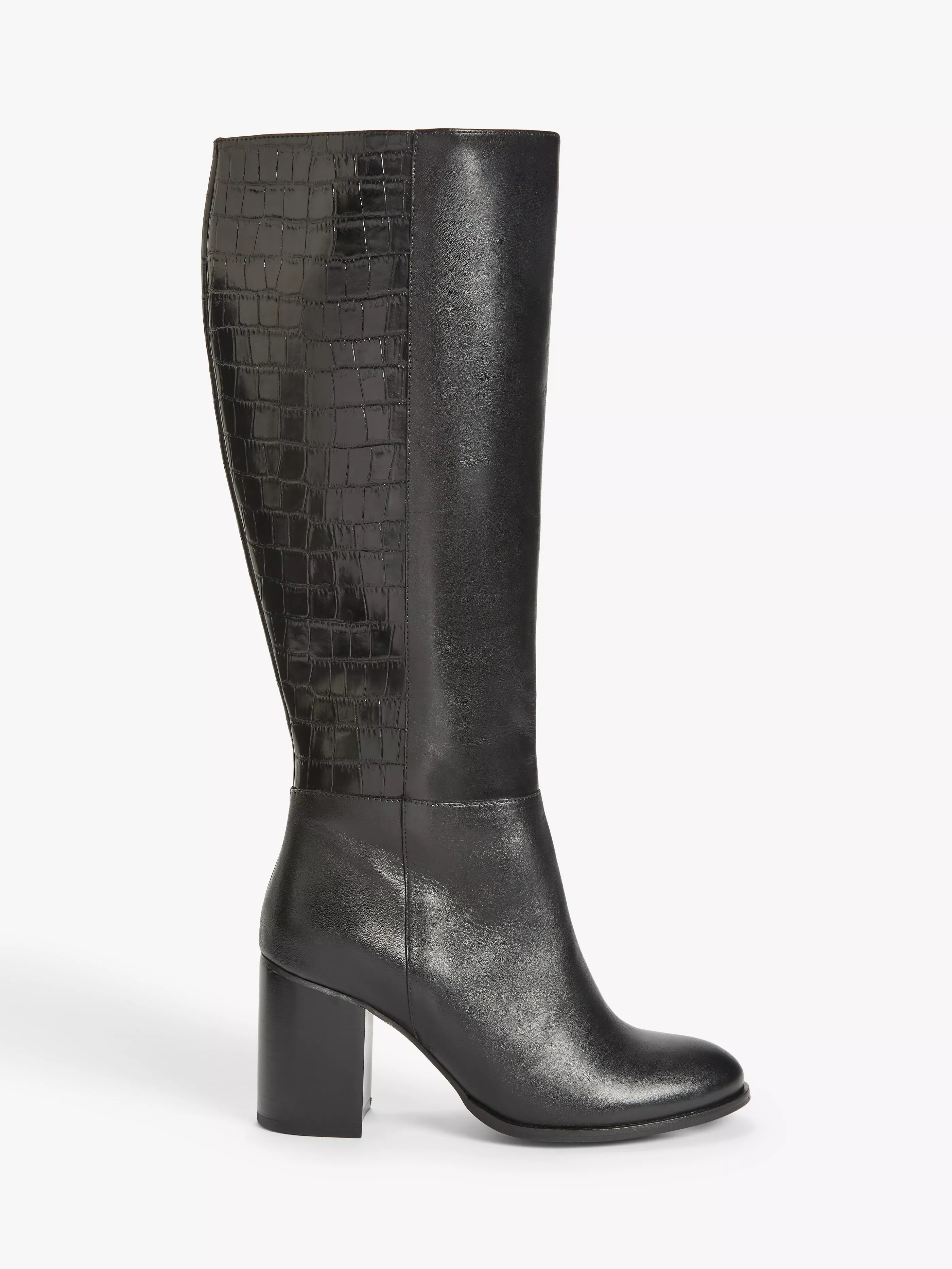 Featuring an interesting combination of smooth soft black leather and a tonal embossed oversized croc texture, the boots have a softly curved topline for a flattering finish and a mid-height stacked heel. A full-length zip allows for hassle-free wear.