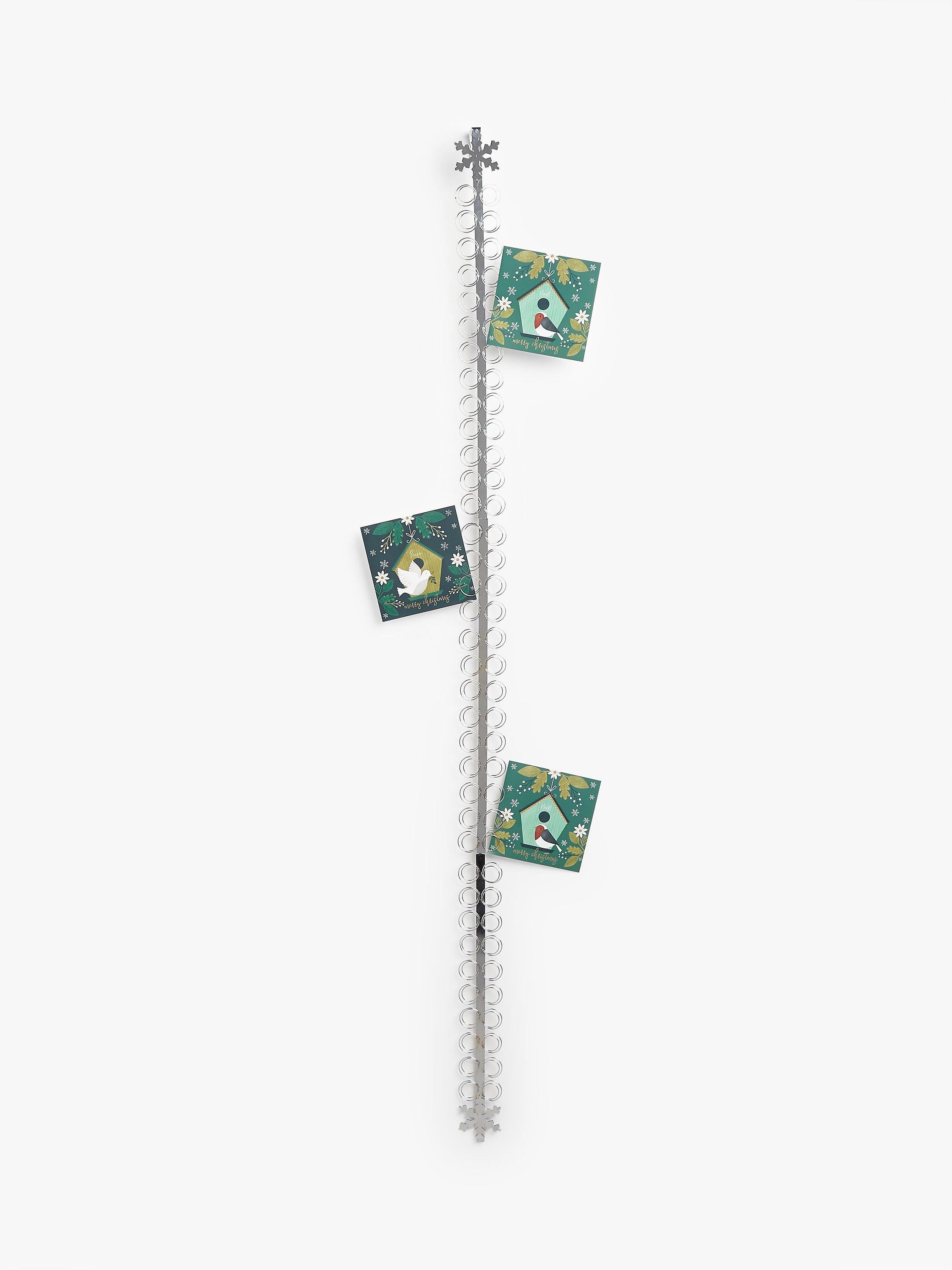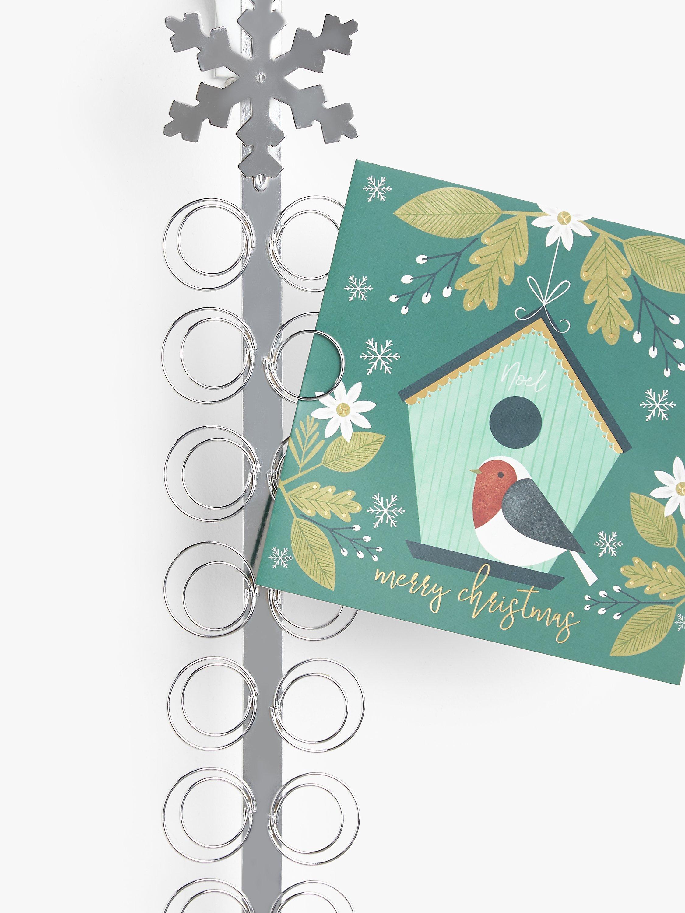 This silver snowflake card holder simply sits over your door and will hold up to 72 cards.