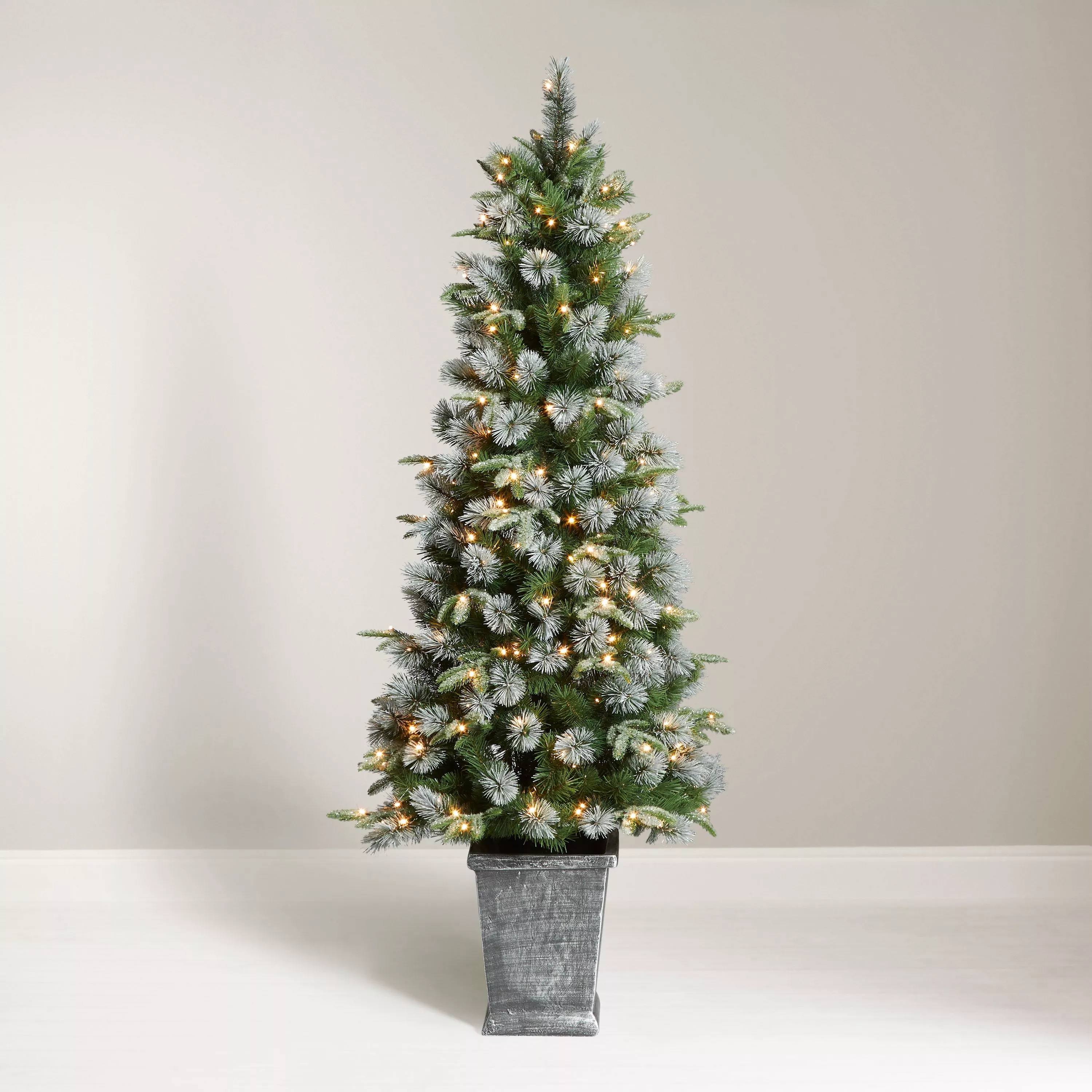 A compact, slimline artificial Christmas tree, pre-lit with 100 pure white LEDs.
