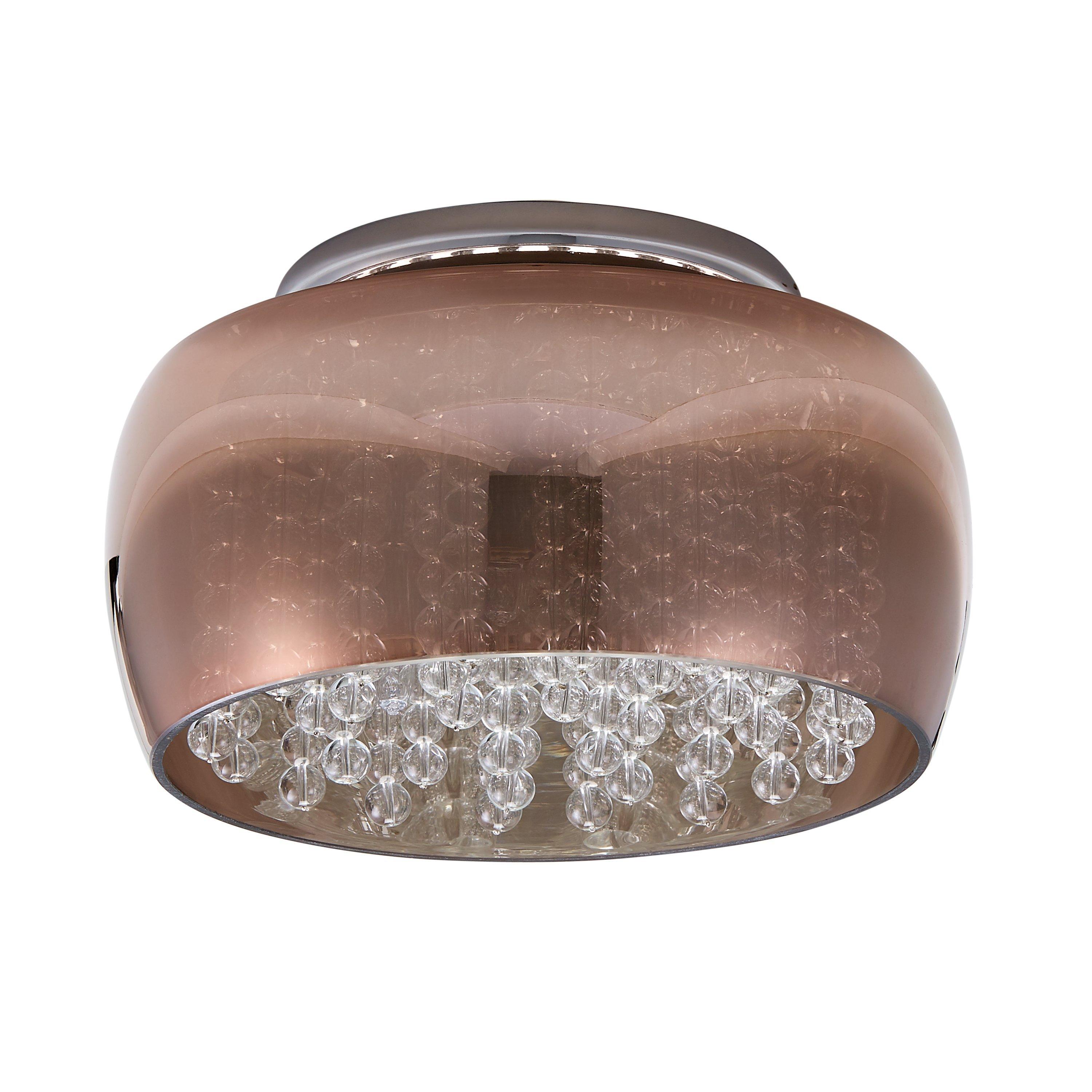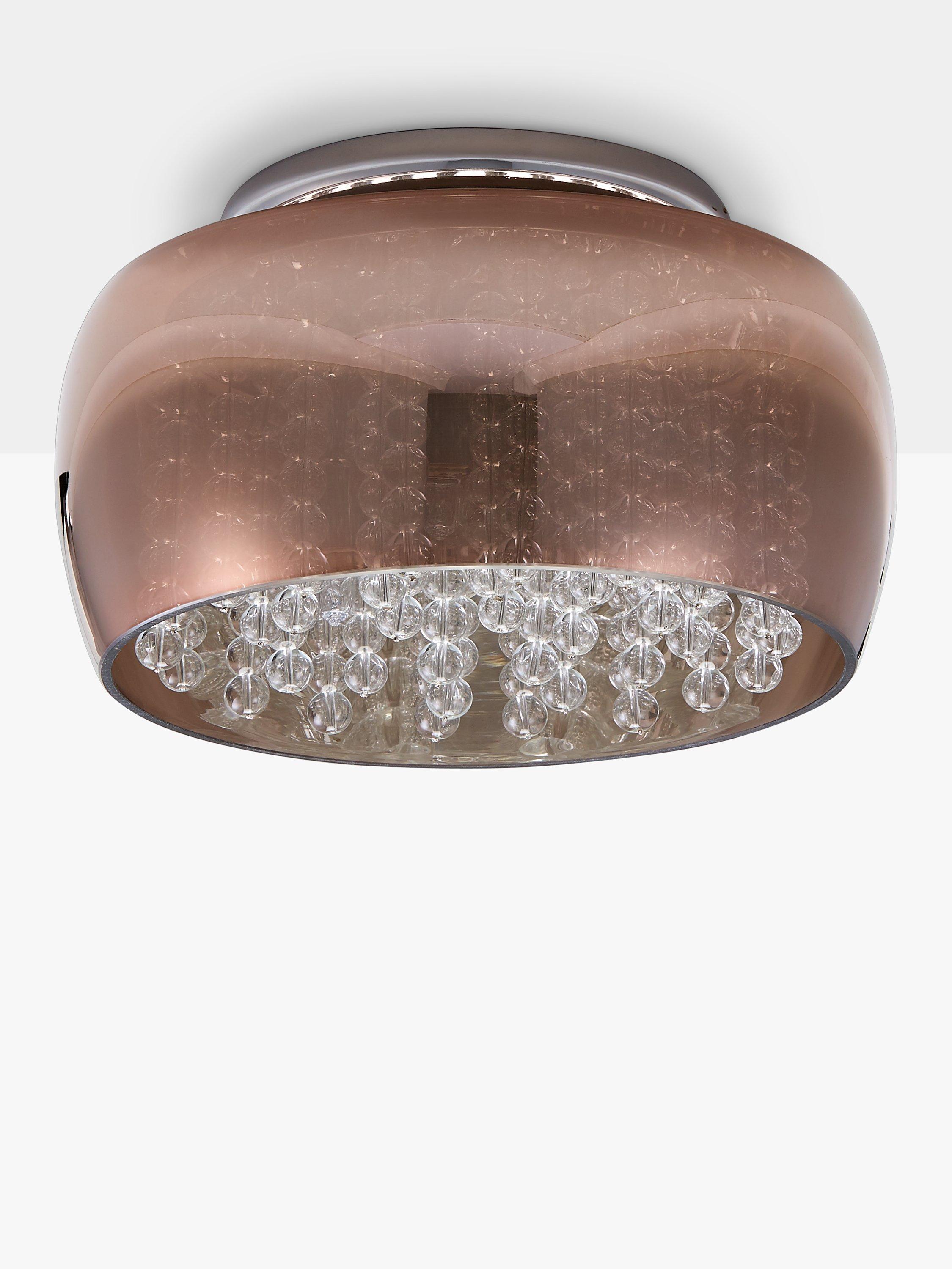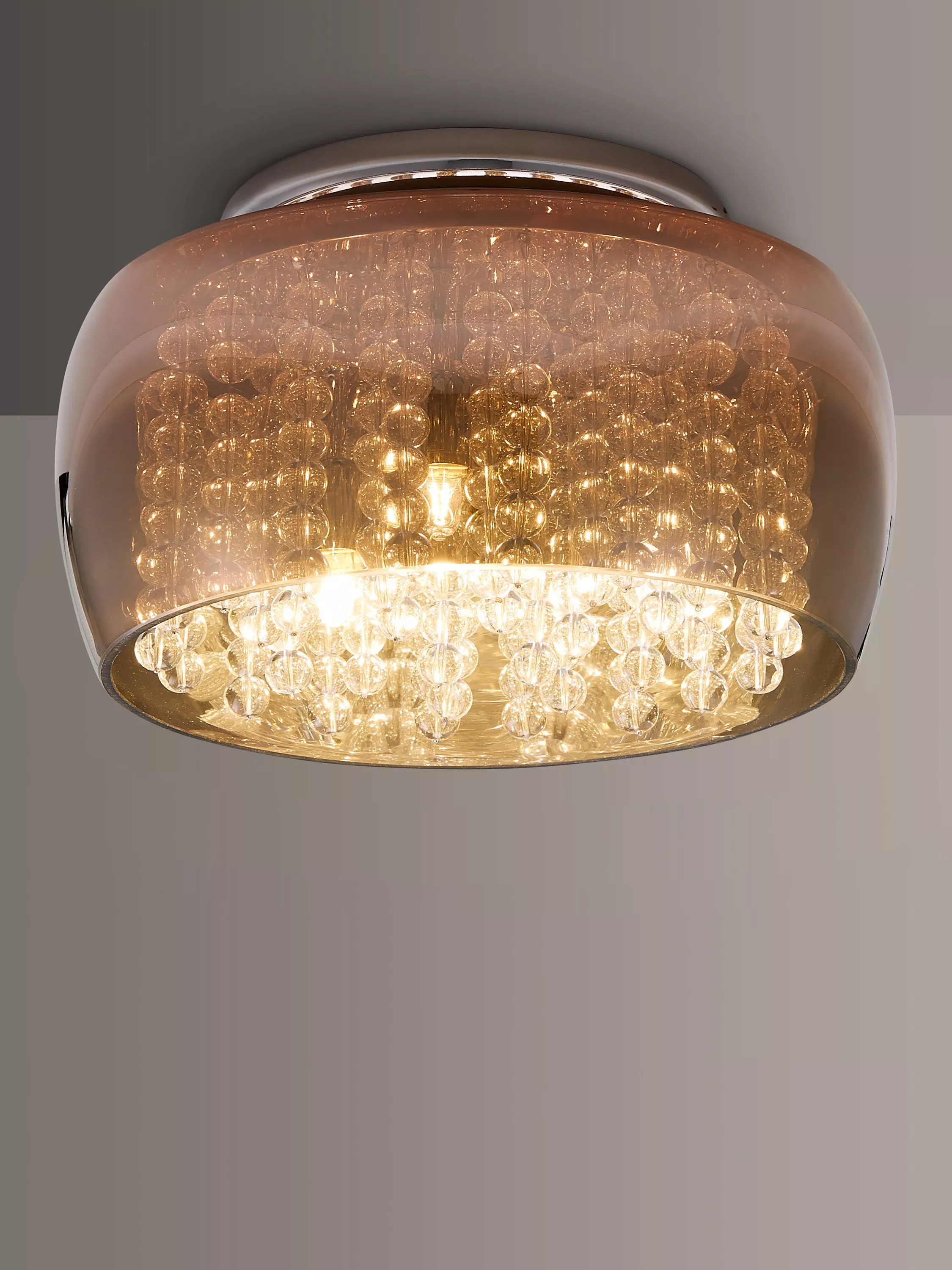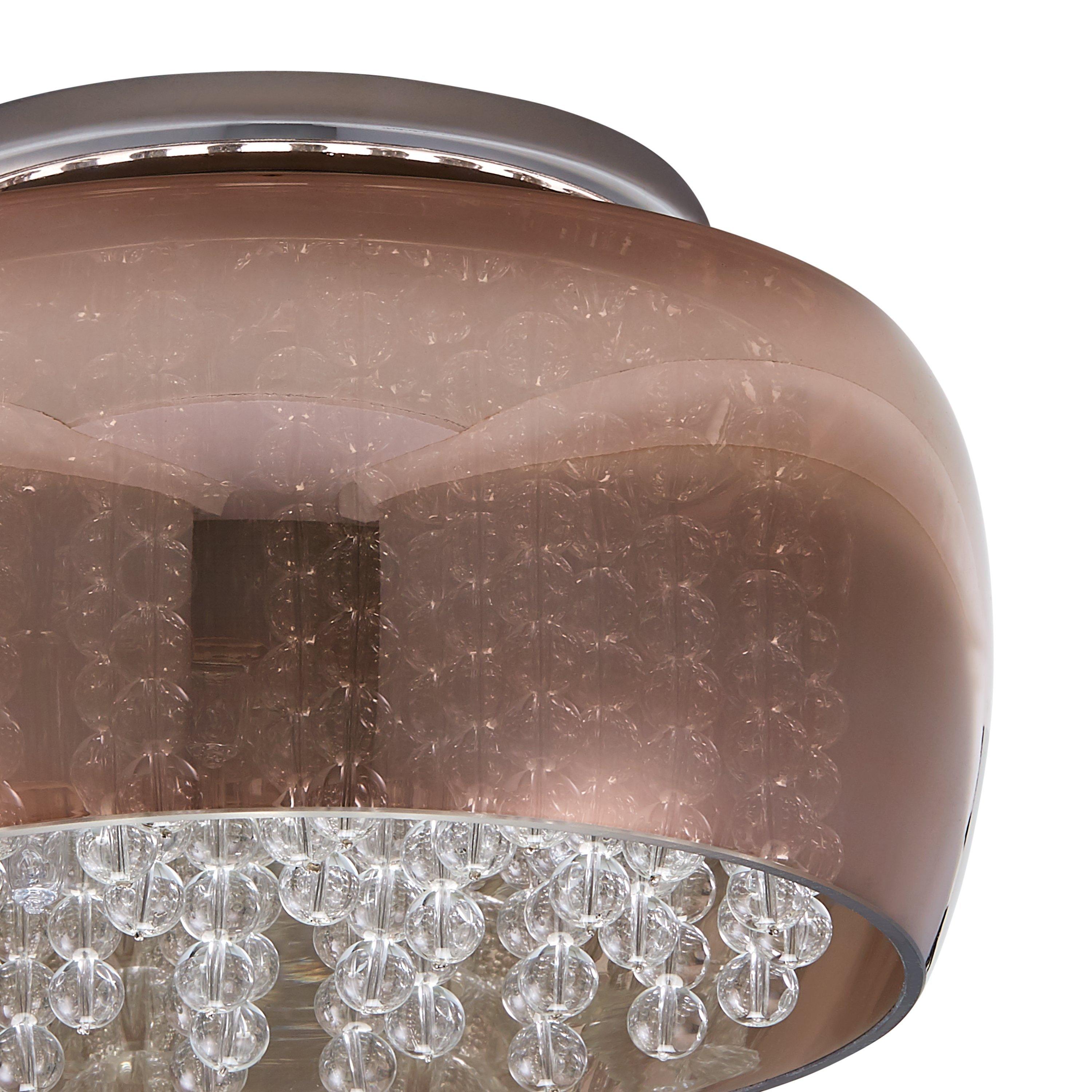 Style your living space or bedroom with our Stella ceiling light. This modern semi-flush fitting offers two different looks. When switched off, the warm copper glass shade and chrome finish lends a refined, minimalist feel. When switched on, the delicate inner beads become visible to create an ambient lighting effect.