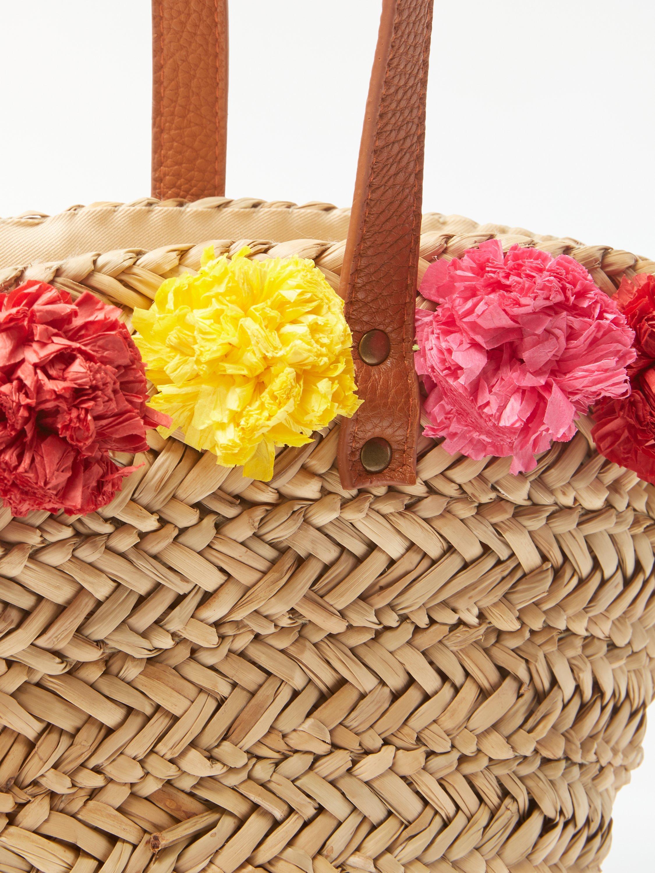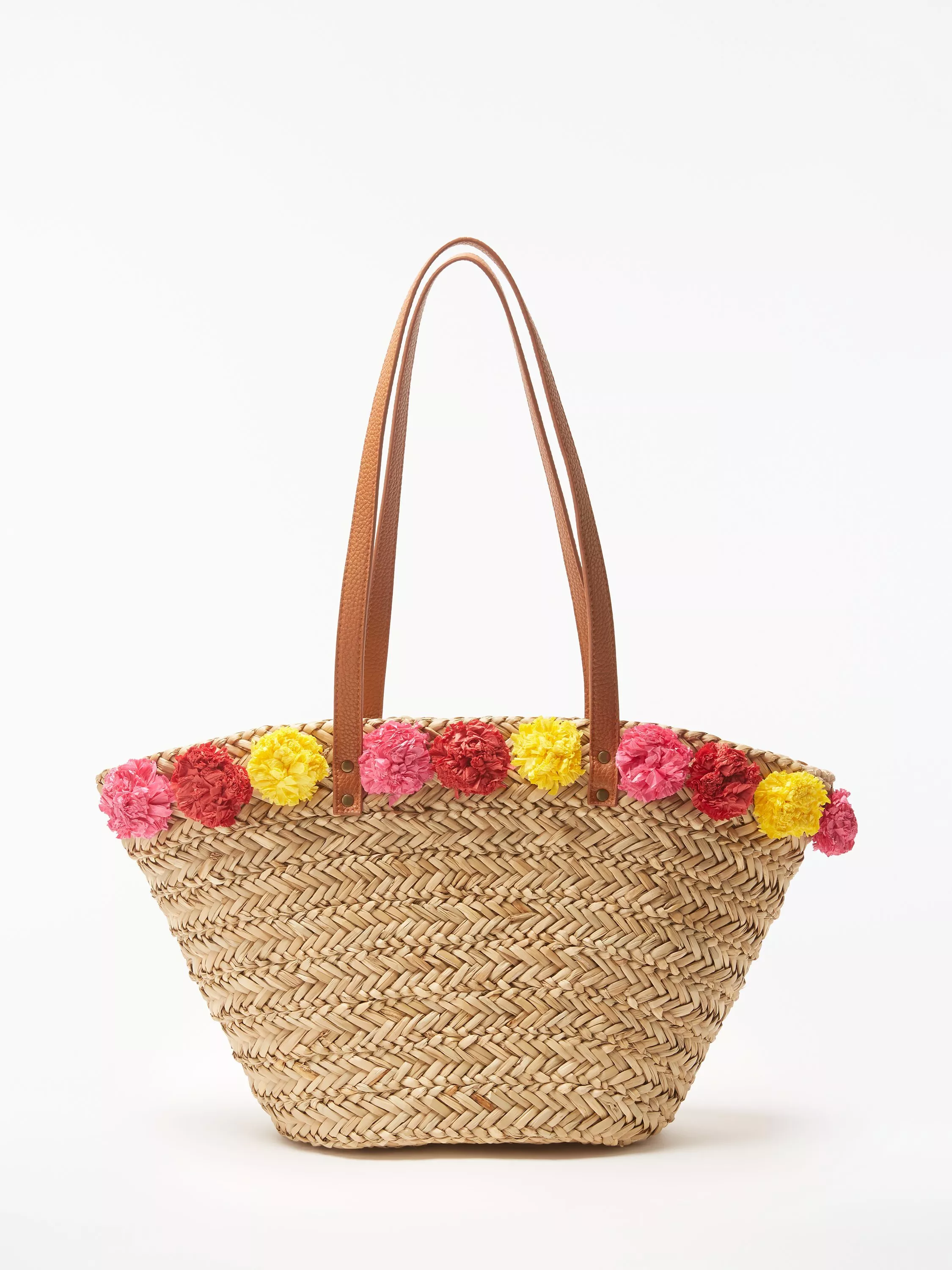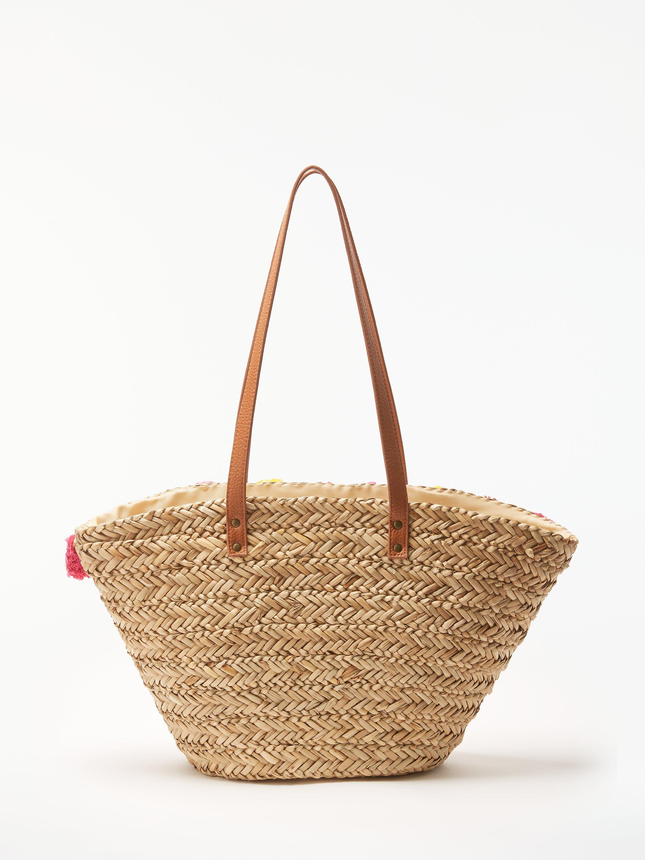Our sunny straw grab bag is decorated with colourful pom-poms and comes with a rustic straw finish.