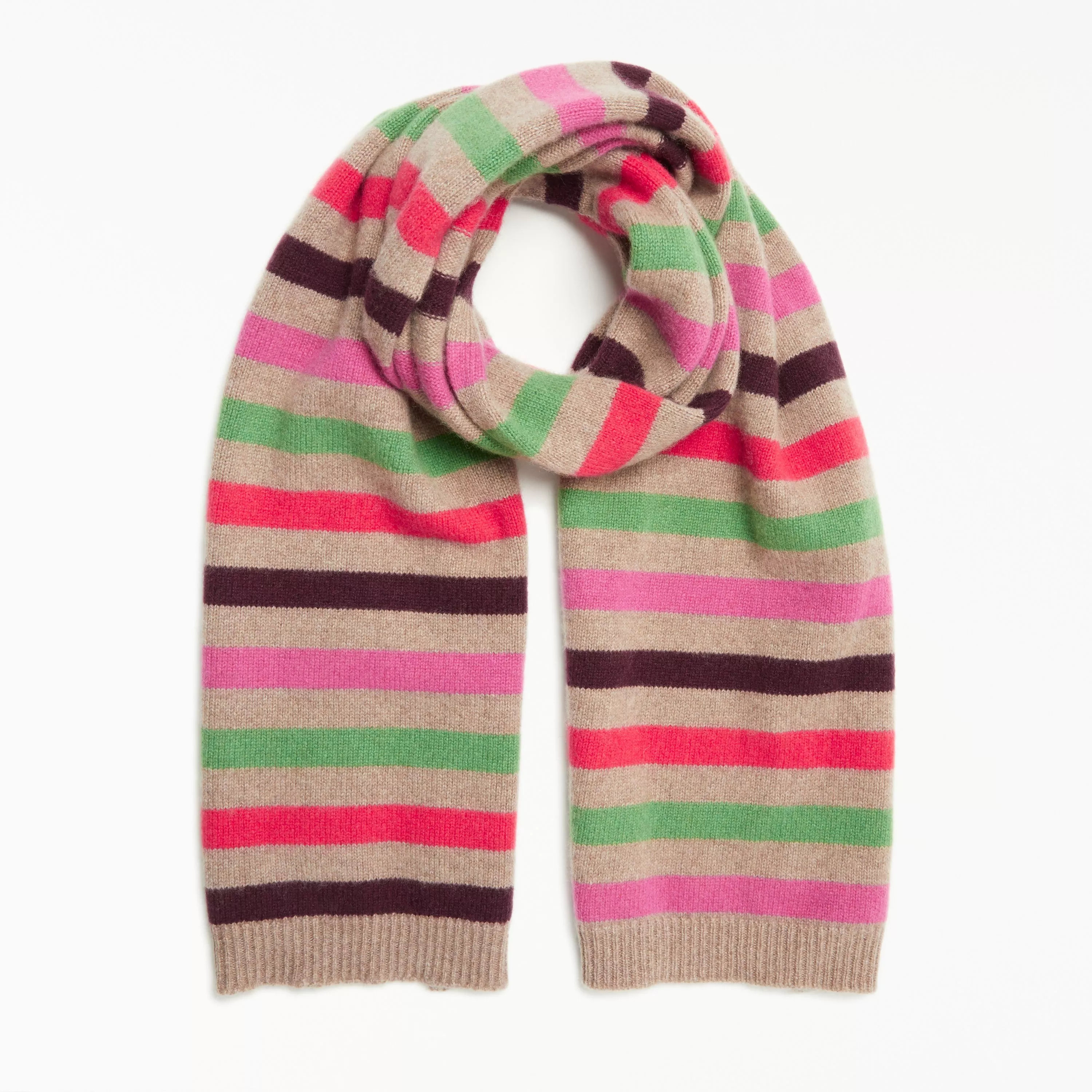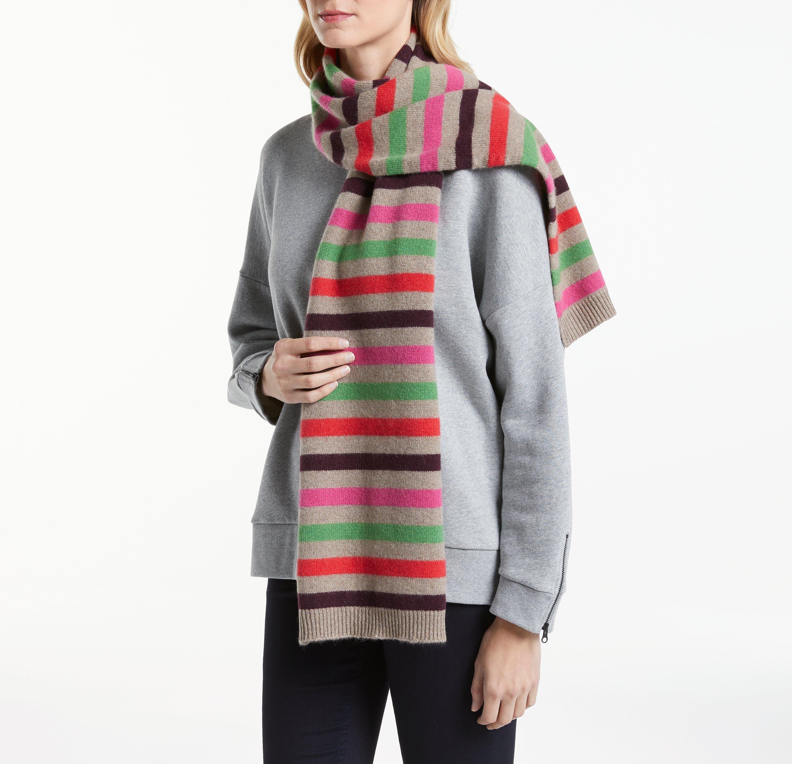 Made in Italy, the scarf comes in a premium cashmere texture and displays a directional horizontal stripe pattern in a contrasting colour pattern. The scarf is complete with a ribbed trim.