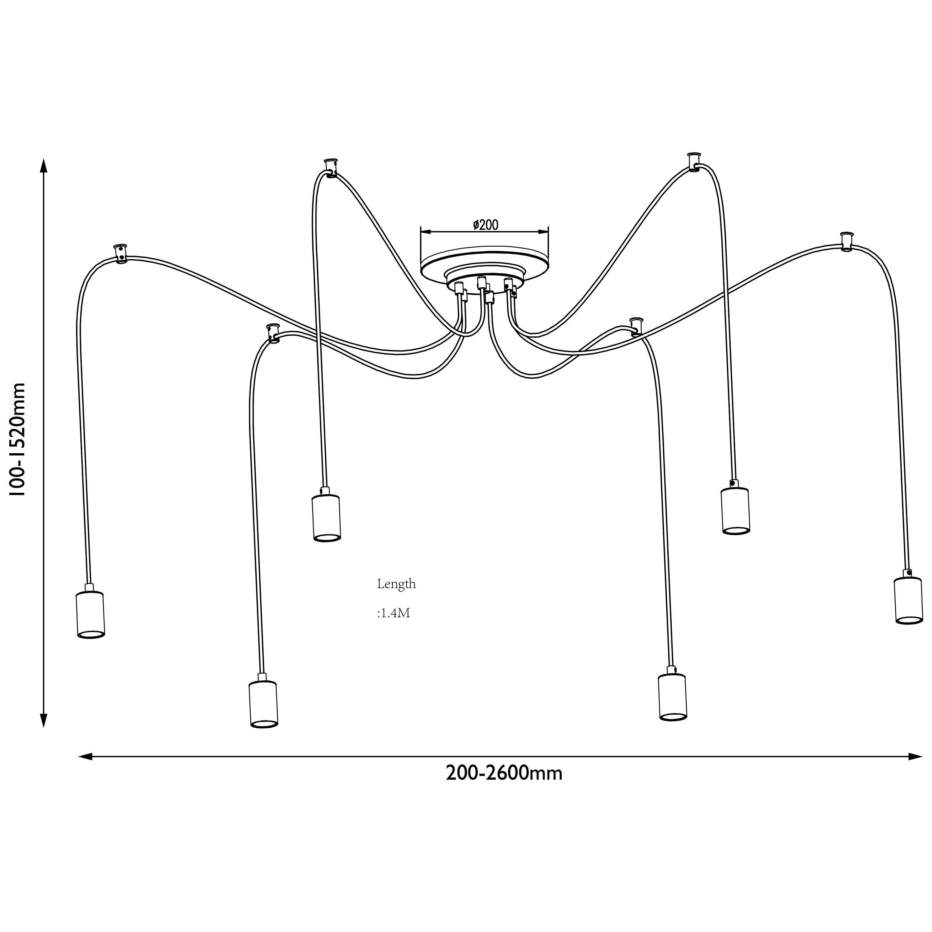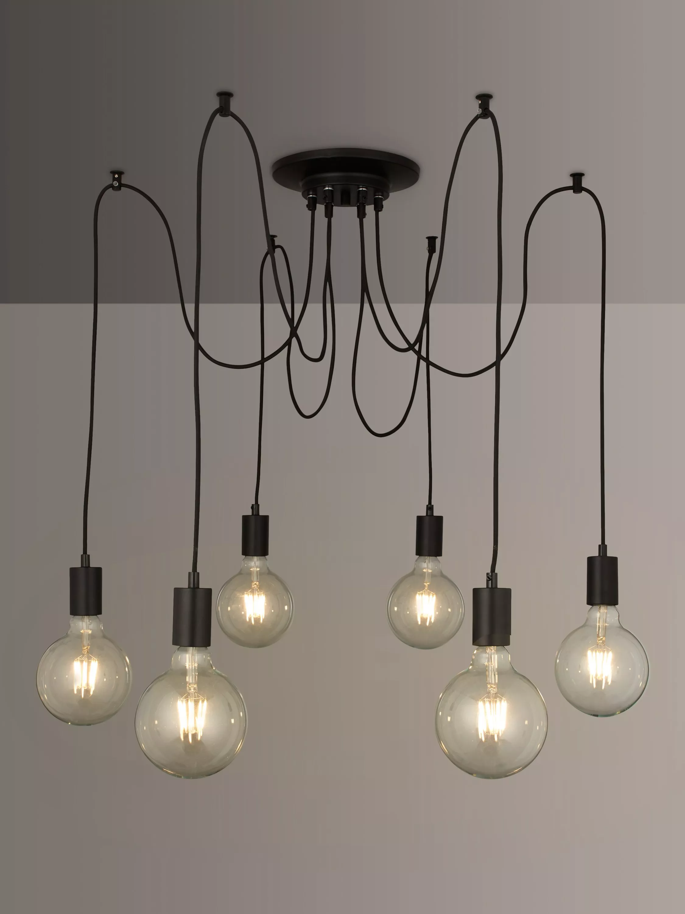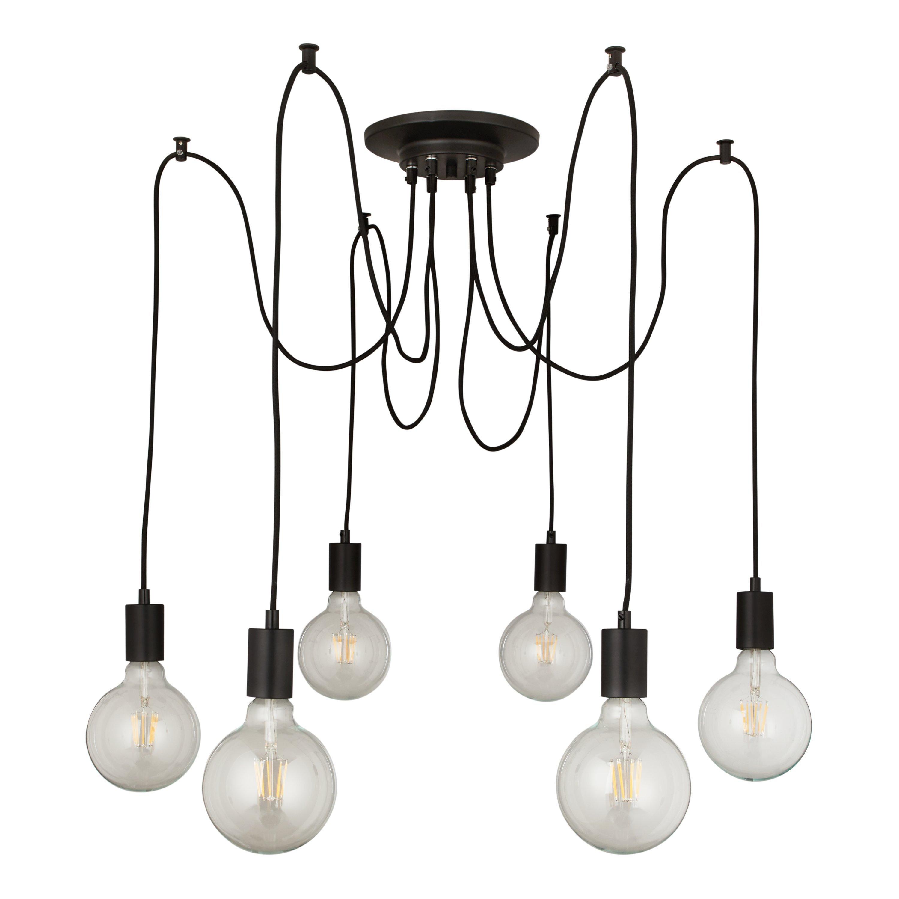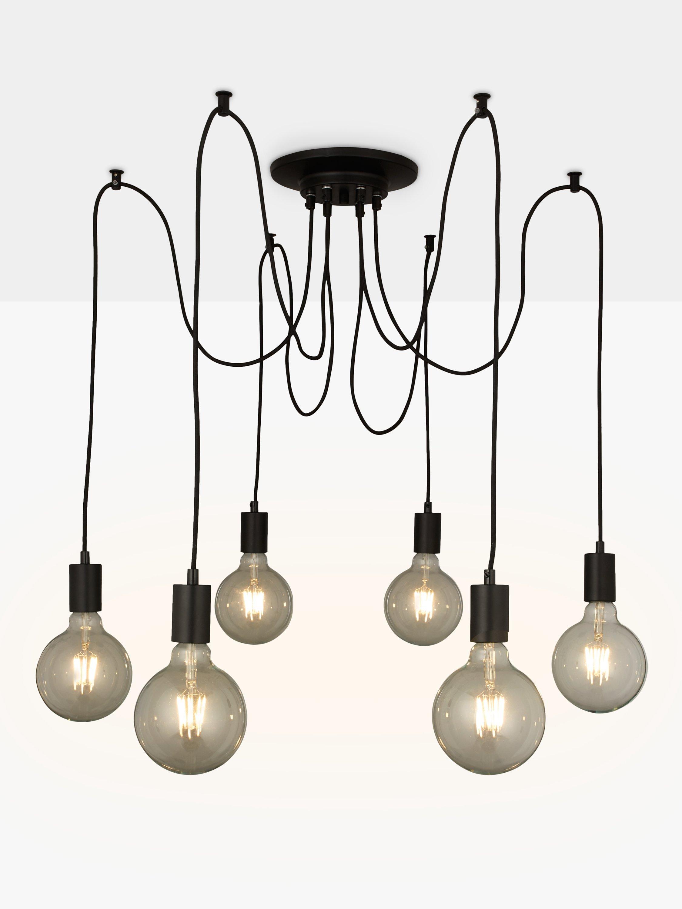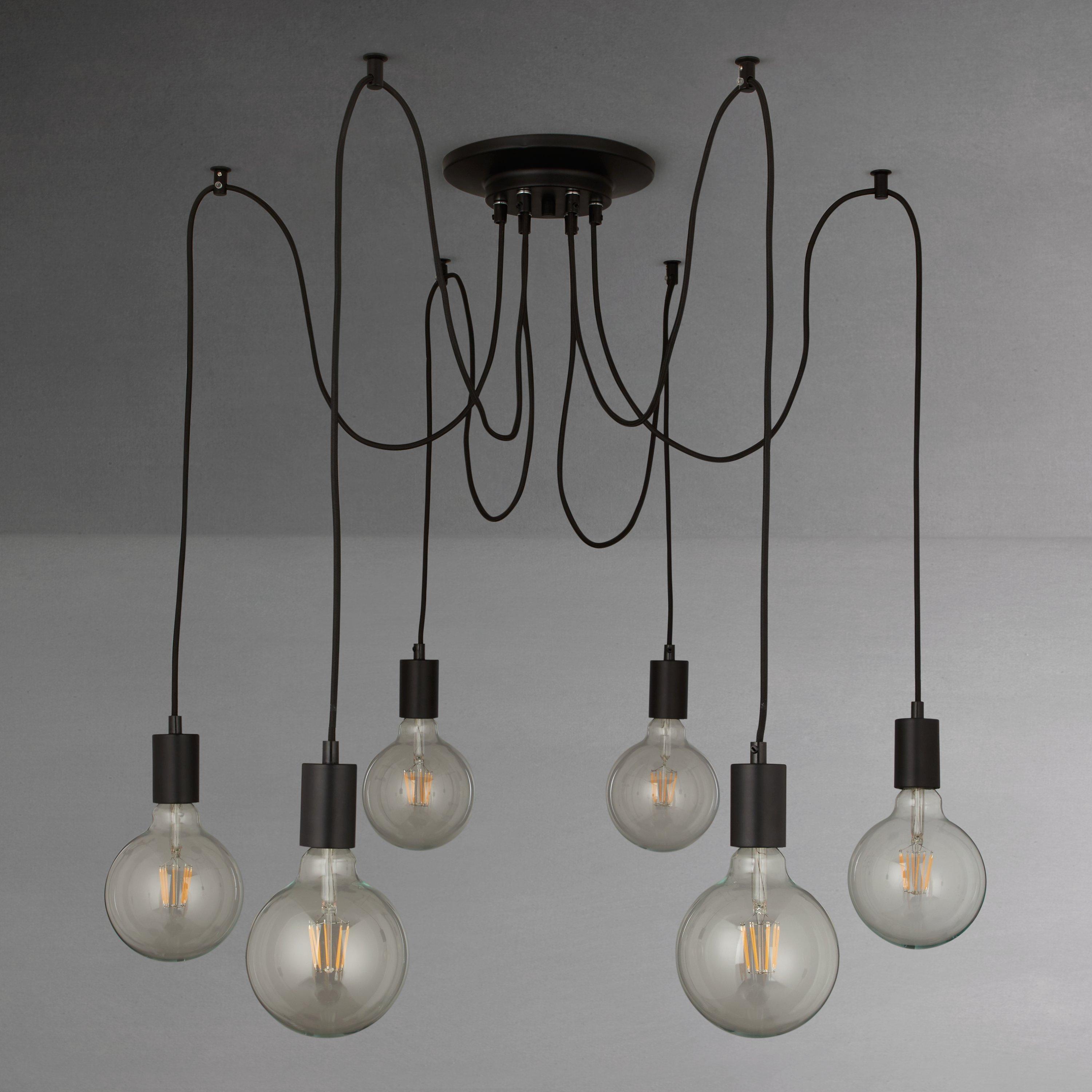 This eye-catching, modern pendant is a huge statement piece for your home. This on-trend multi-pendant design features 6 matt black lamp holders, suspended by braided black flexes, each with a large reach, allowing you to wash light over a vast area. Use with large filament bulbs to complete the industrial, minimalistic appearance.