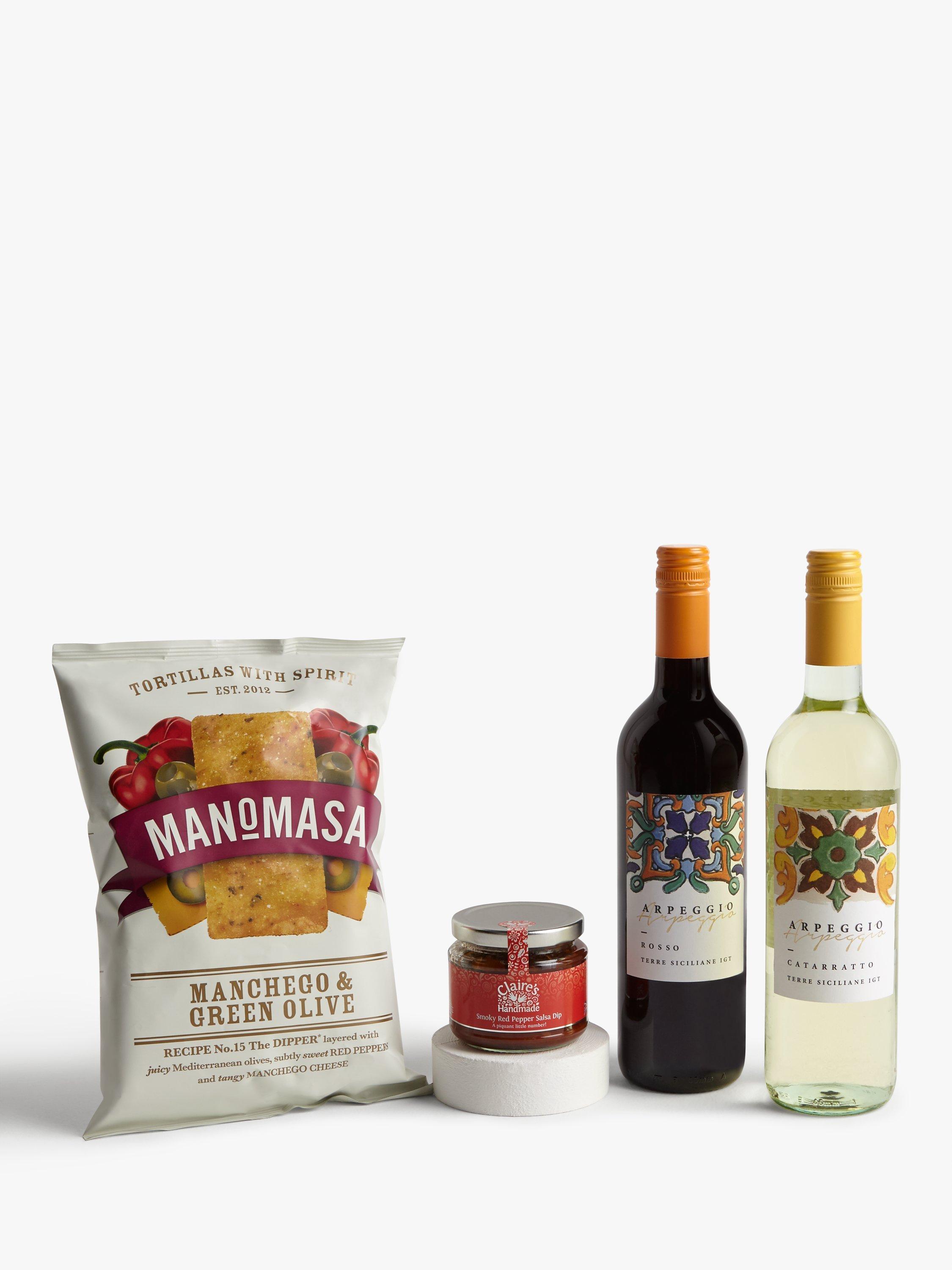 This great selection of wine and nibbles packs a host of punchy flavours including red pepper salsa dip, spicy peanuts and Manchego & Green Olive tortillas.