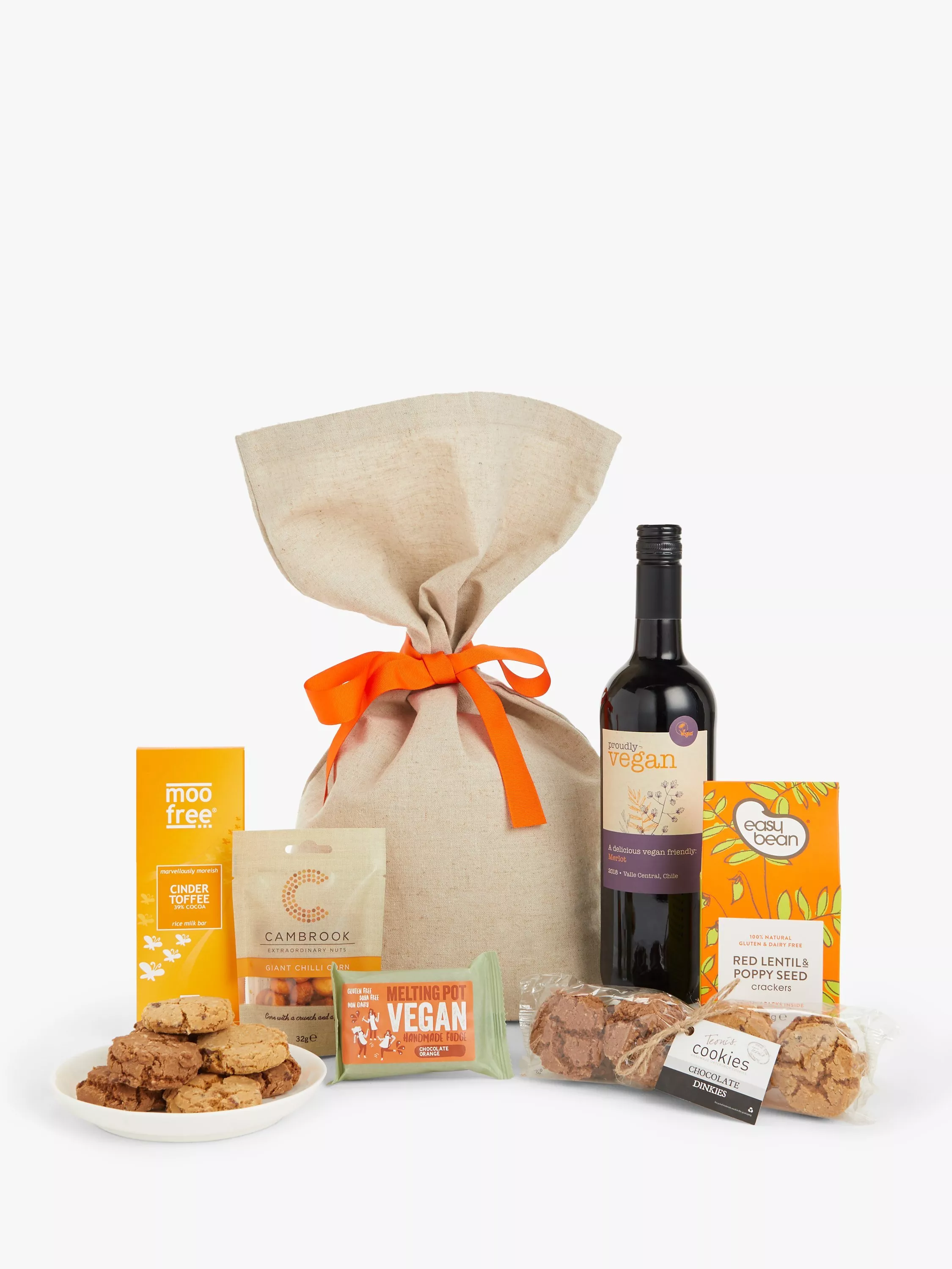 Filled with delicious vegan goodies, this canvas sack includes a bottle of Merlot, giant chilli corn and yummy chocolate orange fudge.