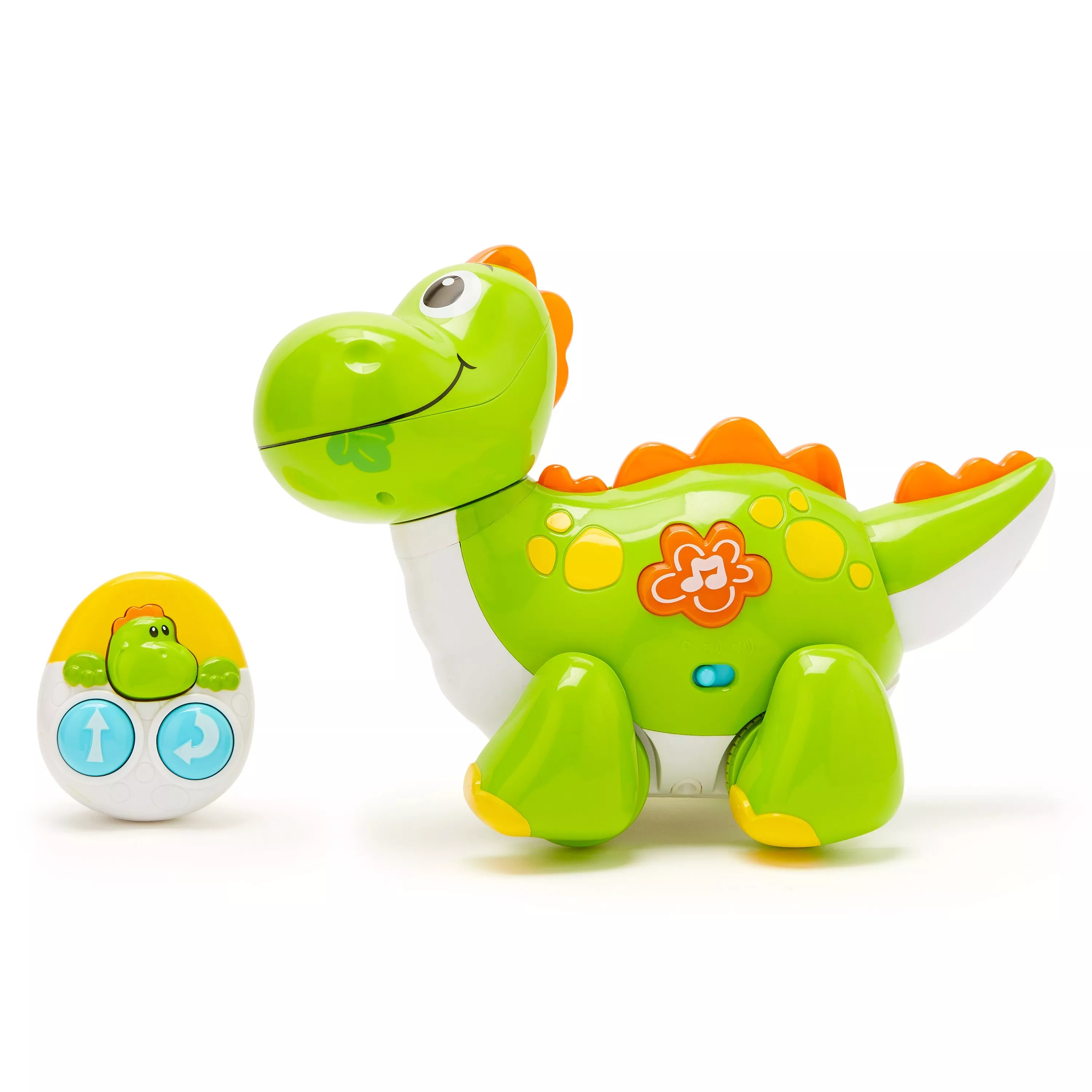 Using the separate remote control, see Dino, your friendly musical monster wag its tail, shake its head and light up and play a tune at two different volume levels and an optional silent mode.