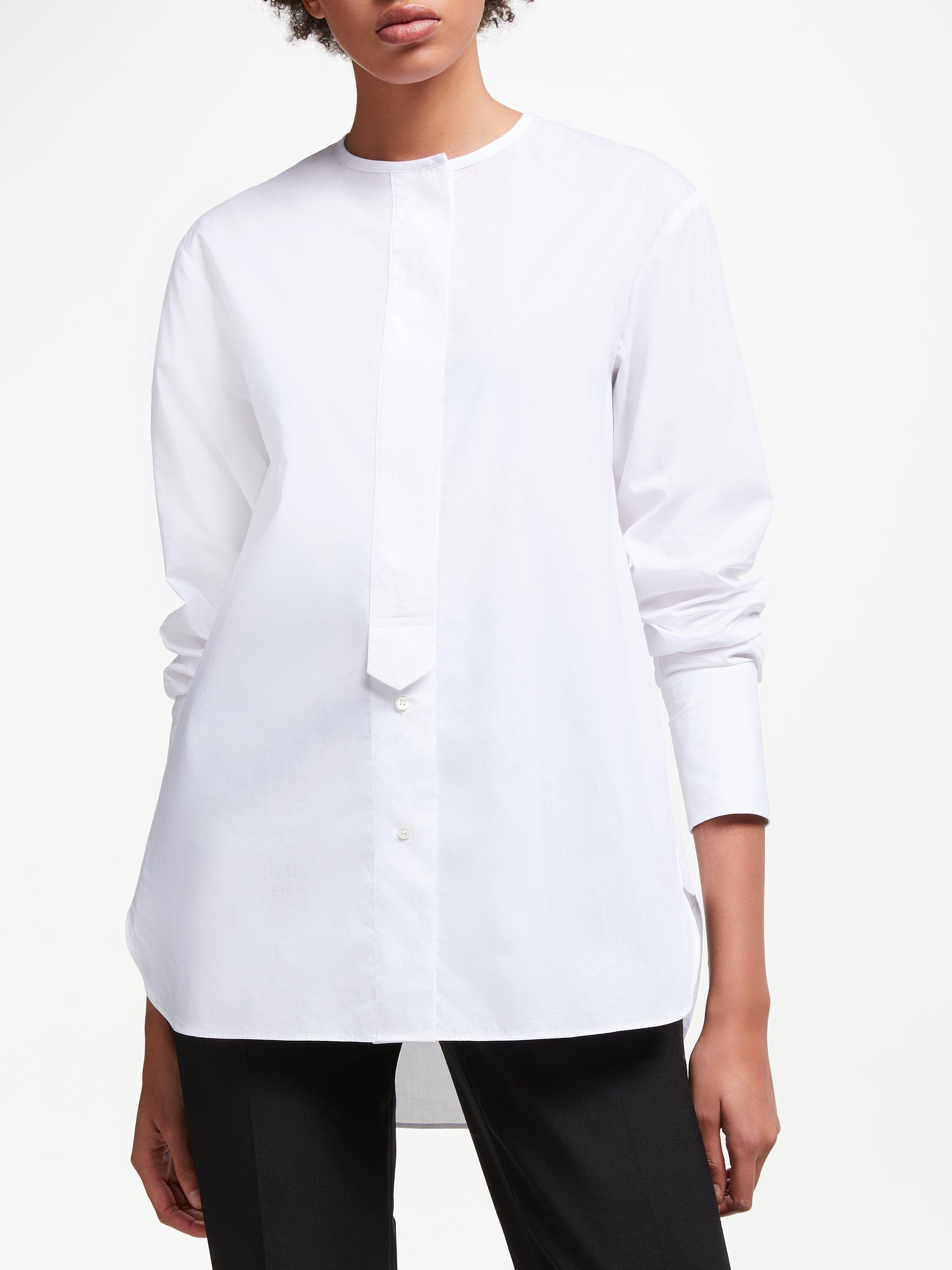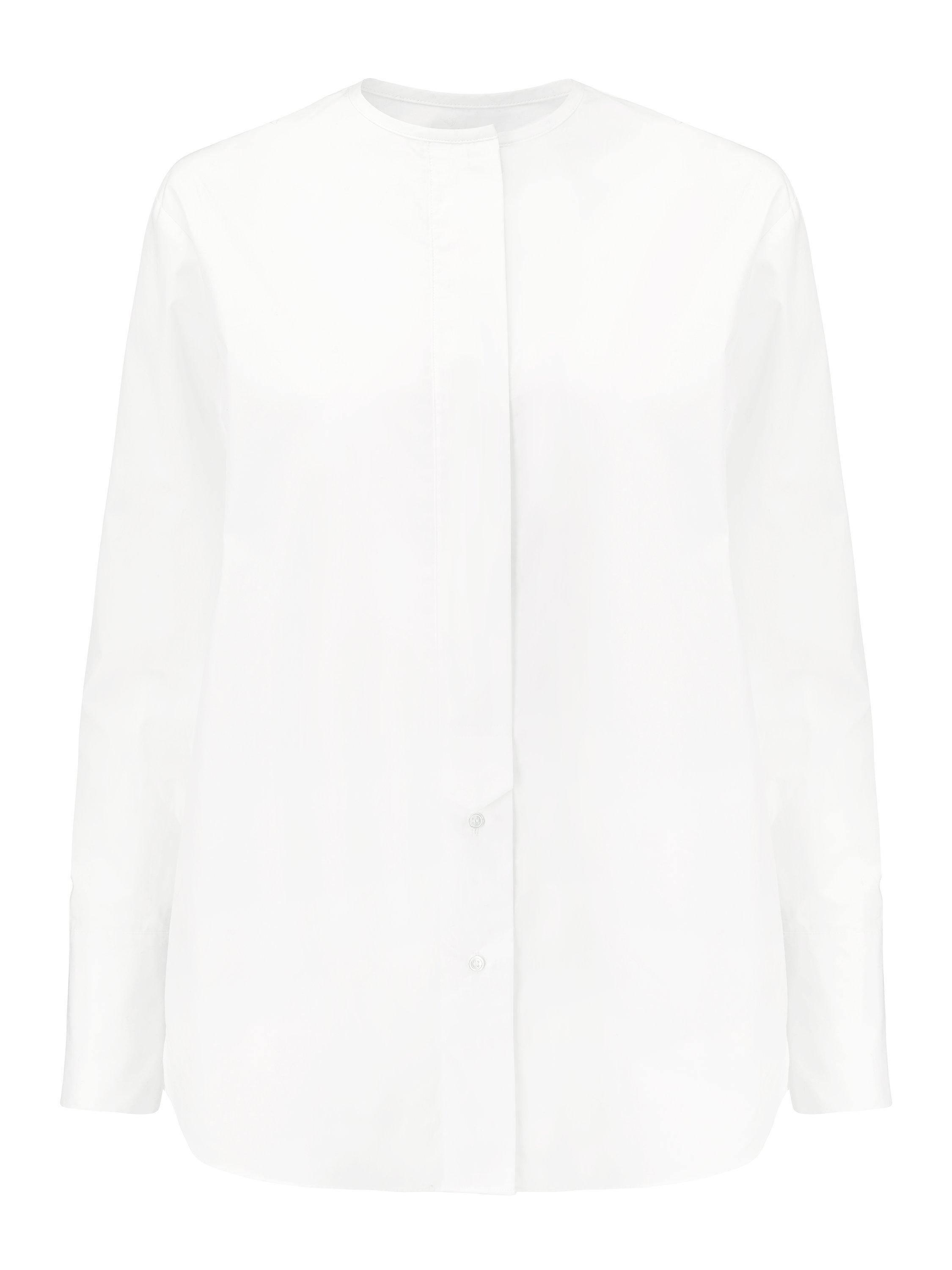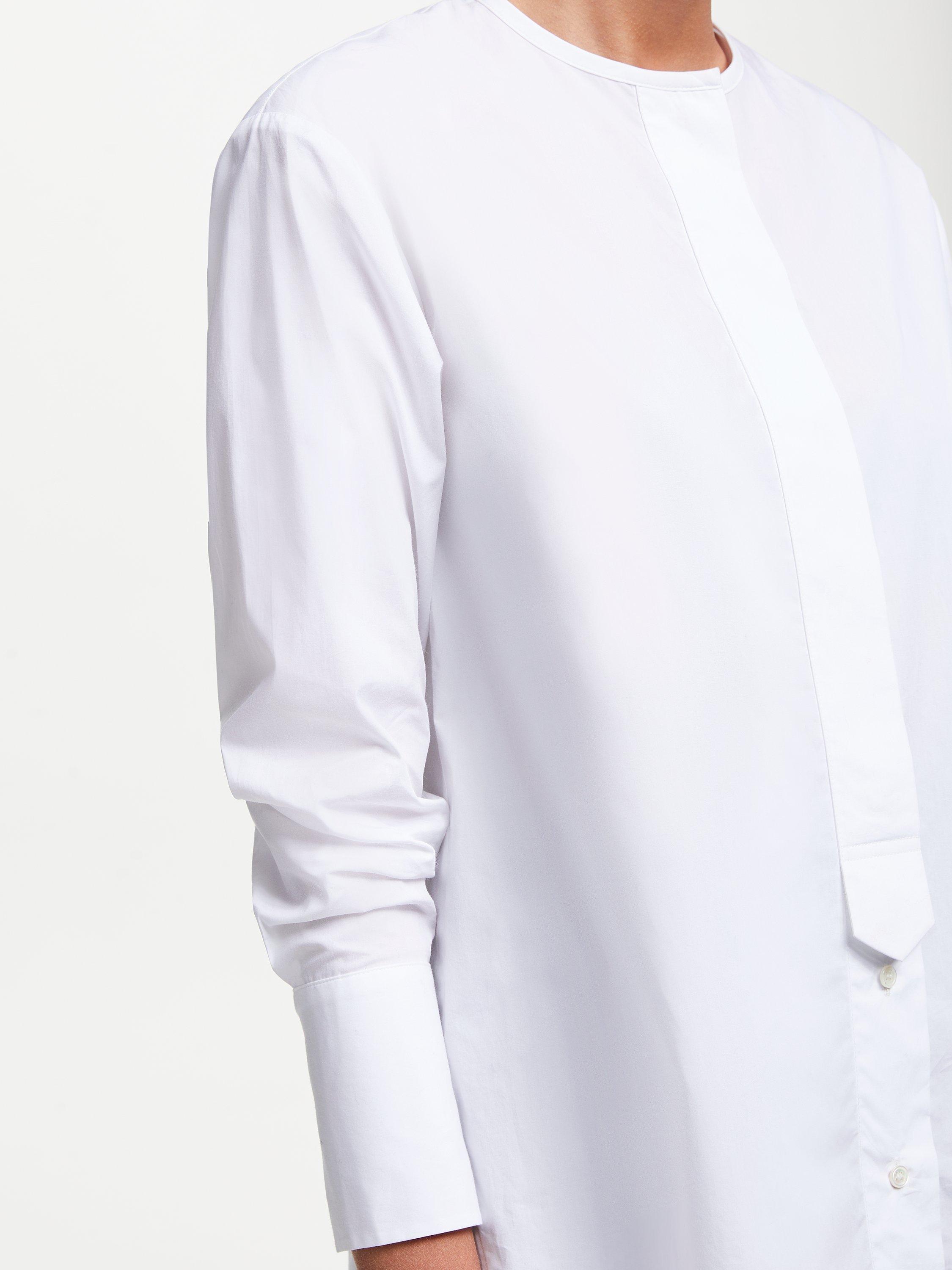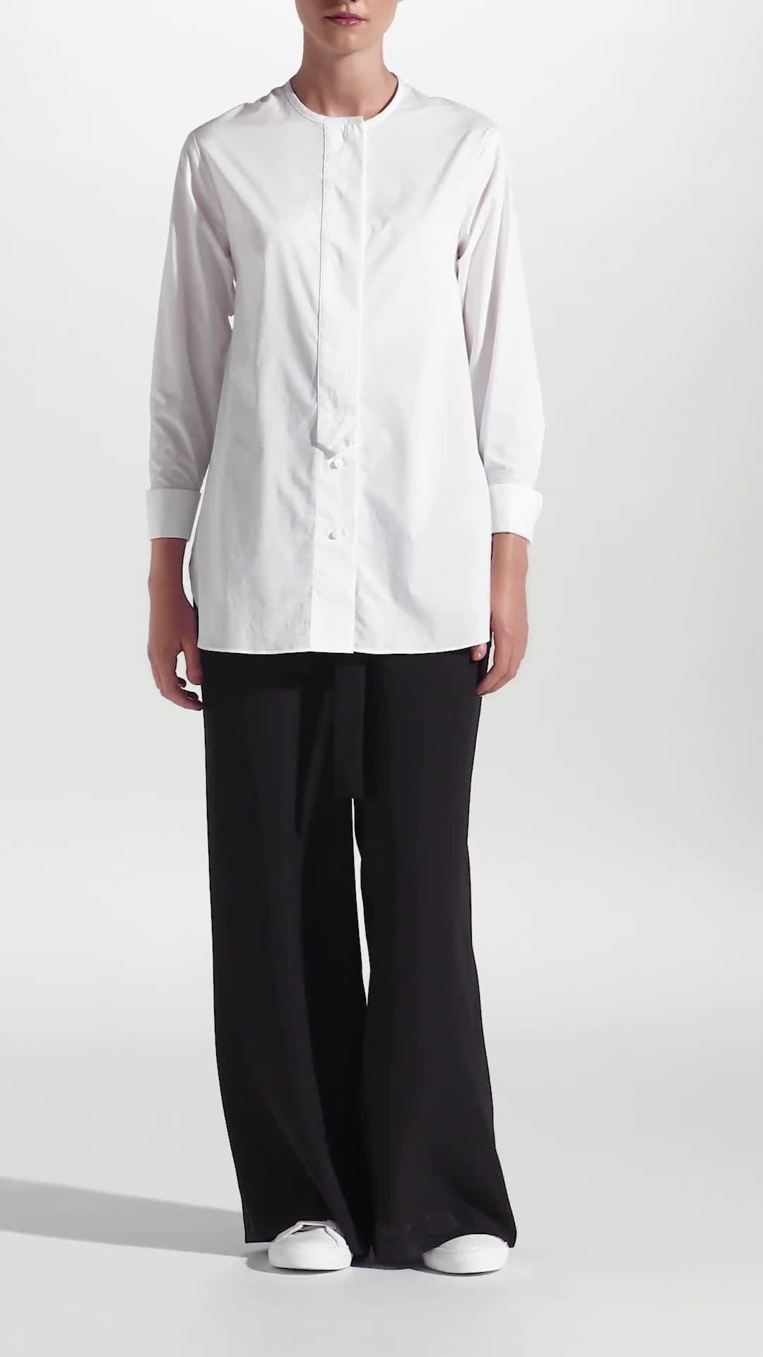 An ageless piece, we've refreshed the traditional shirt to create a versatile offer that works any day of the week. Collarless and with a half-concealed placket and tab detail exuding femininity, the longer line line cut assures a modern look that can be styled long or can be tucked in.