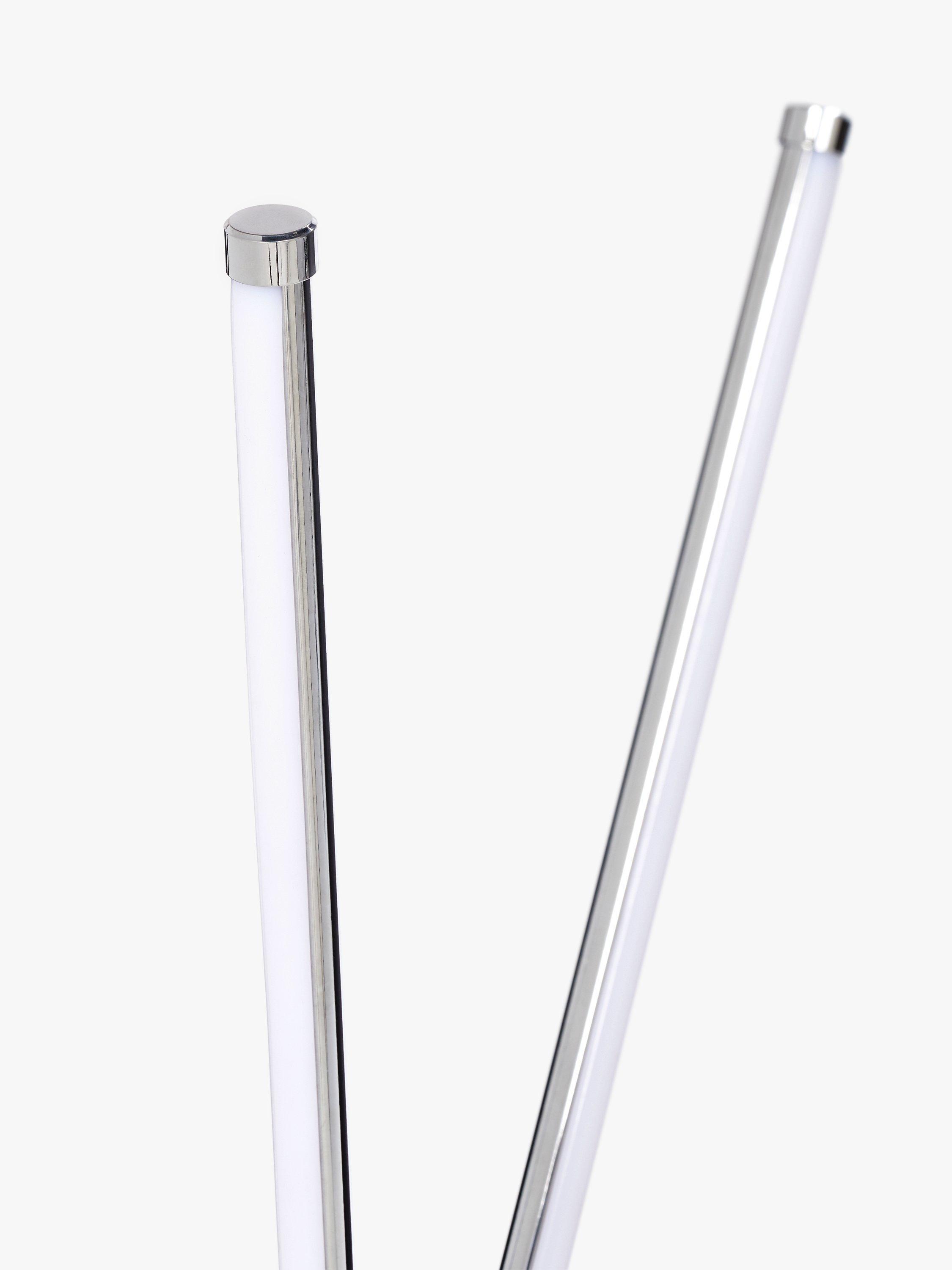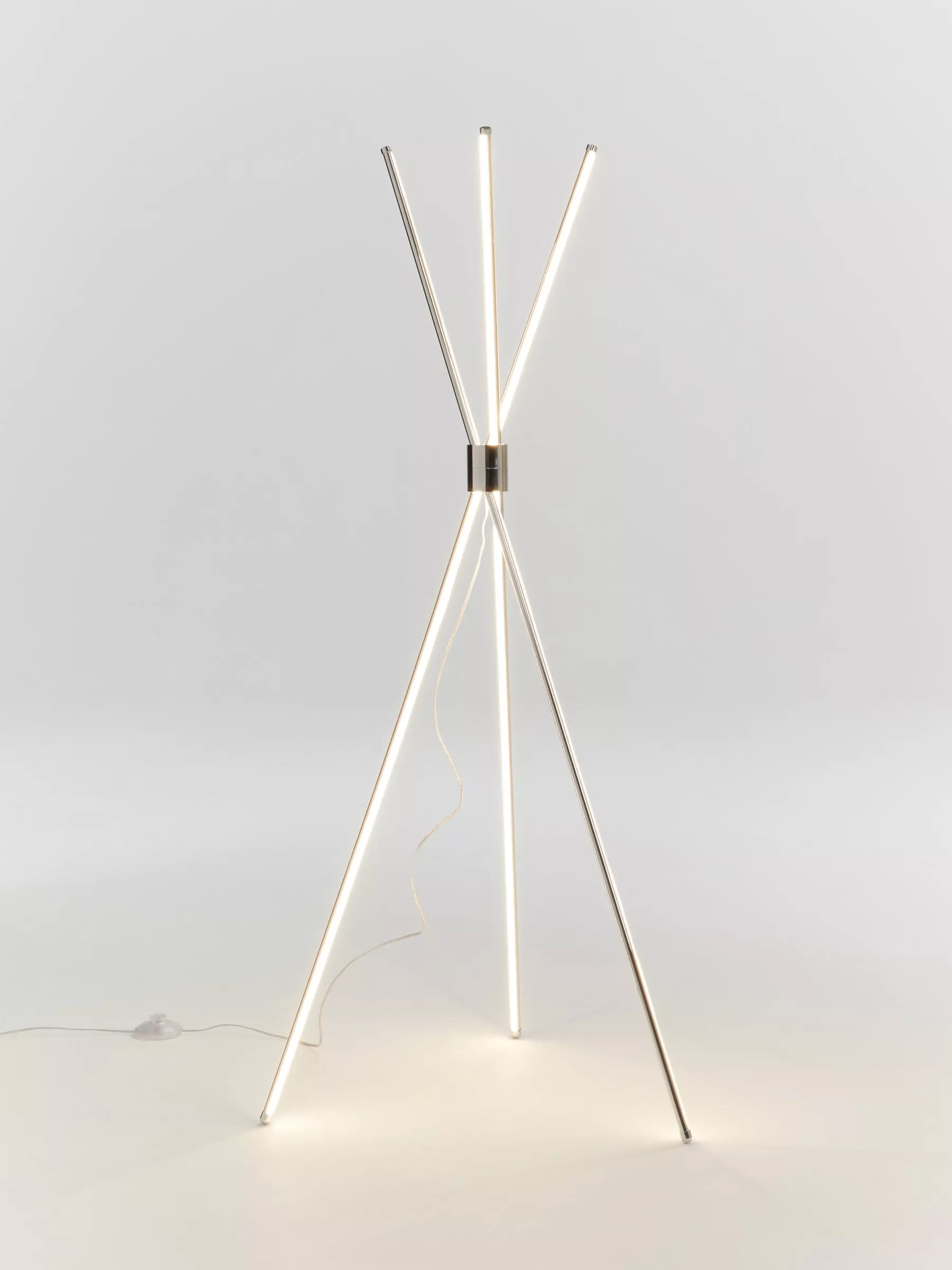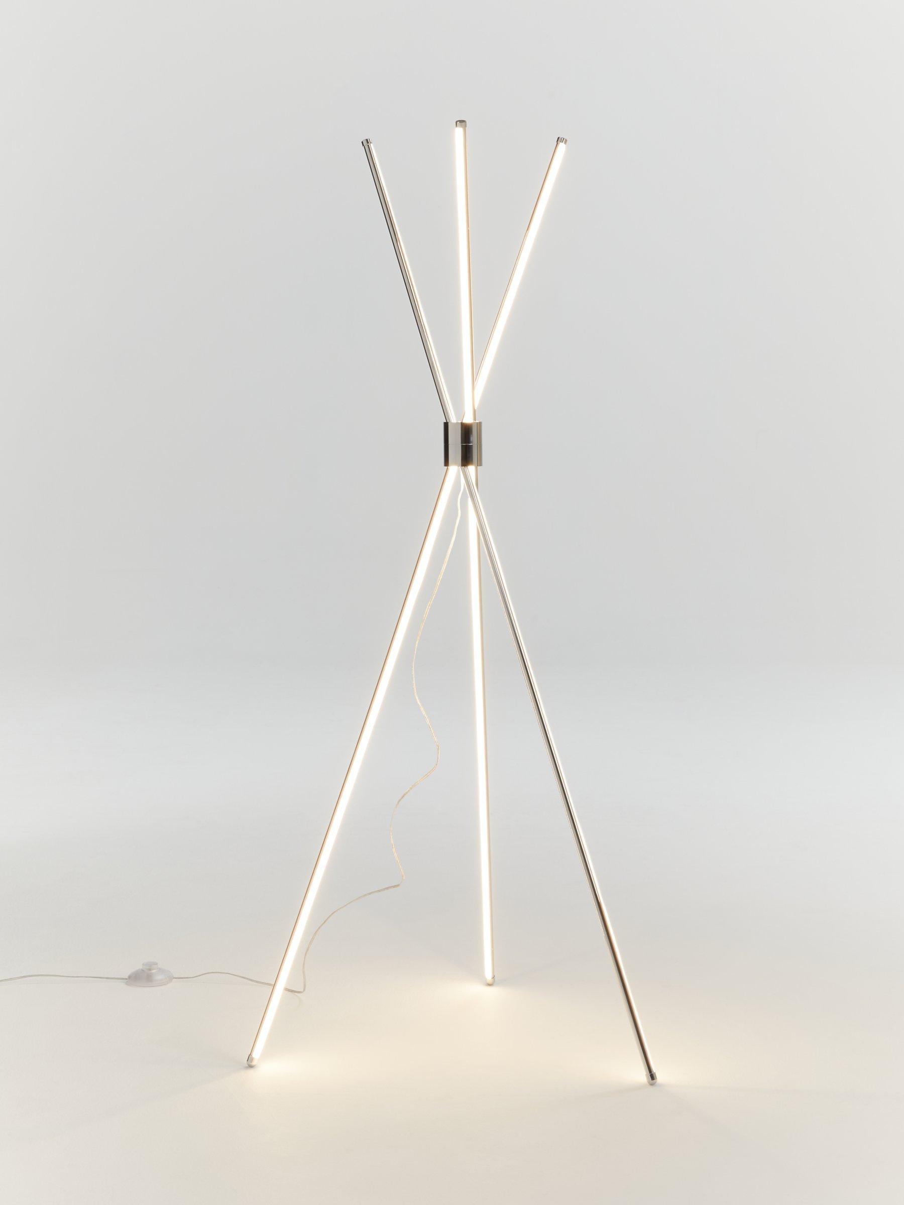 The Wigwam floor lamp has a eclectic, contemporary design that offers a dramatic style to any room. Featuring an integrated LED module within each leg of its three-rod design, its minimalist frame provides a bright wash of clear, white light.